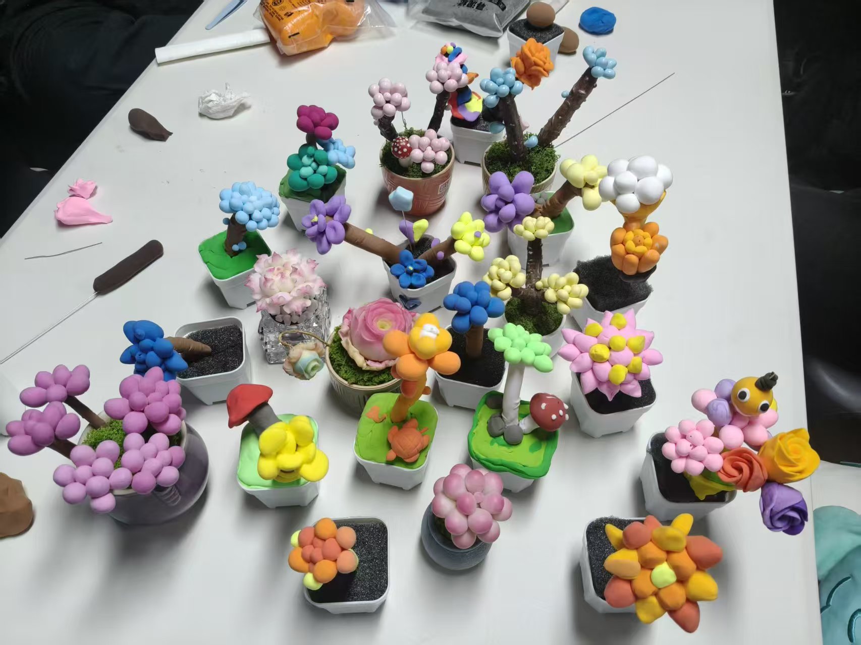 同学们从最初的手法生疏到逐渐熟练,创作热情高涨。一位同学在项目负责人谷秀芹的帮助下,成功将几片略显呆板的叶片调整得错落有致,他欣喜地分享:“原来只是微调一下叶尖的朝向,整个多肉的神态就完全不一样了!”在亲密互动与合作中,一盆盆栩栩如生的黏土多肉作品逐渐成型,每一处纹理、每一片叶片都凝聚着师生共同的巧思与对生命韧性的理解。
