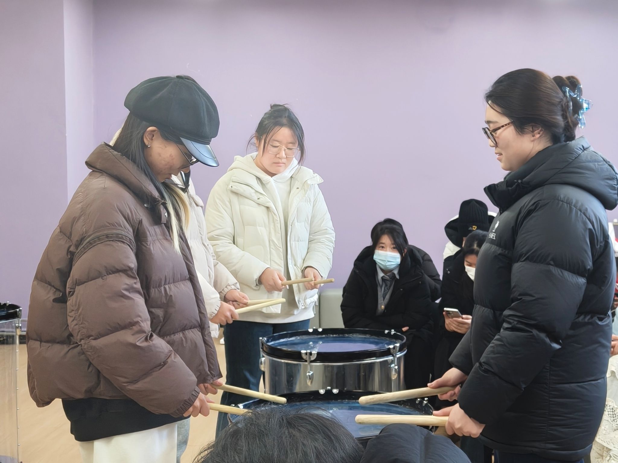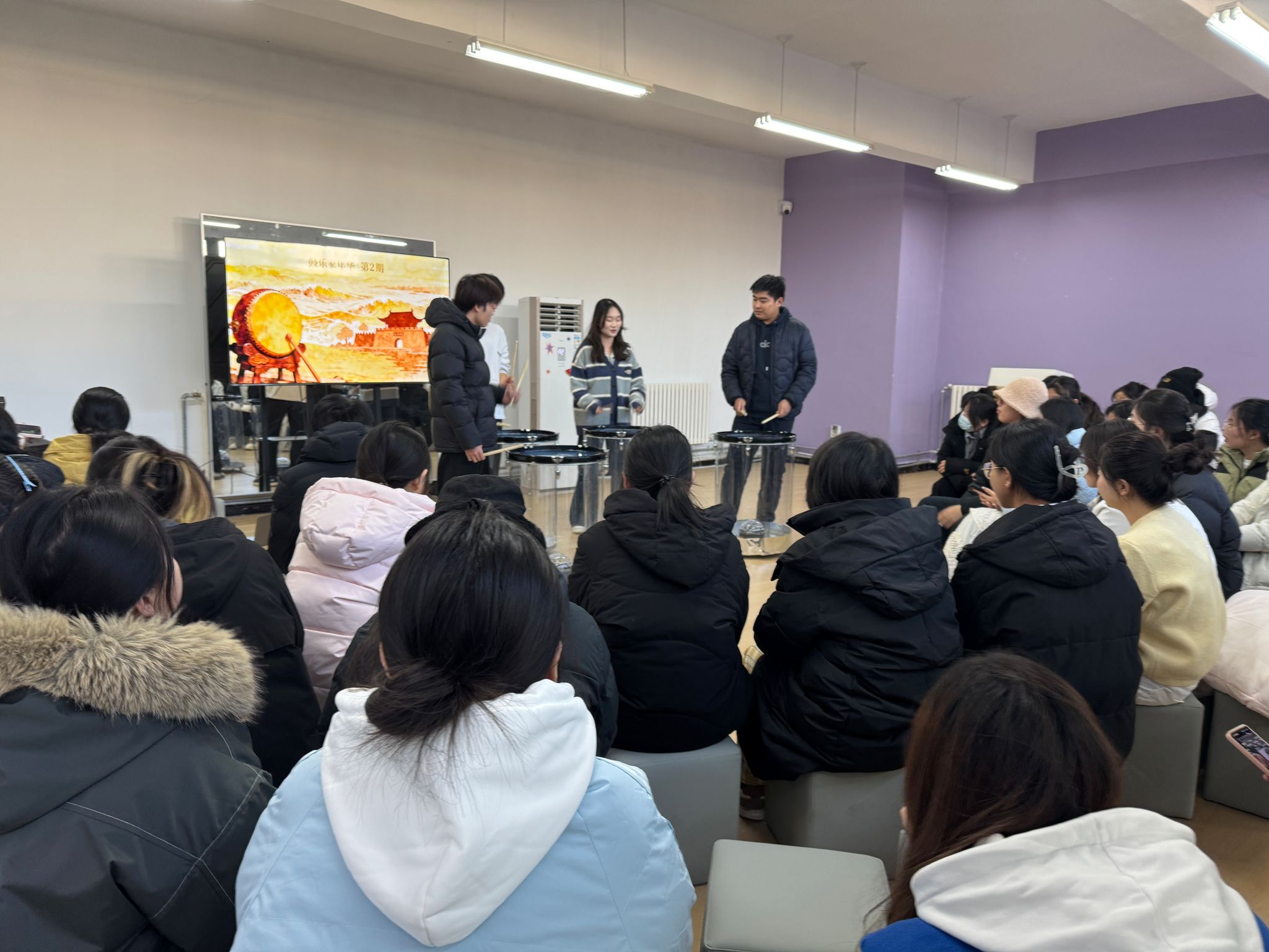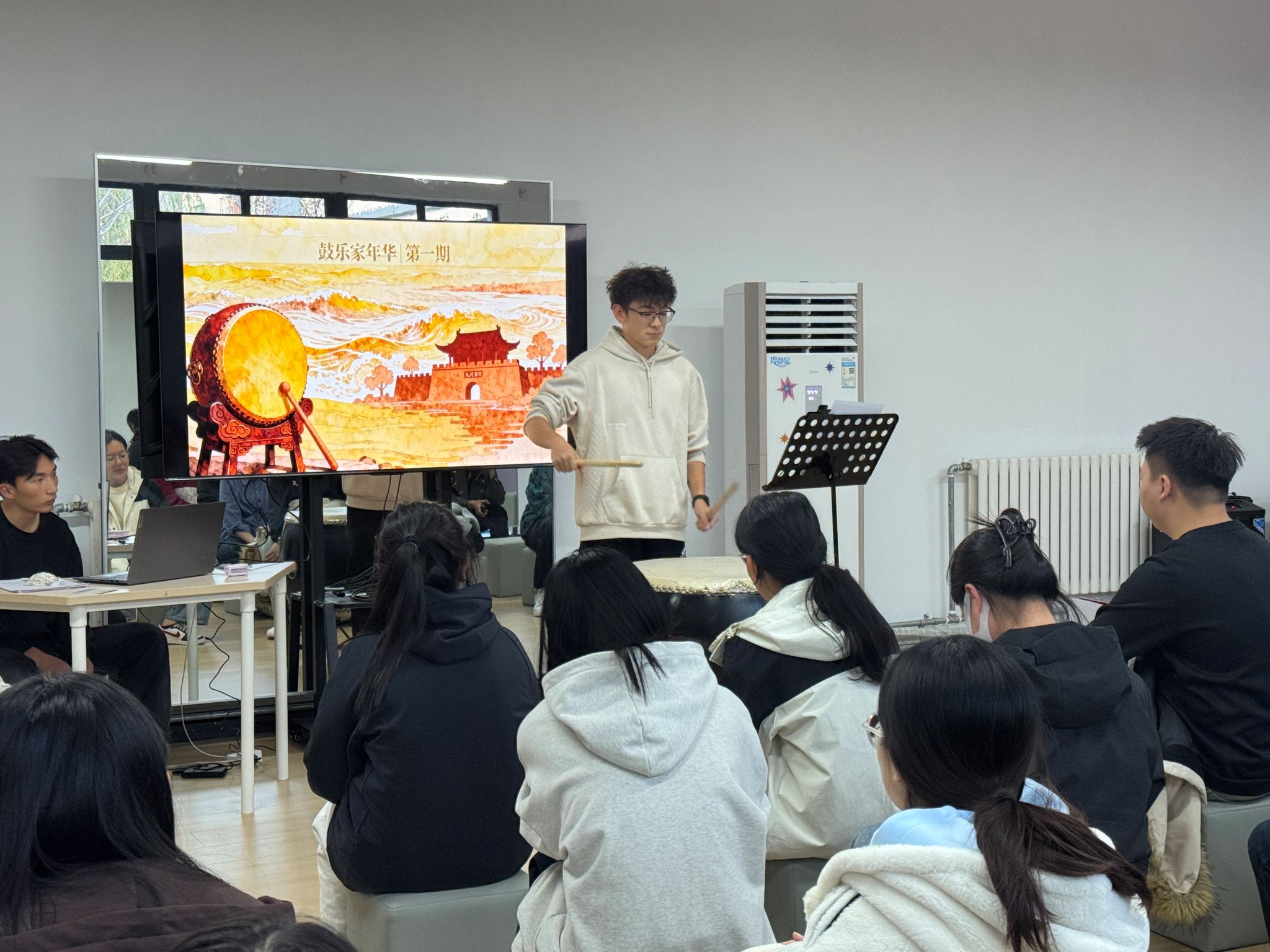12月3日下午两点半,九河书院112活动室内,一段铿锵有力的鼓声划破了午后的宁静。随着节奏逐渐加快,越来越多的学生从走廊聚集到门口,探身向内张望。这是岳儿鼓工坊常态化品牌活动《鼓岳家年华》第二期的现场——一个看似普通的校园文化活动,却成为了传统艺术与当代青年对话的生动课堂。