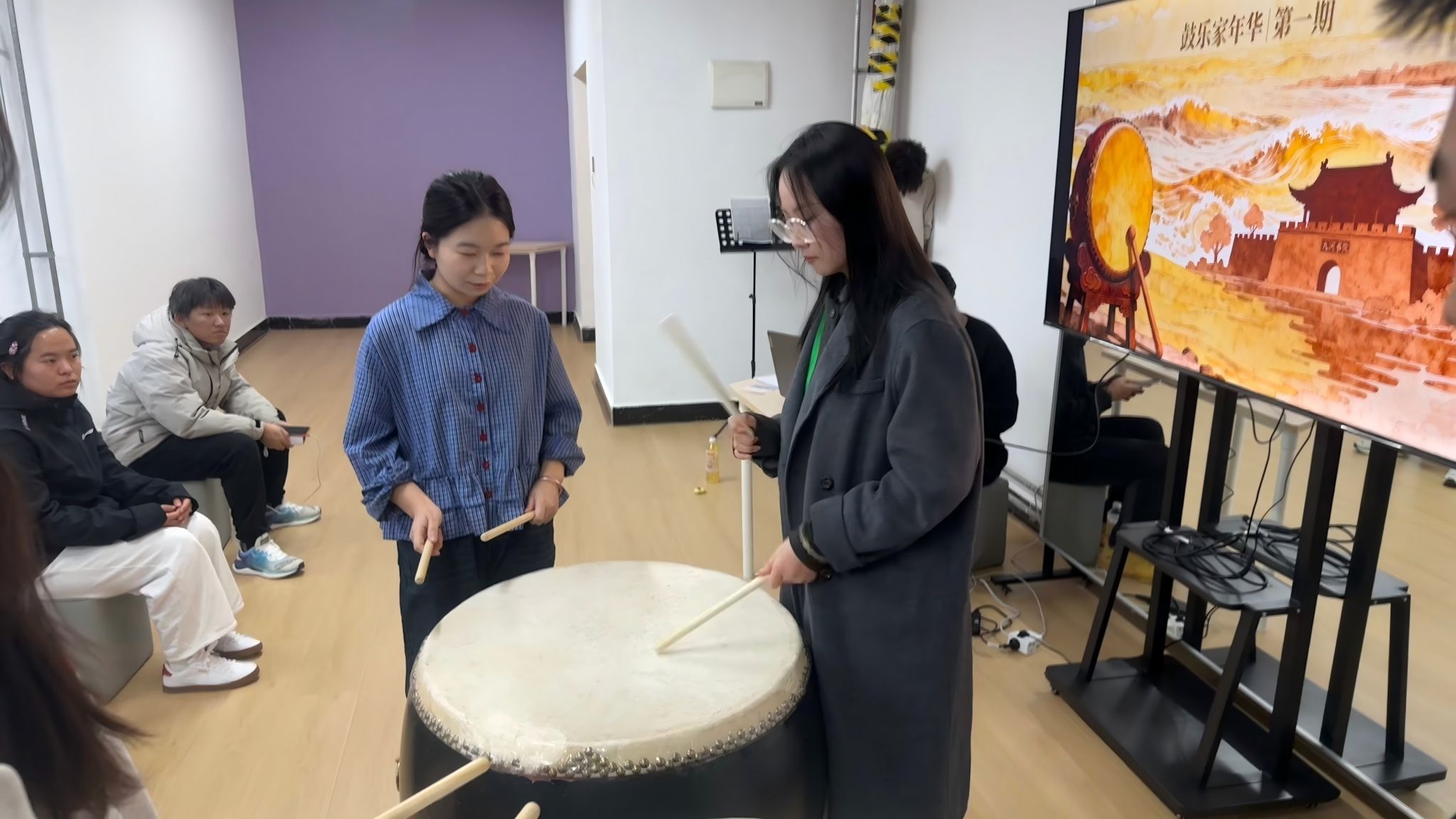 活动现场,两名女生的表现引起了指导老师付赛的注意。从开场时专注的眼神,到互动环节毫不犹豫举起的双手,再到执槌击鼓时那坚定而有力的动作,她们用行动诠释了当代年轻人对传统文化的态度转变。