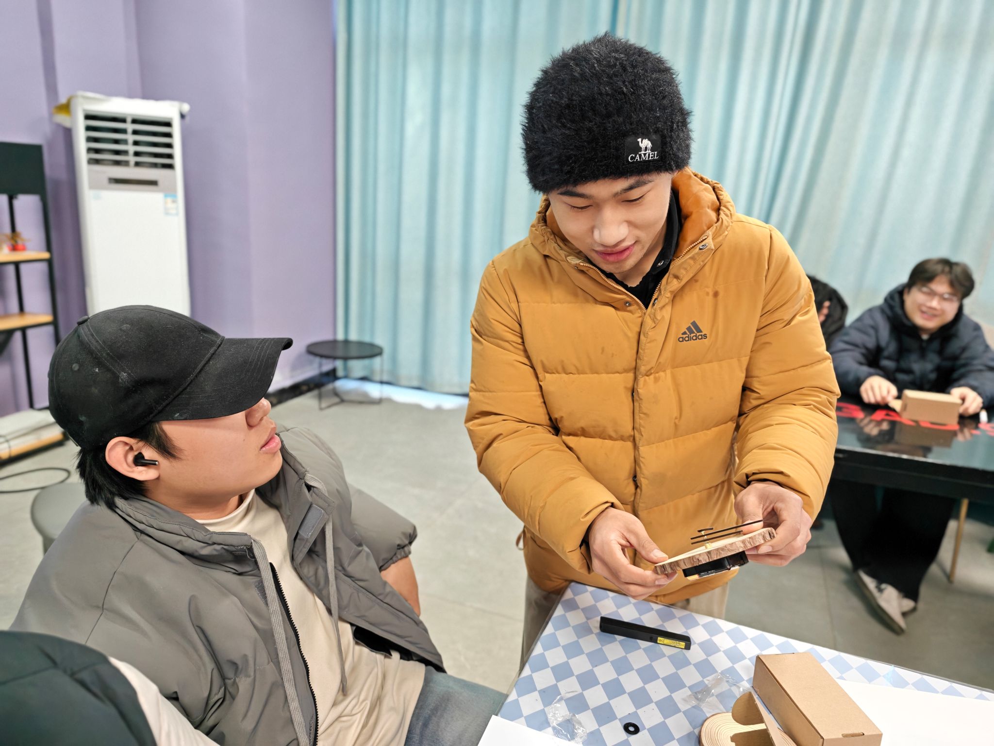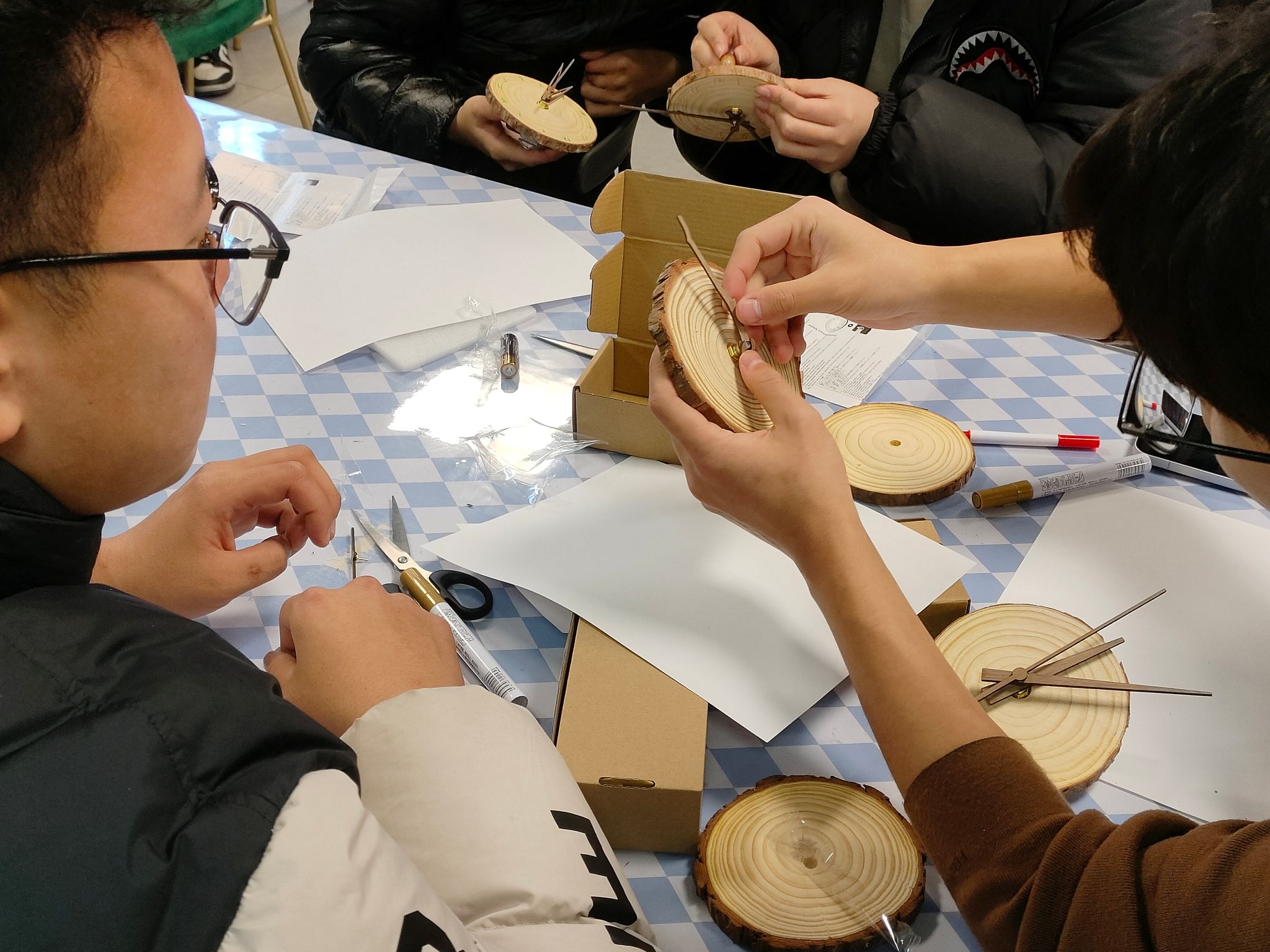 理论讲解一结束,热闹的动手实践环节即刻开启!同学们纷纷投入创作,大家严格遵循讲解步骤,小心翼翼地钻孔、精准标记刻度,有条不紊地安装机芯与指针,神情中满是对成品的期待。制作过程中,创意火花不断迸发:有人在刻度设计中融入动漫元素,让数字标记更具专属感;有人相互探讨安装技巧,齐心协力攻克机芯固定、指针校准等小难题,现场互动融洽。李程坤也在同学们中间来回穿梭,结合演讲知识点实时答疑,耐心指导大家规范操作,全力保障每位参与者都能顺利推进制作。