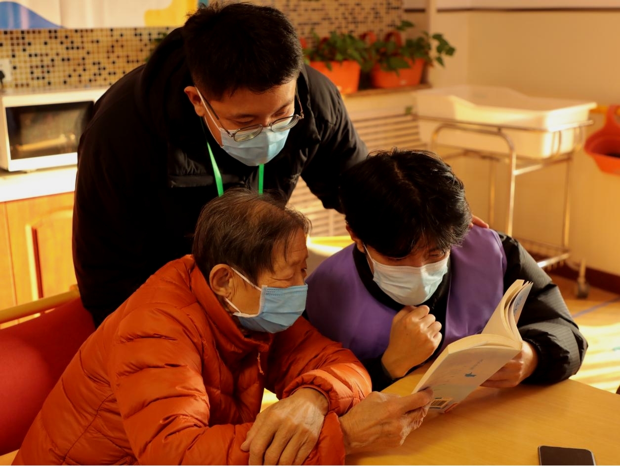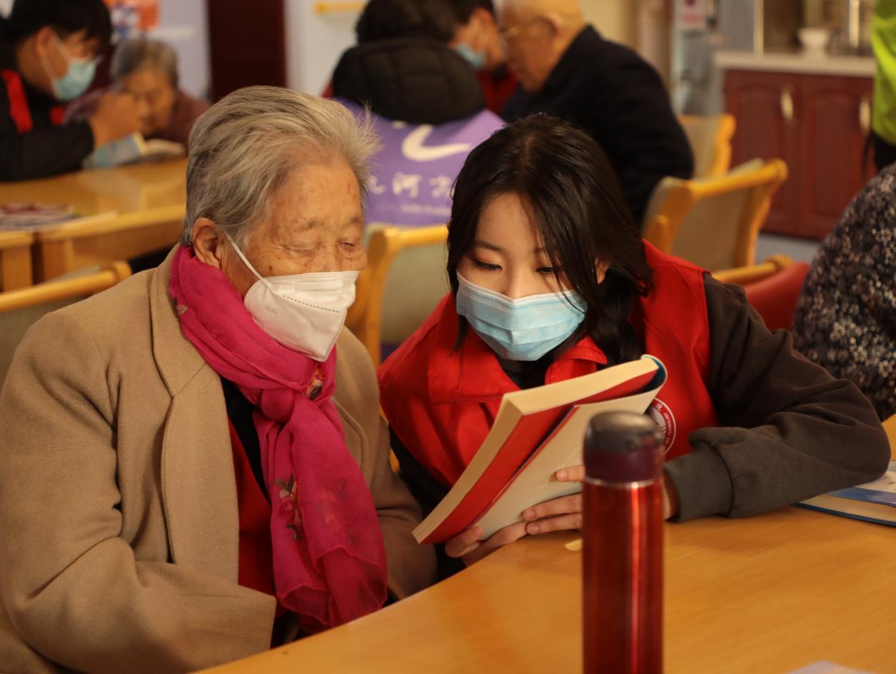 医养中心的活动室里暖意融融,志愿者们将精心挑选的书籍整齐摆放在木质桌面上,封面在阳光下泛着柔和的光。爷爷奶奶们陆续入座,目光不自觉地落在书页上,刚坐下便拿起书轻轻翻阅,还主动拉过身边的志愿者,指着感兴趣的段落轻声交流:“这书我以前好像看过,就是记不太清细节了”“孩子,这个活动好,我平时喜欢看报纸,看到你们带书过来我很高兴。”指尖划过纸页的轻响、细碎的交谈声交织在一起,提前奏响了跨代共读的温馨序曲。
