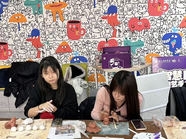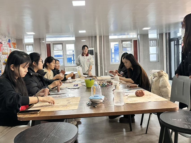 另一边的捏陶艺区域则更显惬意,同学们或独自静坐,或三五成群,取一块陶土随意揉捏。有人仔细雕琢着小动物摆件,有人用心塑造着专属的小饰品,还有人发挥想象力创作着抽象的造型。大家沉浸在自己的创作世界里,时而交流技巧,时而分享灵感,现场氛围轻松又愉悦。一位参与捏陶艺的同学表示:“不用追求完美的形态,就是跟着自己的感觉来,这种无拘无束的创作方式特别解压,很喜欢这样的活动。”