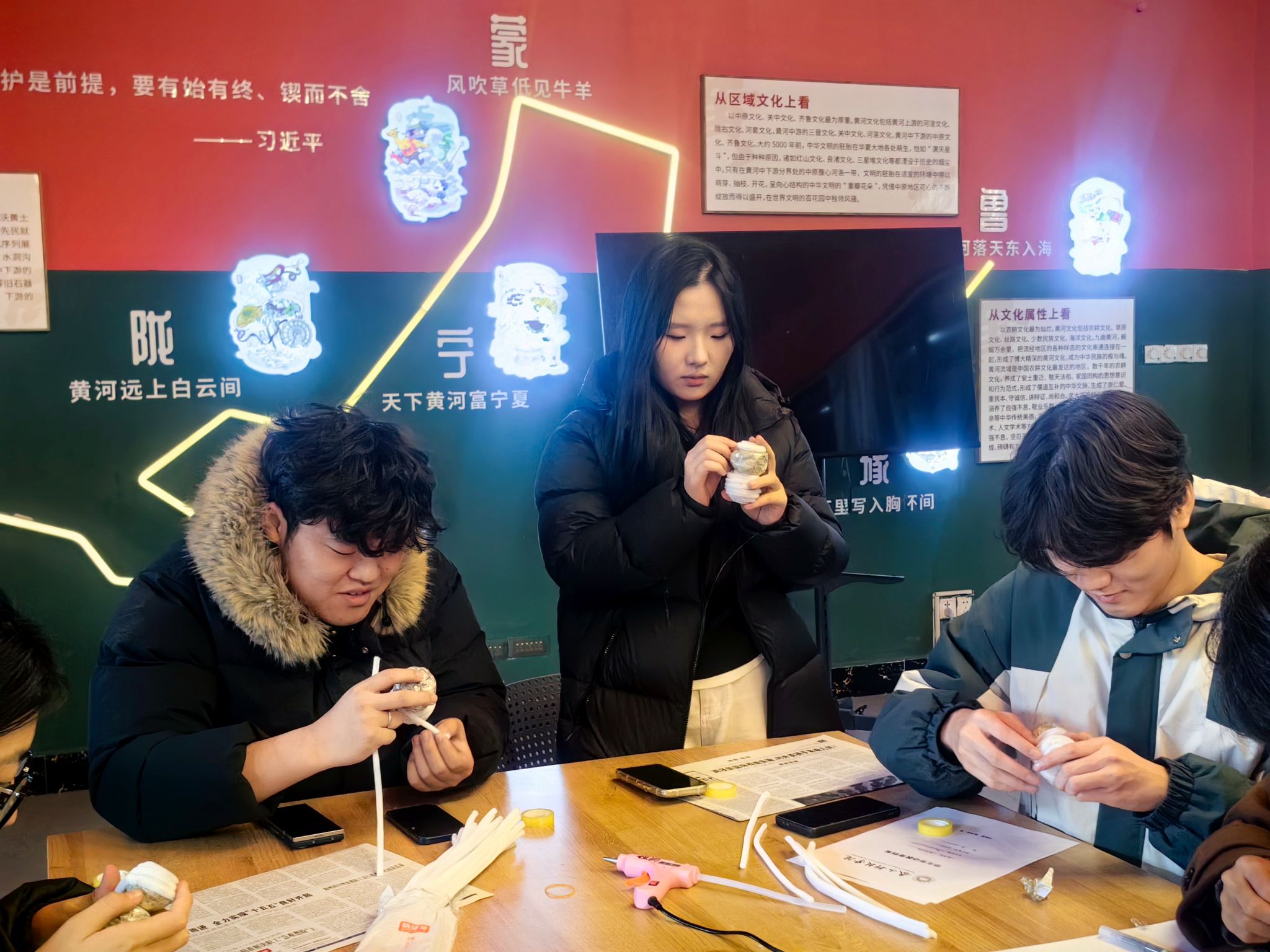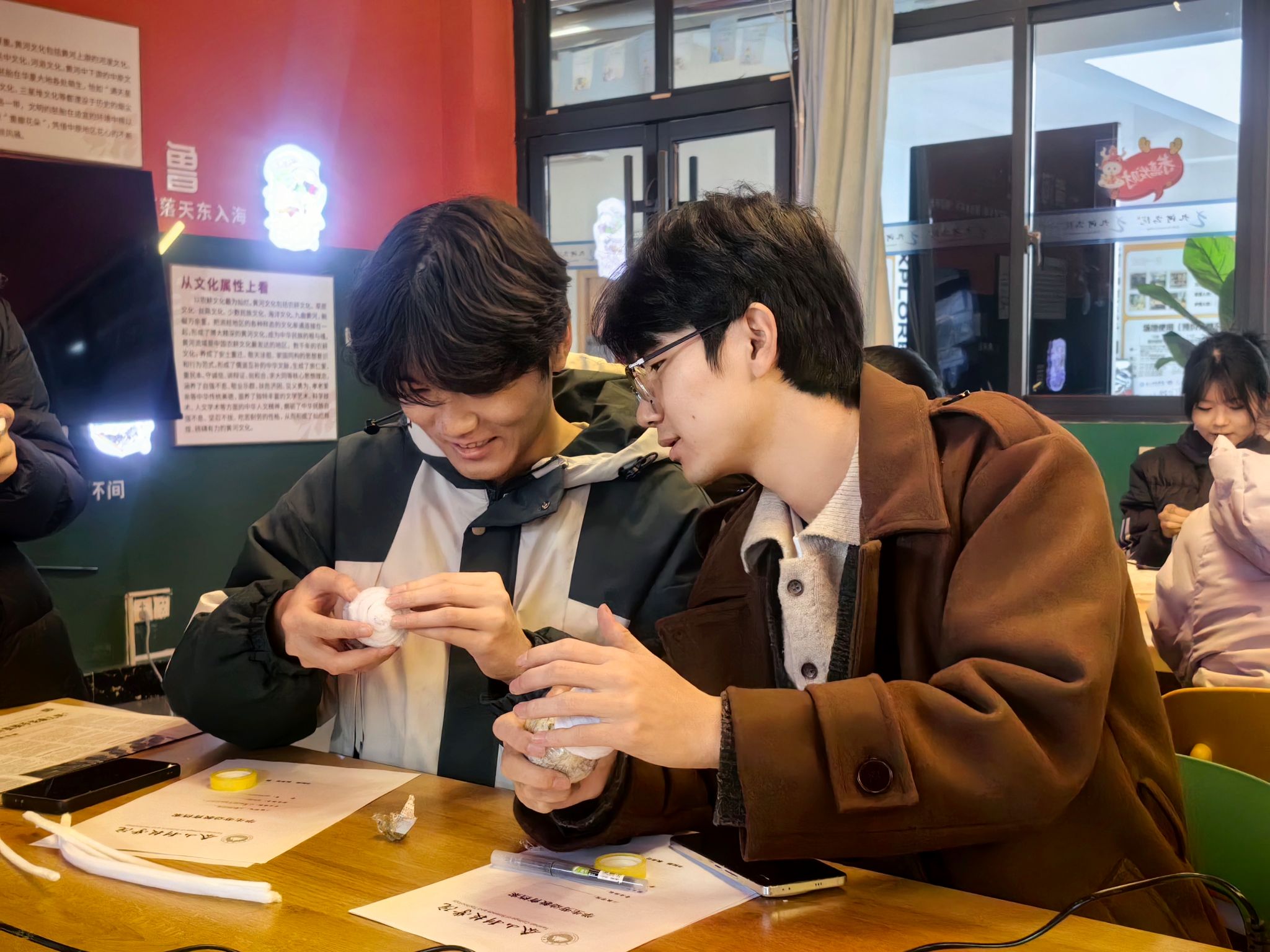 工坊成员与指导老师穿行其间,提供的不只是技术支援,更有对创作过程的陪伴与鼓励。“没想到做手工这么解压,好像把心里的纷乱都捋顺了。”魏云翔同学与旁边同学分享。许多人都表示,在期末繁忙的节奏中,这两小时的专注创造如同一段有效的“心理间歇”,让他们在成就感的滋养中恢复了平静与能量。