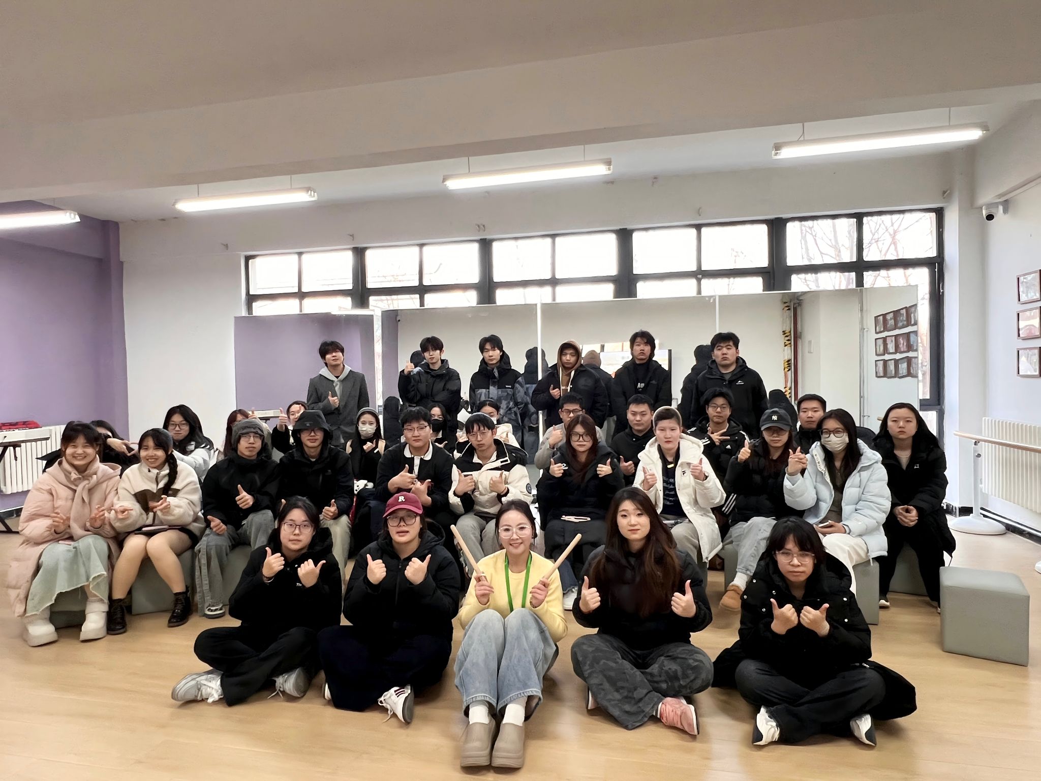 “手腕放松,用这里发力!”“对,就是这个感觉!”鼓励与指导声此起彼伏。起初生疏的“咚、咚”声,逐渐开始有了节奏的雏形。尽管手法稚嫩,但每个人脸上都写满了新奇与专注。教室里鼓声、笑声、交流声汇成一片,热闹非凡。