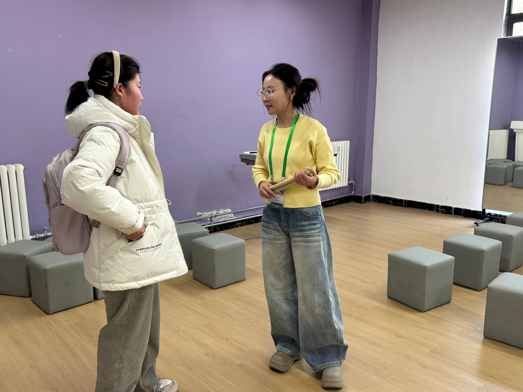 热情不能只停留在扫码。在工坊成员们的带领下,一场迷你体验课就地展开。新加入的同学们接过鼓槌,在指导老师付赛“一对一”的指导下,从最基础的握槌、击打姿势学起。