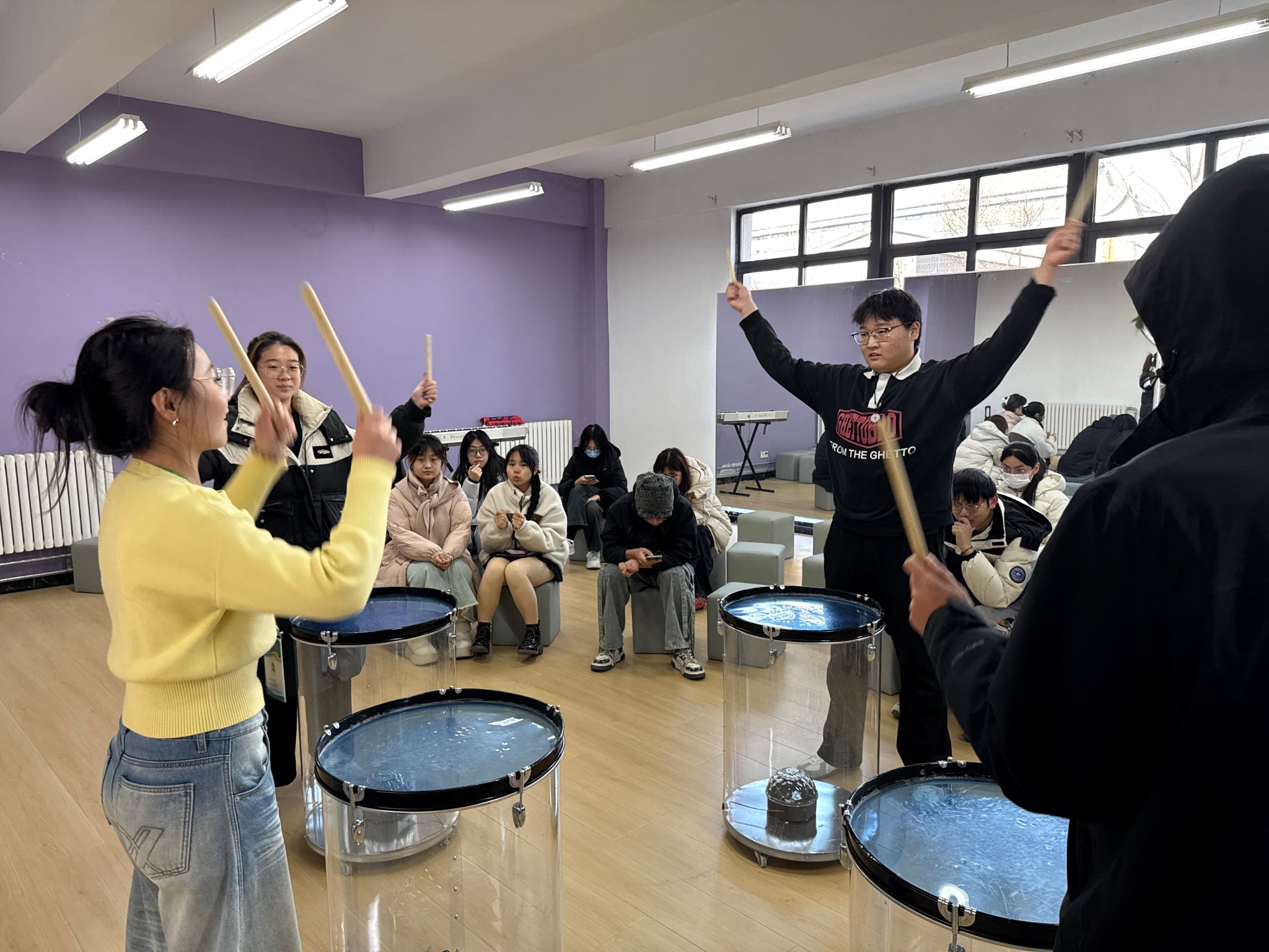 活动在意犹未尽中走向尾声。当预告下次活动时间的声音响起,不少同学仍围着鼓和成员们请教,不舍得离开。