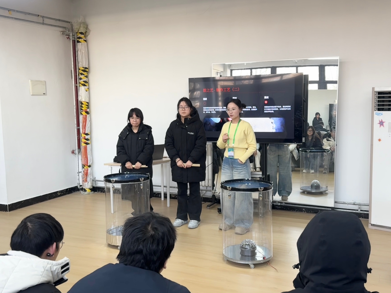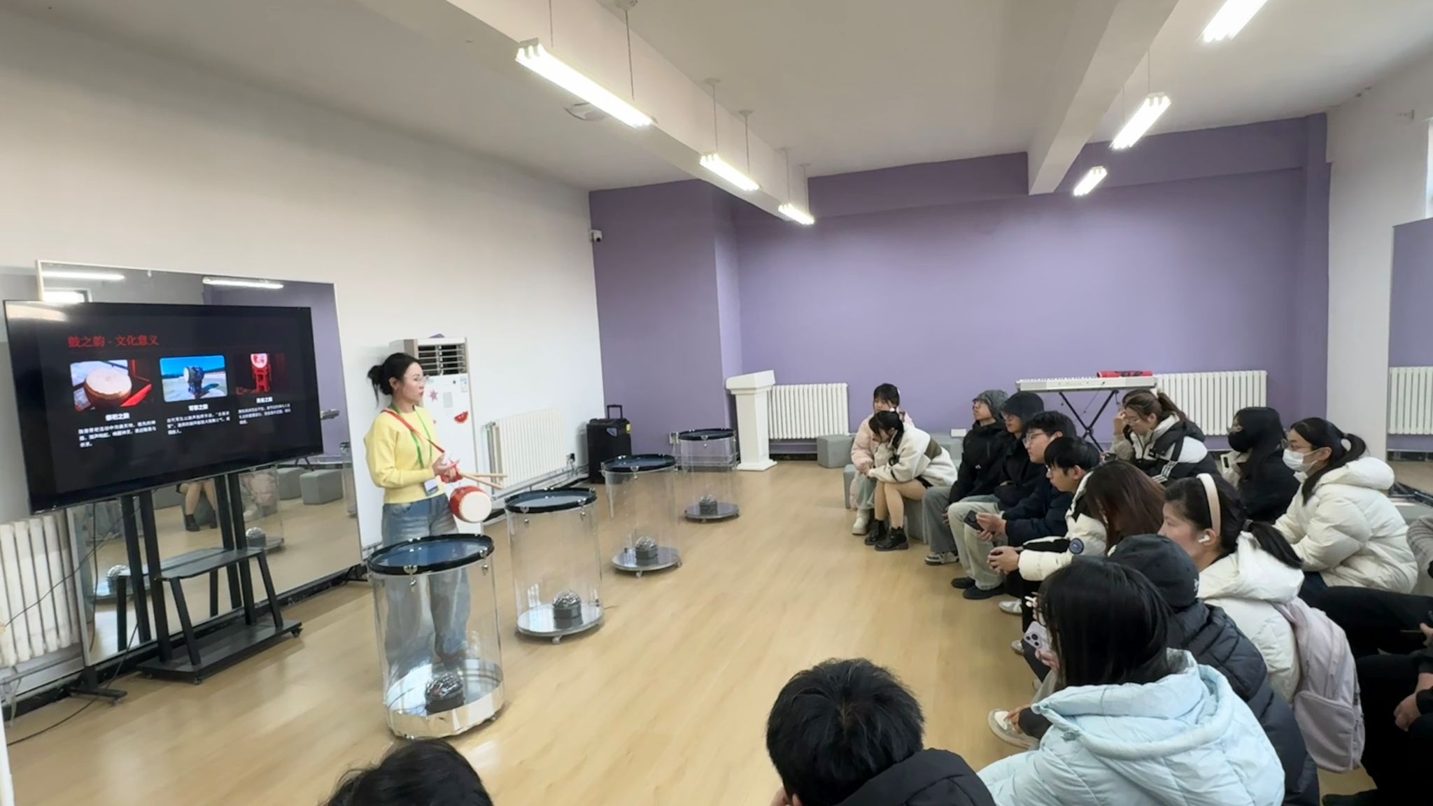 她重点介绍了正在推进的“一师一品”课题——“非遗鼓乐活态传承计划”。“传承,不是原封不动地复制老古董。”付赛老师指着屏幕上传统的鼓乐表演画面,又切换到融入现代编舞与节奏的原创作品,同时手扶着腰鼓的鼓身,让大家对眼前的鼓种有了更直观的感受。“比如,在传统技法中加入更具表现力的肢体动作,让鼓不仅是‘听’的艺术,也是‘看’的艺术。元素丰富了,吸引力自然就来了。我们鼓励一切让鼓乐‘活’在当下、连接青年的创新尝试。”
