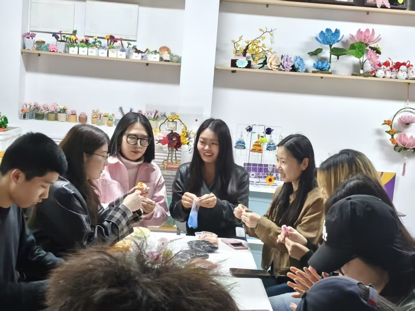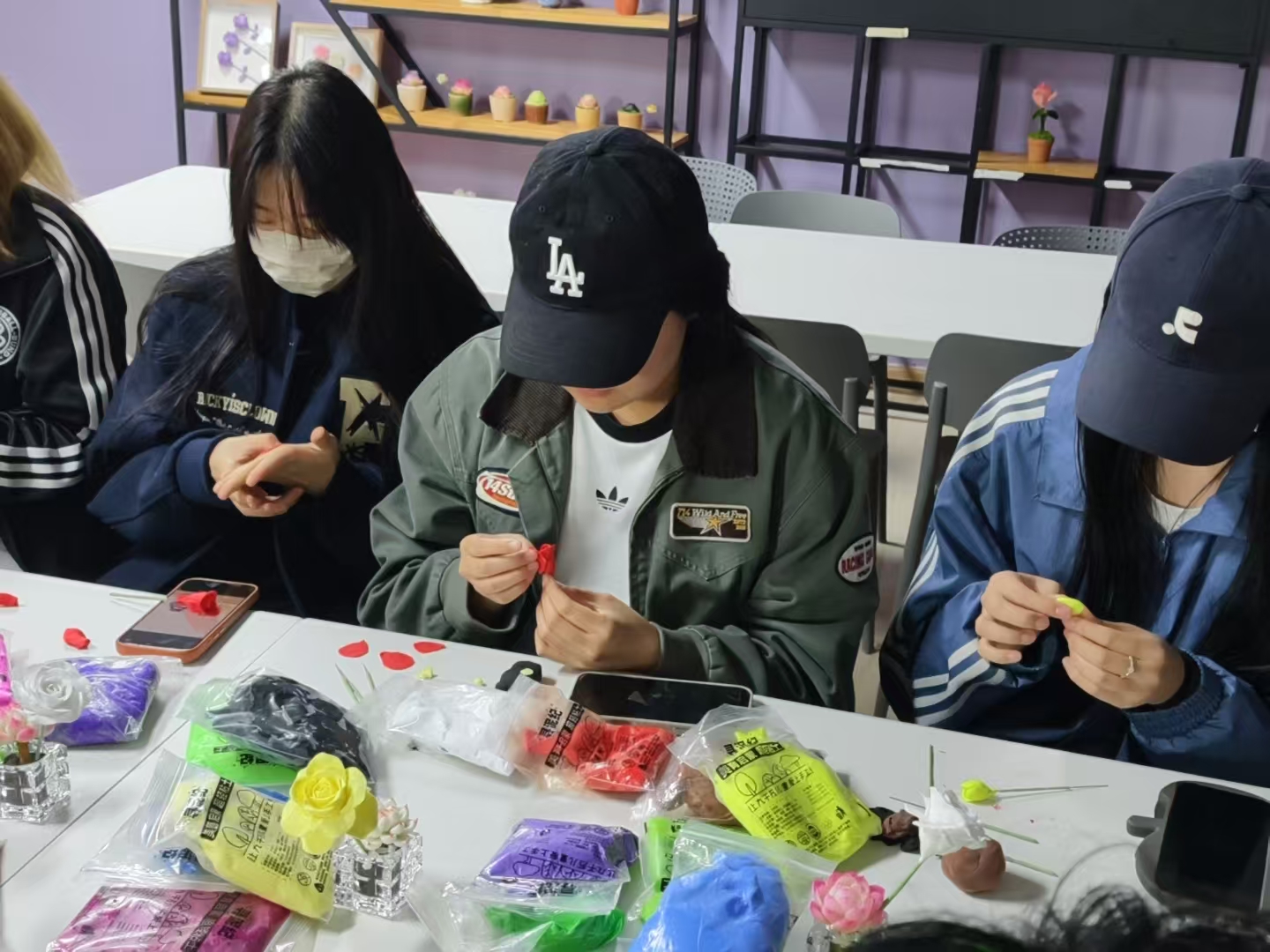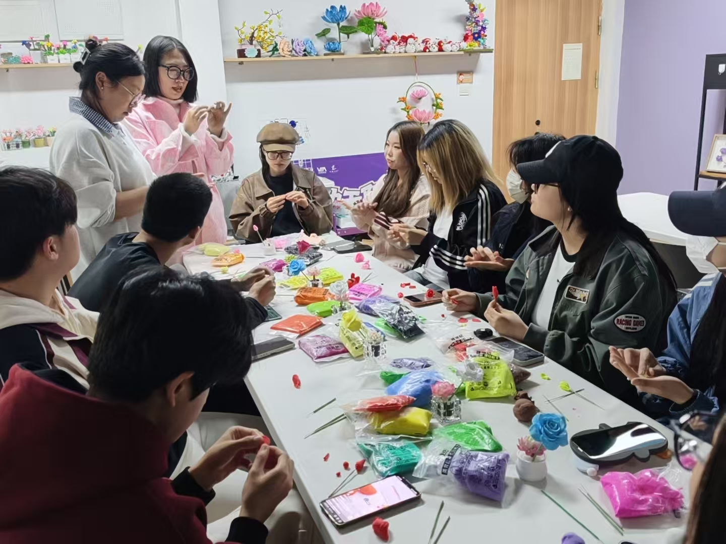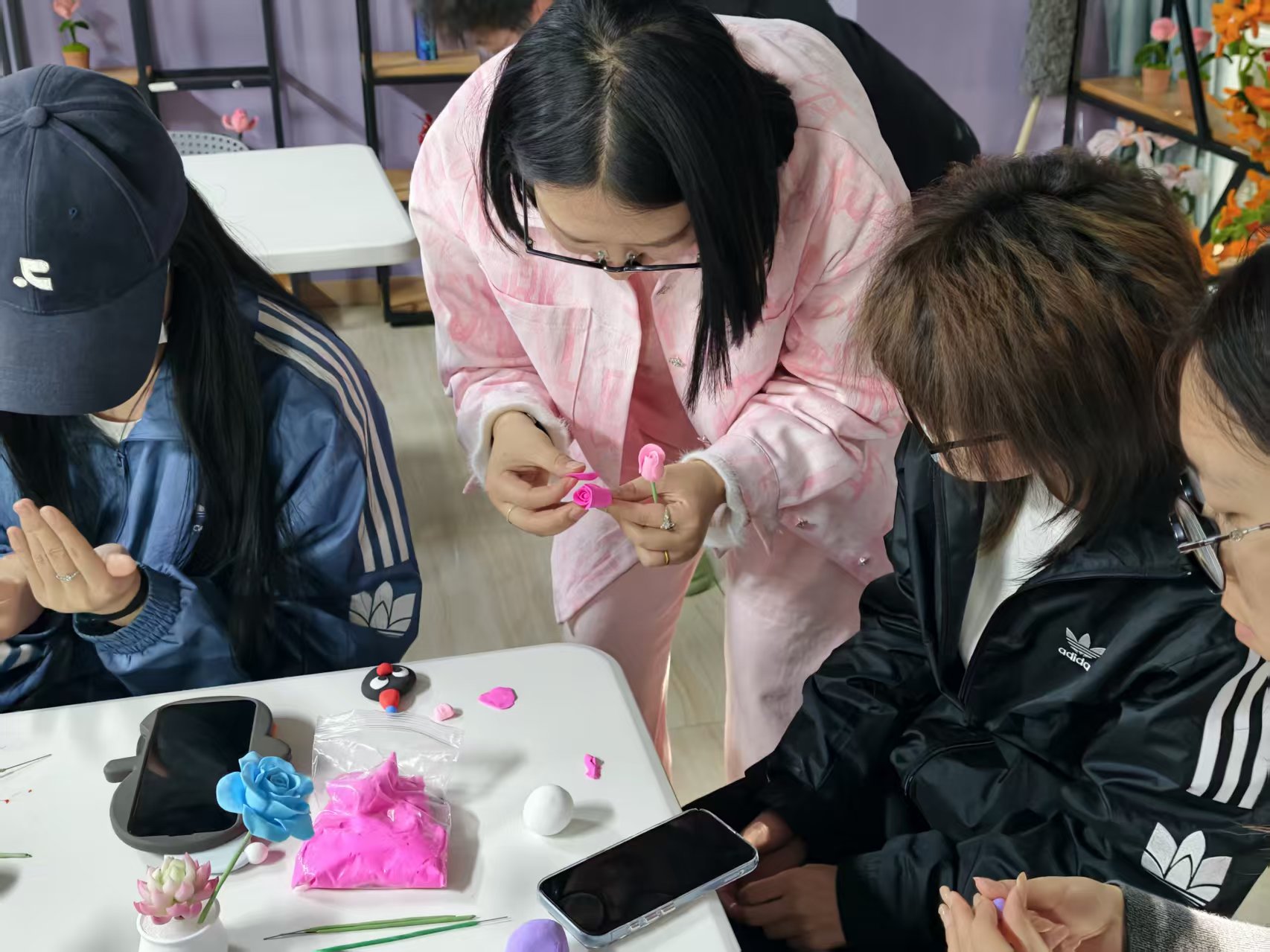 随后的黏土创作环节成为活动的核心高光。郑栋赟导师与工坊负责人谷秀芹、王赫岑、路镇坤分组指导,将专业技巧化作通俗易懂的创作要领,耐心传递给每一位学子。“捏塑玫瑰花瓣时,要先揉出黏土的柔软弧度,再轻轻收拢边缘,模拟真实花瓣自然舒展的形态;搭配多肉叶片时,需错落堆叠,把控好叶片的厚度与间距,还原多肉植物饱满的生长层次。”老师们一边现场示范,一边细致拆解要点,从花瓣塑形、花茎组装,到多肉叶片点缀、纹理刻画,每一个环节都耐心讲解。针对学子们提出的“黏土塑形易变形”“花瓣衔接不自然”等问题,老师们逐一给出实用技巧:“捏花瓣时力度要轻柔,定型前可轻轻调整弧度;花茎与花瓣衔接处,借助小工具轻压出自然纹路,能让作品更灵动逼真。”