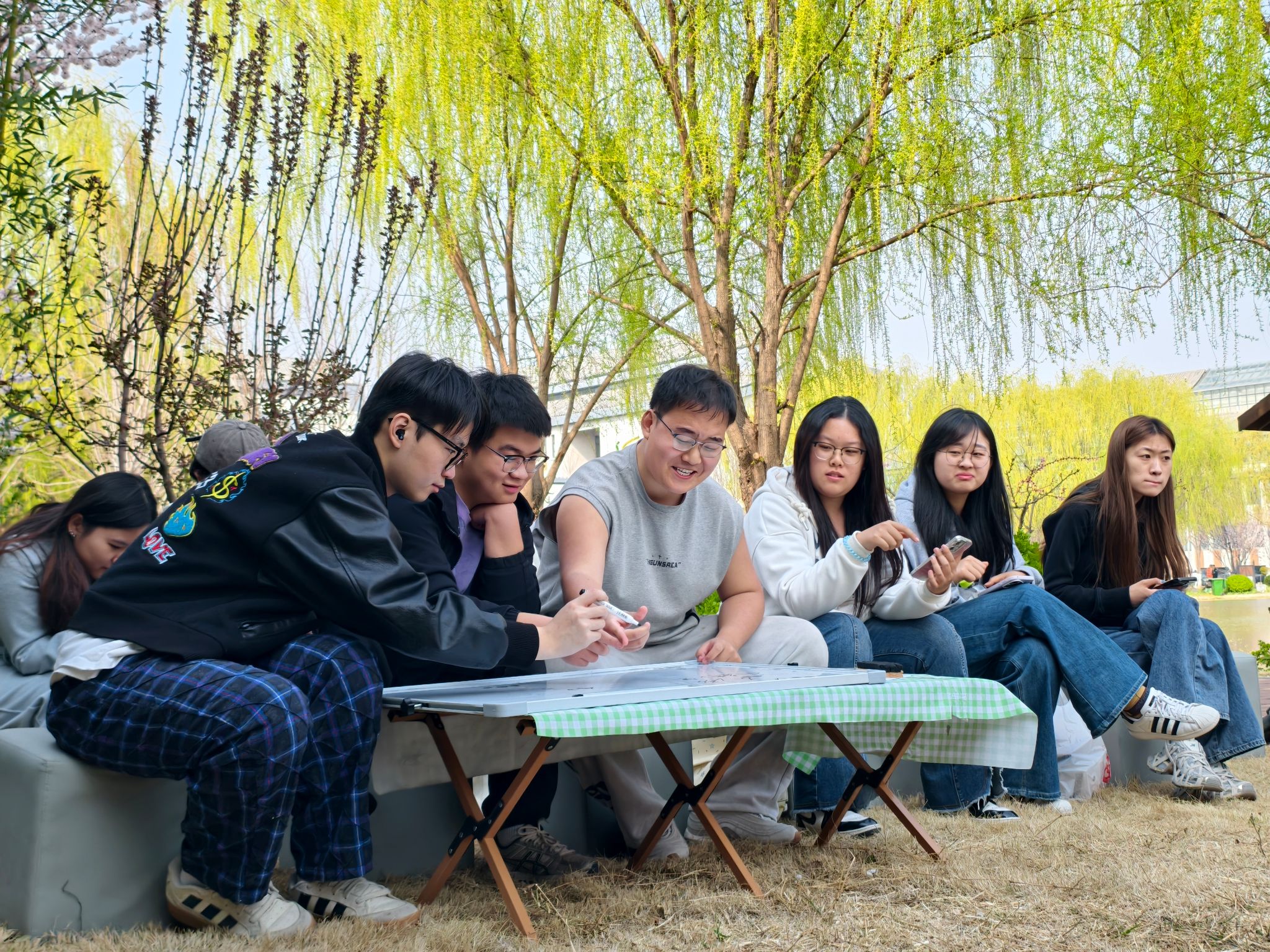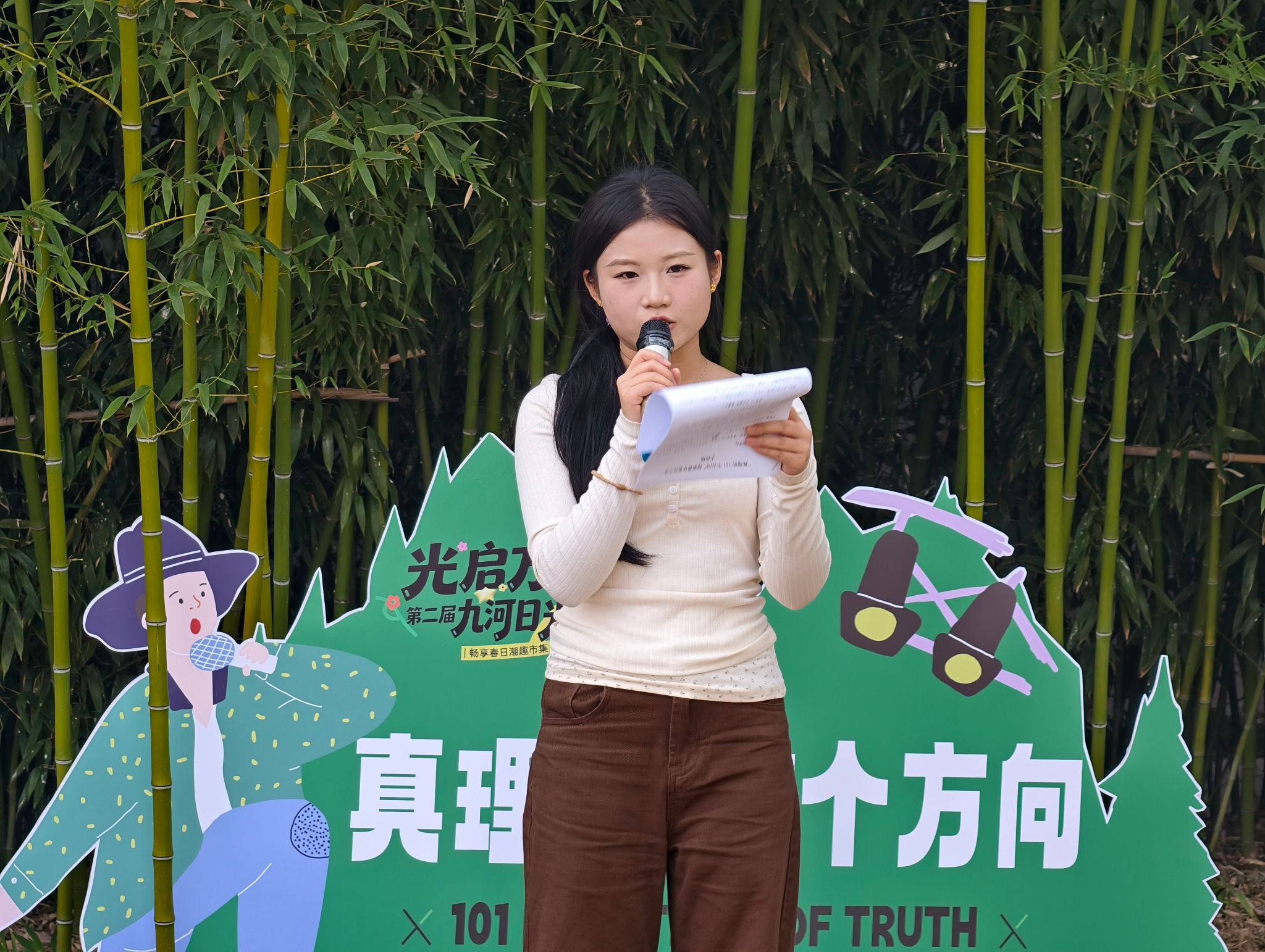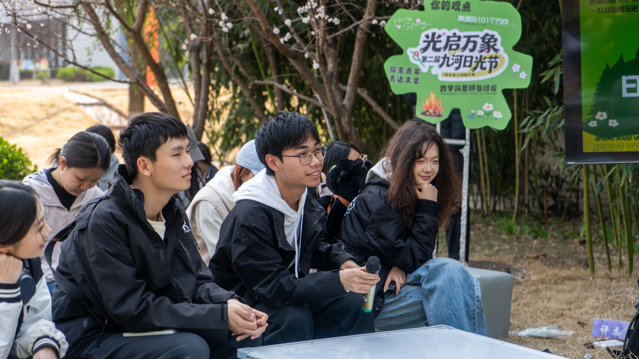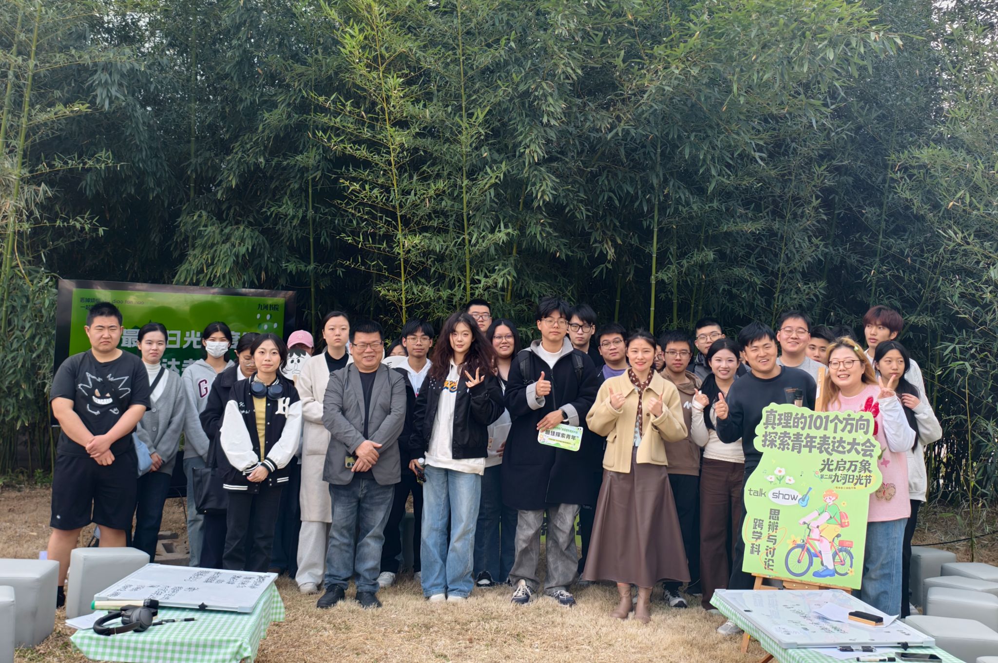 想不想在春日草坪上,来一场轻松又有思想的聊天?3月25日,九河书院镜湖畔的竹林区域迎来了一场别开生面的跨学科思想交融的互动——“真理的101个方向”探索青年表达大会,为大家打造了一个无压力、超自由的思想交流小天地。此次活动也是九河书院支点发展方向:跨学科学术研究与路演交流下的一次重要实践。活动当天,镜湖畔的竹林区域既雅致又充满活力,东岳书院名誉院长张振笋、创意写作学院教师吴海峰与50名师生齐聚一堂,共同见证了这场思想碰撞
