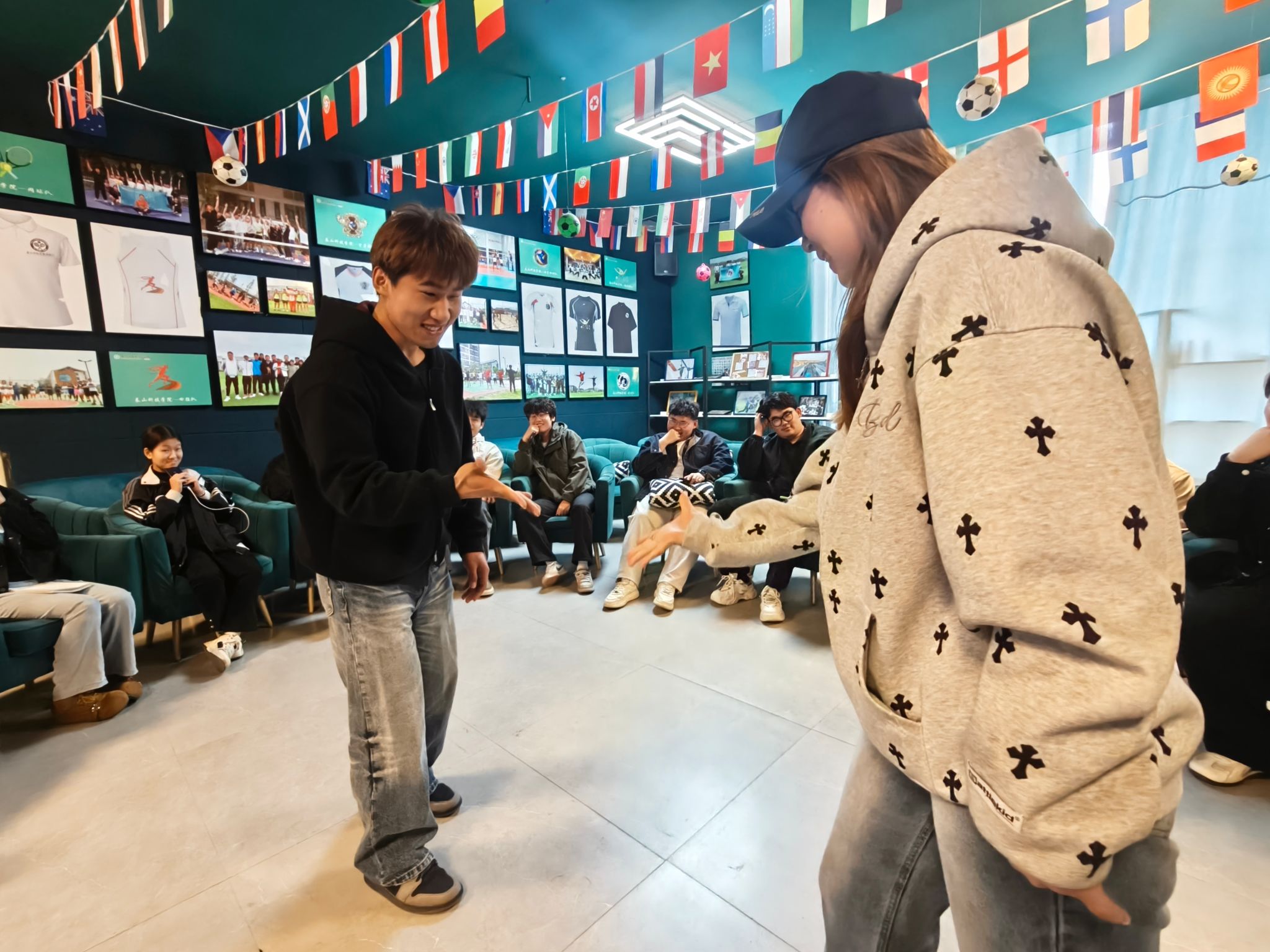 活动开场,一场别出心裁的加字游戏,瞬间点燃了现场的气氛。大家围坐成圈,轻快的背景音乐与阵阵欢笑交织在一起,最后一丝紧张也被悄然驱散。第一个词由双双老师抛出——“九河”。为显公平,圆桌两端的同学谁也不甘示弱,干脆以“剪刀石头布”定先后。规则是每人只能在“九河”基础上加一个字,轮番接力。最终,竟拼成了一句别有意趣的邀约:“九河是一个非常美丽的大地方,我去了你去呀!”每个人都添上了意料之外的一笔,快乐就这样在想象之外悄然绽放。(图片4)