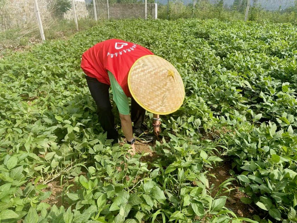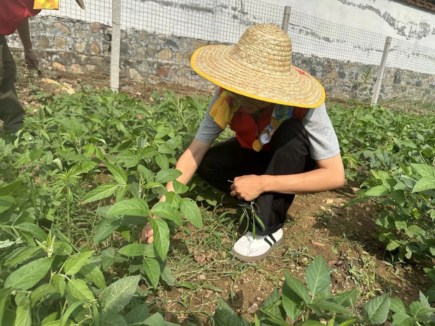 成员们戴上草帽,俯身迈入田间,开始细致地清除杂草。他们轻柔拨开豆苗根部枝叶,仔细辨识并拔除争夺养分的杂草。“野兔!”高铭泽(育英书院/大数据学院)突然低呼,话音未落,他已敏捷地从豆丛中活捉一只活蹦乱跳的灰毛野兔。这意外的“田外来客”瞬间吸引了所有人的目光。赵场长笑着解释,基地依山而建,脆嫩的豆苗常引来山里的“访客”,田间深处或许还有其它的动物出没。路老师当即抓住现场教学机会,讲解野兔啃食豆苗的严重危害,进一步增强了队员们的防护意识。
