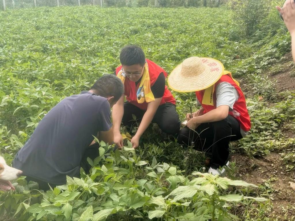 短暂休整后,实践进入科学观察阶段——数据采集。许业昊(育英书院/智能工程学院)和高铭泽(育英书院/智能工程学院)手持量尺,小心翼翼地穿梭在豆垄间,采用五点取样法选取豆苗样本后,轻轻捋顺叶片,精确测量并记录植株高度。仔细的观察带来了惊喜的发现:“快看这株!开了淡紫色的花苞!”“这几株也结出了小豆荚!”田间洋溢着探索的乐趣,书本上的大豆生长知识瞬间变得触手可及。
