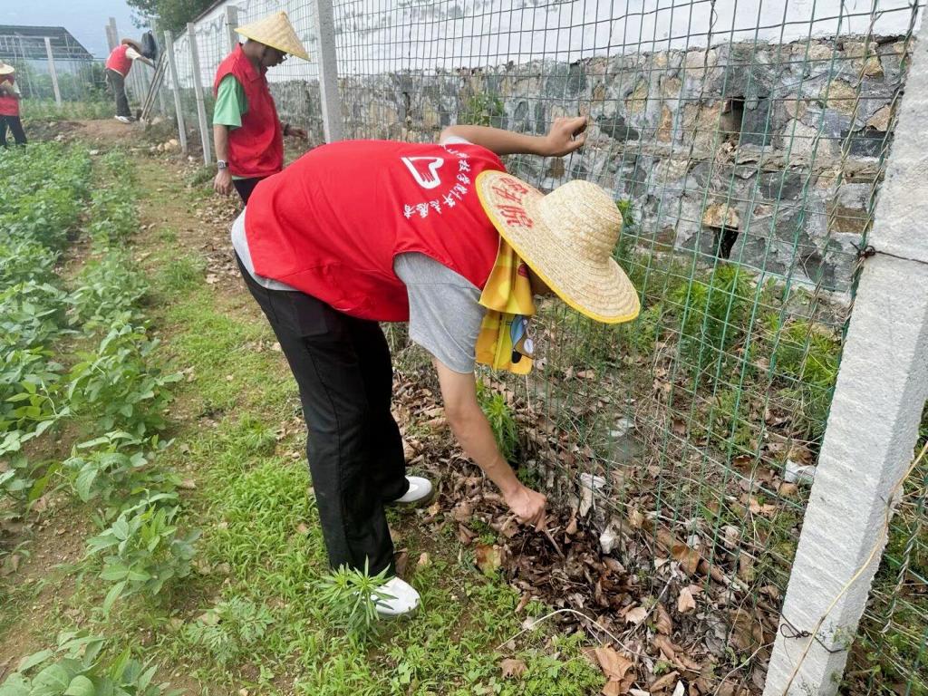 清除杂草后,成员们旋即投入到栅栏的检查与加固工作中。在路老师的带领下,大家沿田埂仔细巡查:逐一检测支撑石柱的稳固性,俯身查验防护网是否存在破损或可供小动物钻入的缝隙。实践团成员不放过任何隐患,及时修补松动处、封堵缺口,确保这道物理屏障坚实可靠。