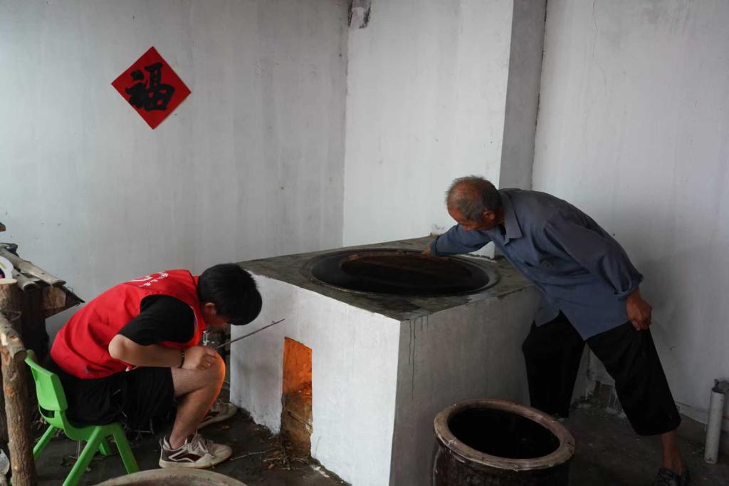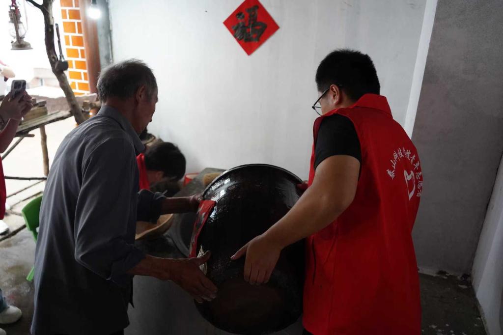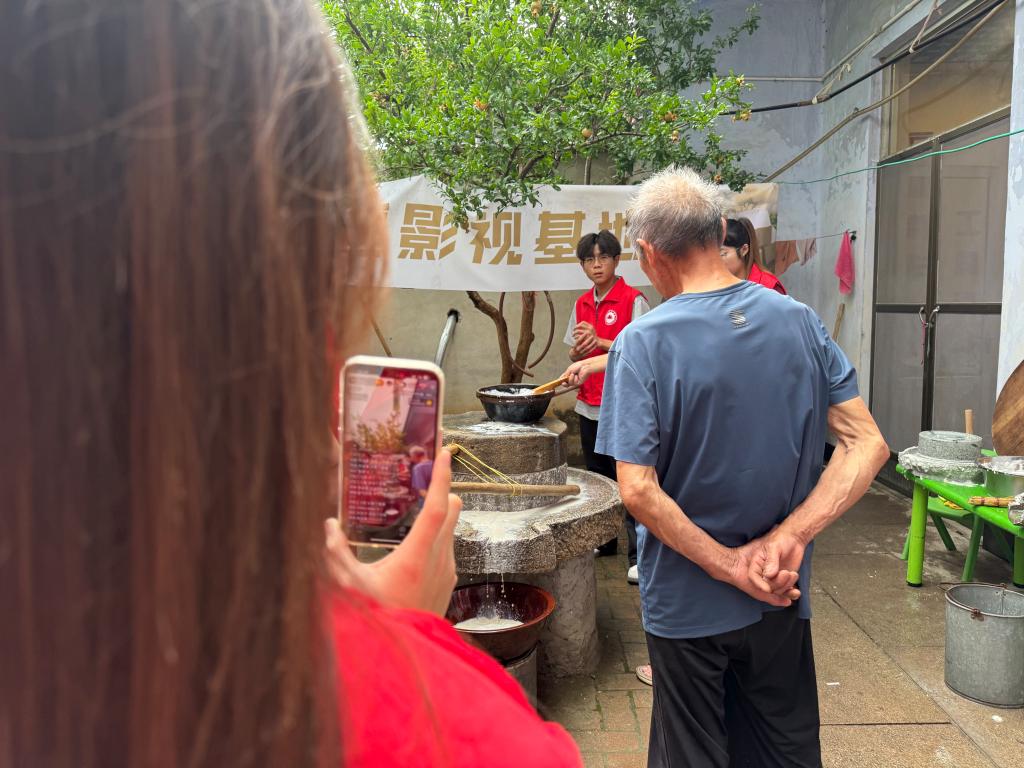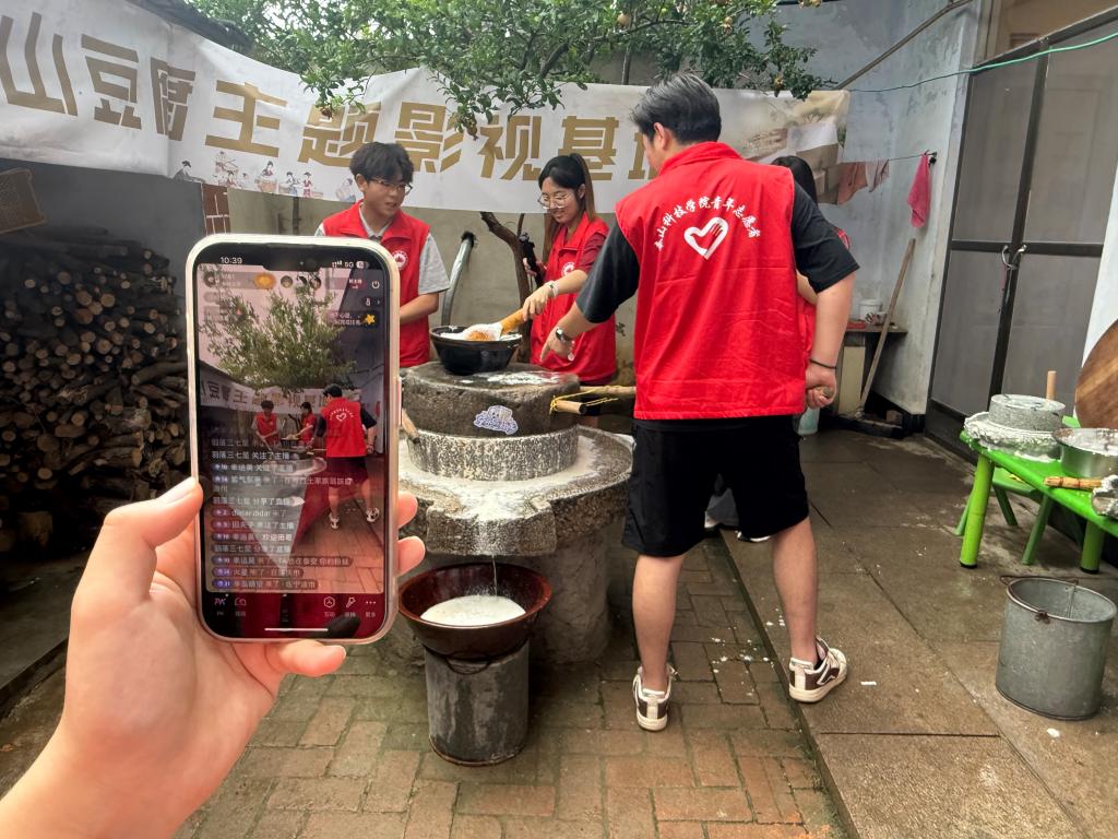 早晨的阳光洒满院落,浸润一夜、颗颗饱满的黄豆弥漫着清新的豆香。褚洪硕(汶阳书院/智能工程学院)手握磨盘的扶手,在杨爷爷耐心指导下,在黄豆倒入石磨后,按逆时针方向用力推动石磨。“娃,水不够了,添点水。”“慢点,水多啦!”杨爷爷急切的话语中透着慈爱,将磨豆的每一步细节细心传授,生怕实践团的成员学不会。随着石磨“嗡嗡”的低吟,洁白的浆液如涓涓细流般自磨缝间流出,豆粒在研磨中蜕变成质地醇厚的生豆浆,滴滴答答的落在盆中。