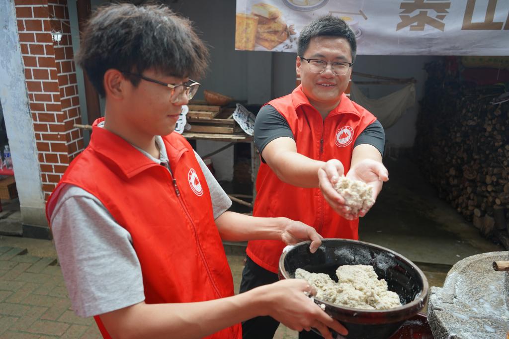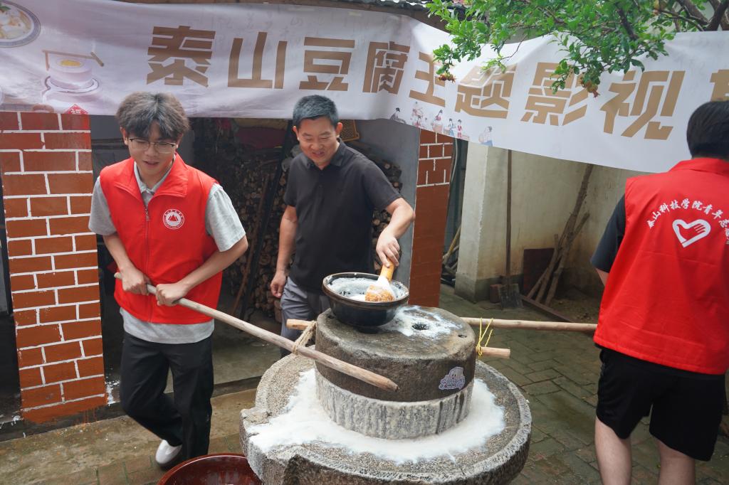 “东岳豆赋乡”乡村振兴实践团以行动践行初心,与前期走进黄前镇麻塔幼儿园开展“一块豆腐里的红色故事”研学课堂相结合,今日从泰山豆腐制作老匠人手中接过传承的接力棒,在石磨缓缓转动的韵律中,完成“老青小”三代人对泰山豆腐制作技艺的薪火相传,加之互联网的传播优势,让泰山豆腐走出泰安城,打造泰山豆腐经济优势。有了年轻人加入,泰山豆腐这门老手艺焕发了新生机,也为乡村振兴注入了源头活水。