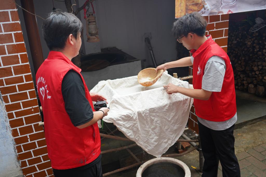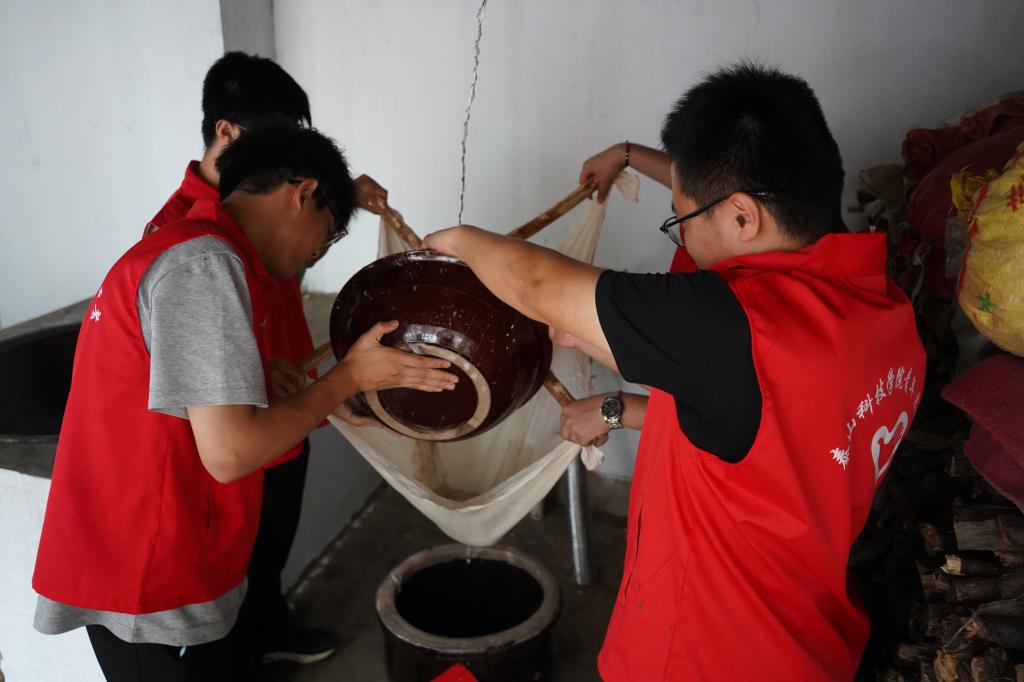 历经数度研磨,生豆浆翻身一变,成为极致细腻的琼浆。在张奶奶悉心指点下,过滤工序如期进行。实践团此前亲手搭建的豆渣过滤架派上了关键用场,吕继源(育英书院/大数据学院)将桶中的浆液,缓缓倒入滤网。浆液在滤布上不断滚动、迸溅,雪白的豆浆如小溪般从滤网流淌进缸中,而滤网中的豆渣,也渐渐累积成团。