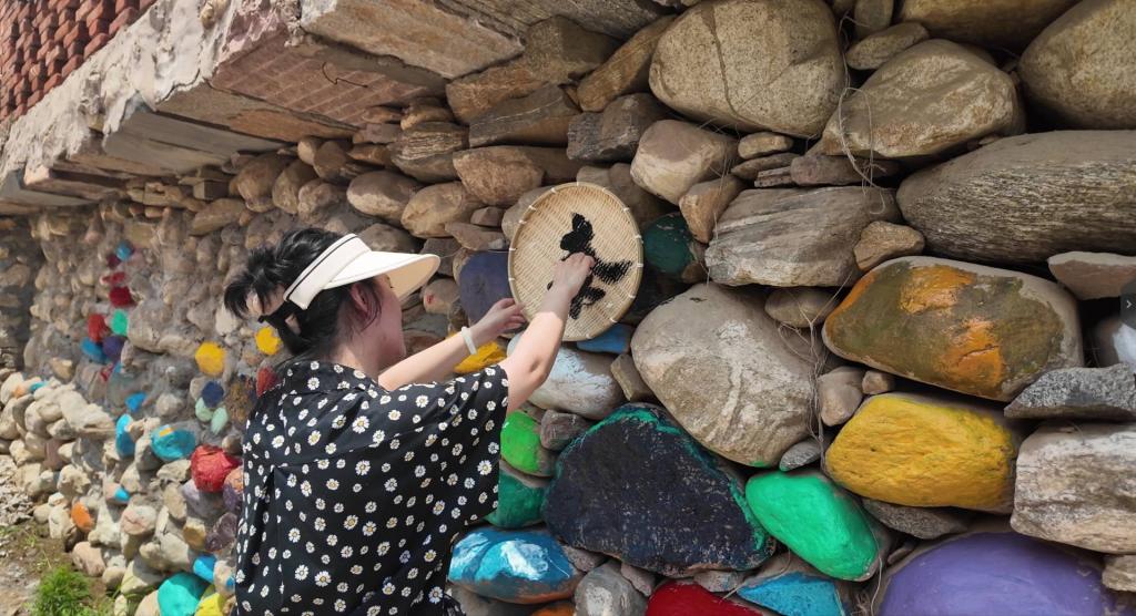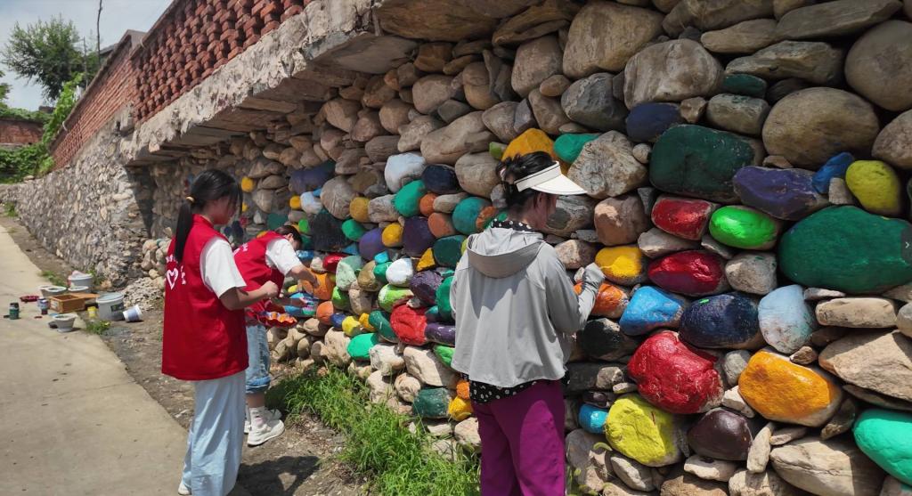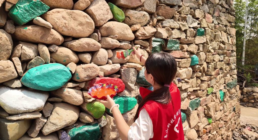 青春的创意与乡土的情感,一笔一划、层层叠叠,在粗糙的鹅卵石表面交融共生。单调古老的石墙悄然蜕变,一幅融合青年创造力与乡村风情的画卷徐徐铺展、日渐清晰。