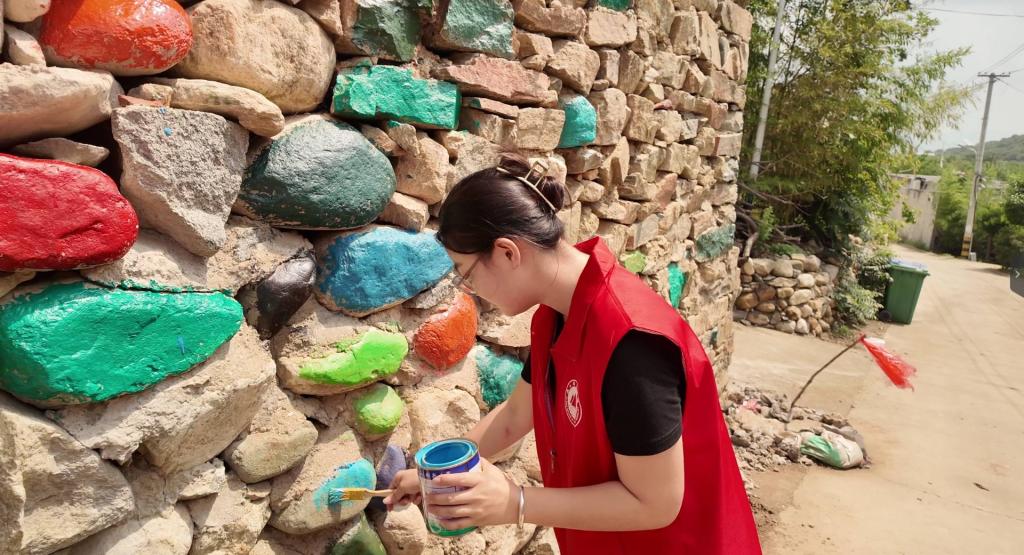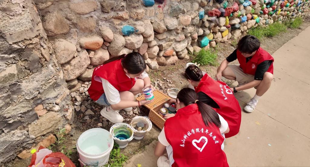 构思既定,画笔飞扬。成员们将心中构想倾注于石壁,精心描绘,赋予每一块独特鹅卵石新的生命。胡永红(敢当书院/大数据学院)蘸取蓝色颜料,笔触轻点,宁静的蓝如星辰般散落墙面;赵凤钏(敢当书院/大数据学院)下笔精准有力,饱满的色彩迅速跃上石壁,活力四射;郑馨雅(海右书院/大数据学院)则在调色盘上不断尝试,调和出独属于泰山豆腐村的韵味。实践团指导老师李敏与王小刚一面悉心指导笔触落点,一面热烈交流,将对乡土的热爱融入流动的色彩中。师生专注的身影,共同构成一幅动人的创作图景。