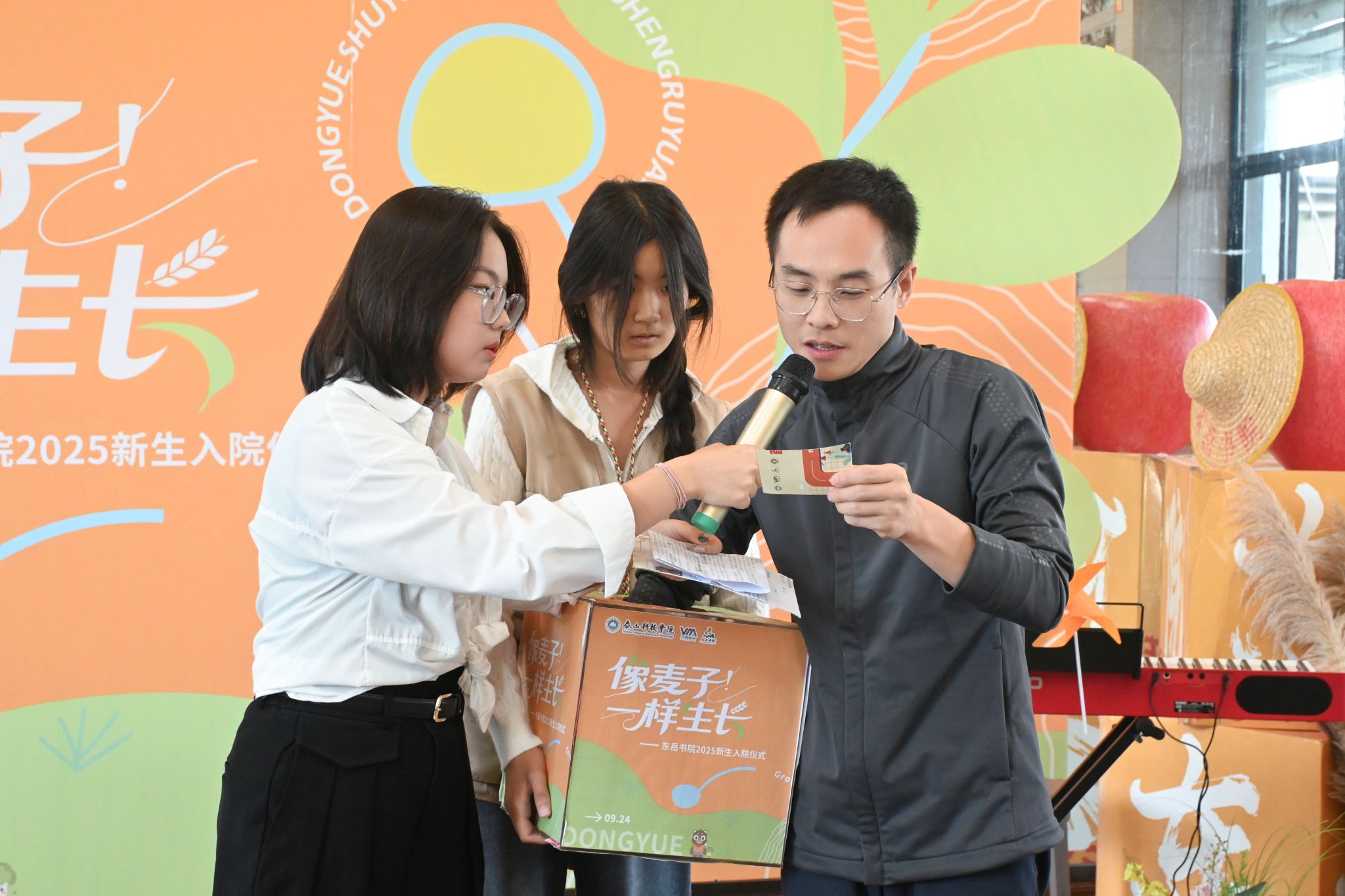 在“禾伙人”身份认证环节,东岳书院发展导师路澳征与学生会主席任桐泽为新生代表佩戴上手工制作的东岳特色胸章并颁发入院证书。胸针轻扣之间,600余粒怀揣梦想的“麦子”正式融入东岳大家庭。