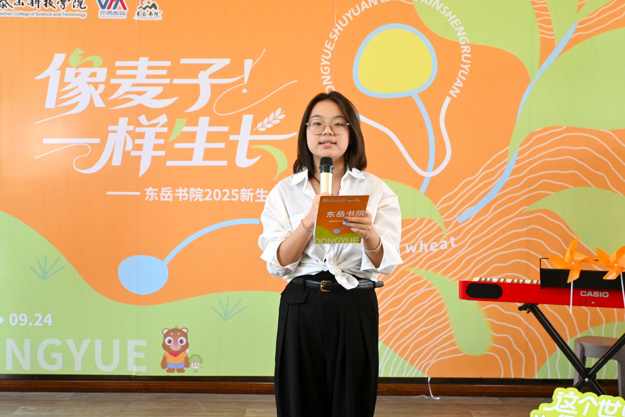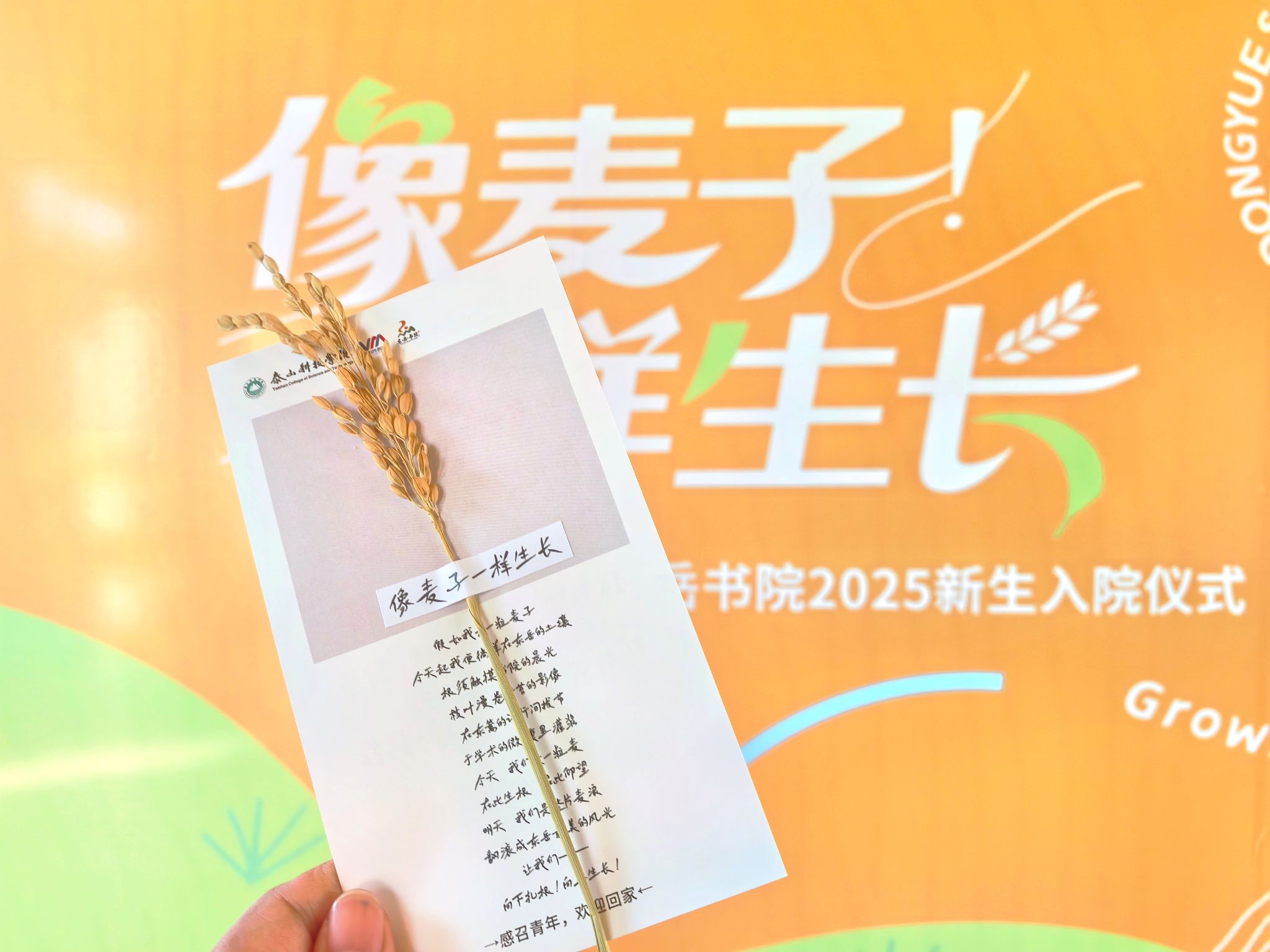 仪式接近尾声,全场新生轻轻扬起手中书院师生为新生专属创作的《像麦子一样生长》诗歌。在主持人郑馨雅温柔而坚定的领读下,活动现场缓缓回荡:“假设我是一粒麦子,今天起我便徜徉在东岳的土壤……”