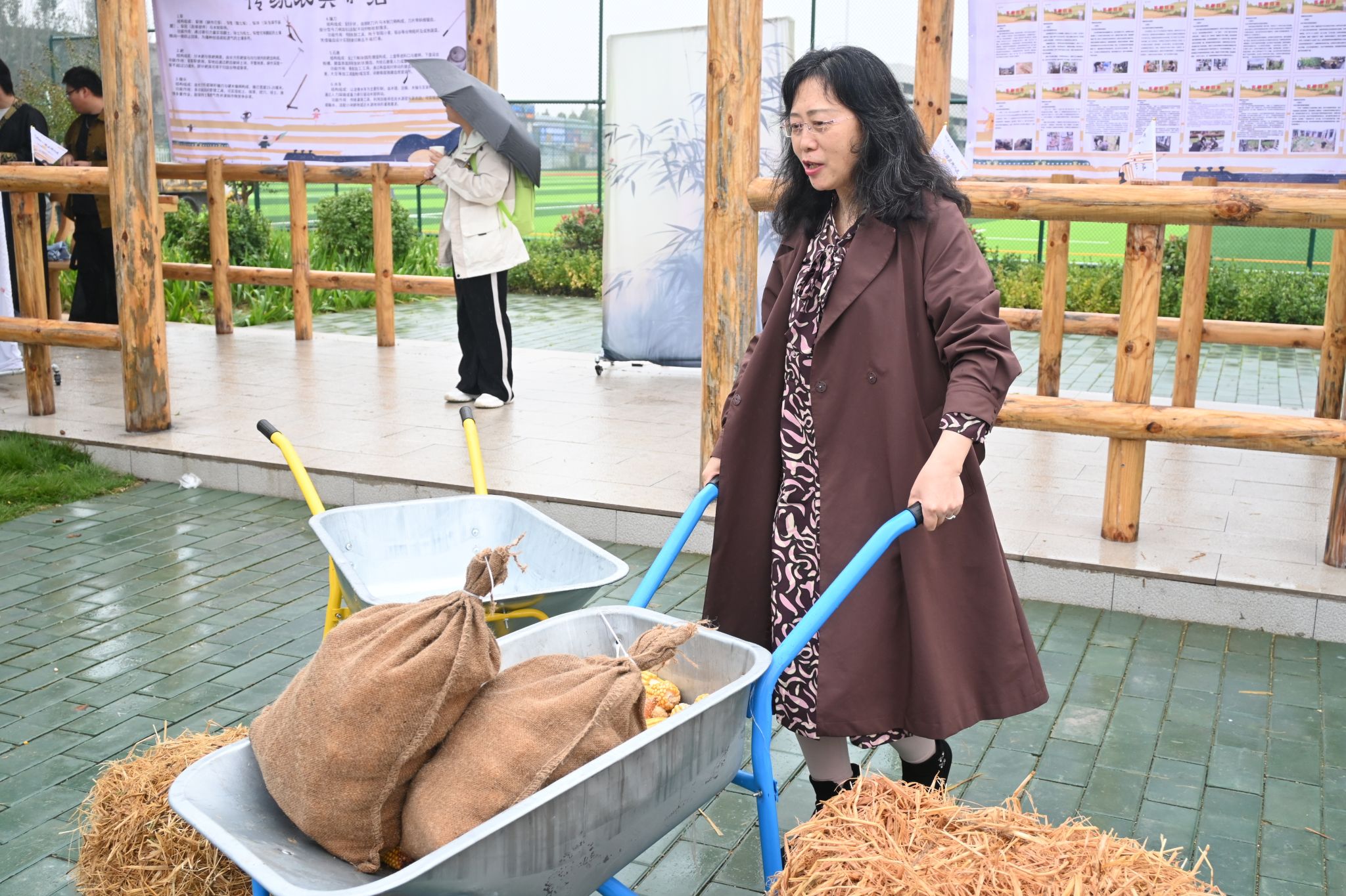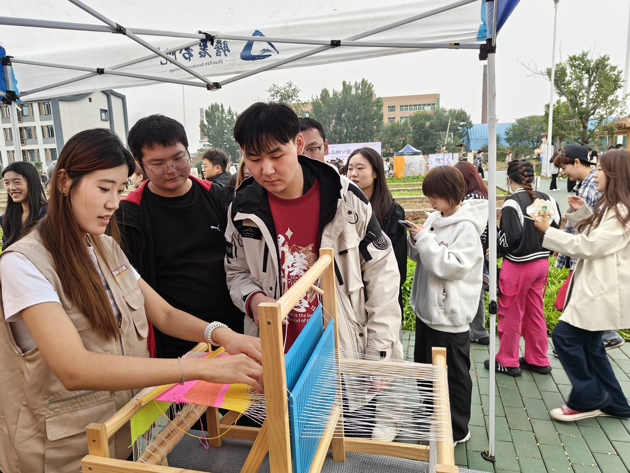 农耕体验区:织布体验的同学操纵织布机让彩线穿梭,玉米脱粒“唰唰”声里金黄玉米粒堆起“小海”。