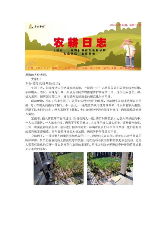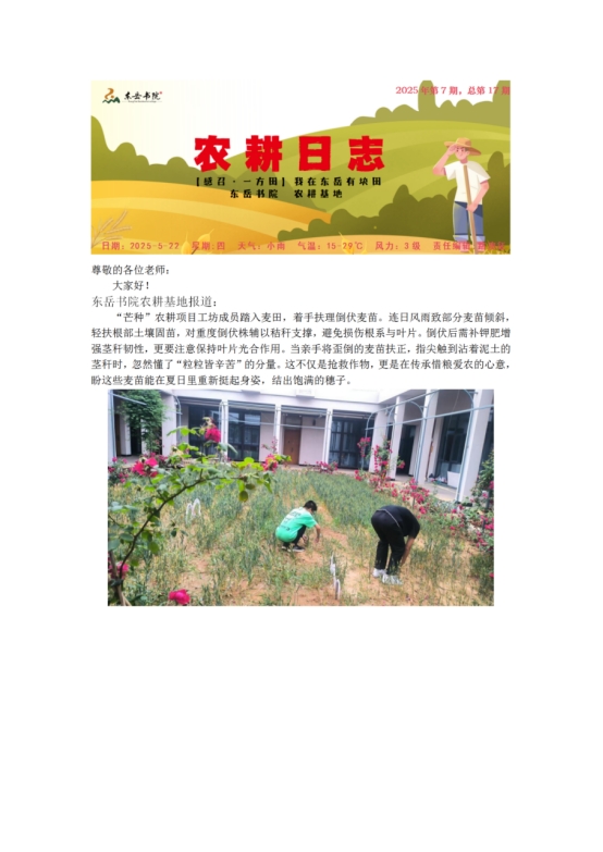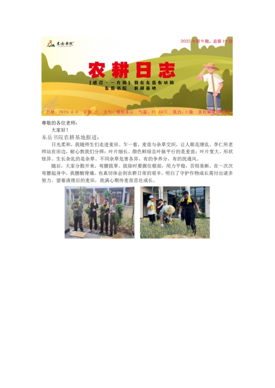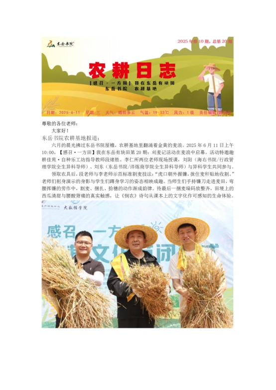 谨向所有躬耕不辍的田园耕种家们(东岳禾伙人、“耕遇一方”专项志愿服务队、“芒种”农耕项目工坊、趣耕佳苑·自种乐工坊、高国金、赵雪霏、王荣、杨荣光、郝莹、苏燕、刘东、郝艳芝、赵景山、周艳翠、段绪胜、段丹丹、李仁所、刘阳、郑刚、侯宁、何鹏程、于子晨等师生)致以最深的敬意与谢忱!这方田从不是沉默的容器,它收存过12月的霜、4月的风、6月的汗,也生长着比麦穗更饱满的期待。当师生们把镰刀挂上谷仓,新的种子已在掌心发烫——土地永远懂得,所有躬身的付出,终将在某个清晨,被第一缕阳光酿成丰收的诗。