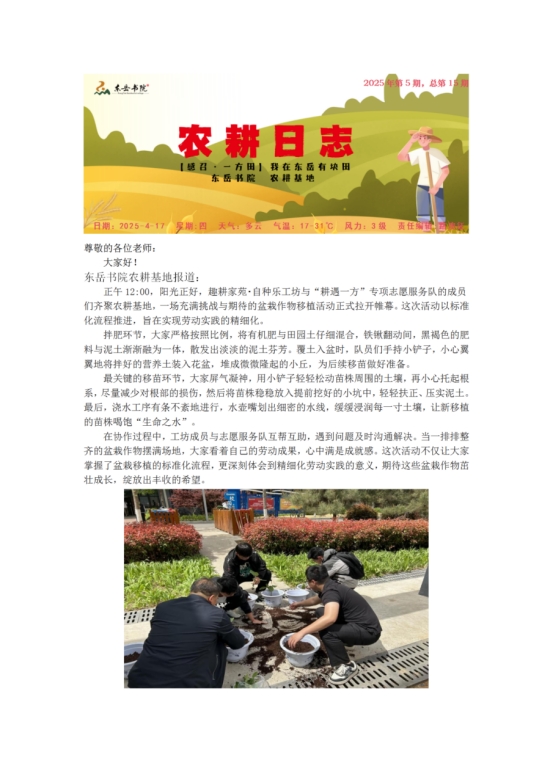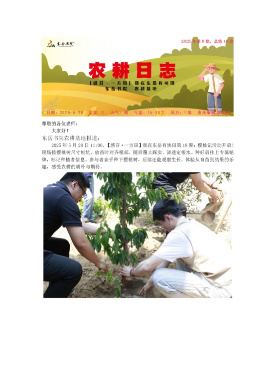 【感召·一方田】我在东岳有块田作为东岳书院“369”感召生态圈中农耕育人单元,目前共举办20期,覆盖师生800余人,一同握过锄头的柄,把“劳动”二字写成了可触摸的故事。即将启用的6000平方米农耕公园,让我校劳动教育工作更加饱满,育人空间更加广阔,会让更多师生认领自己的“一亩三分地”,育人场景从教室转变为田地,育人媒介从课本转变为锄头。如今每一粒埋下的种子,都会在秋天交出关于成长的答卷。
