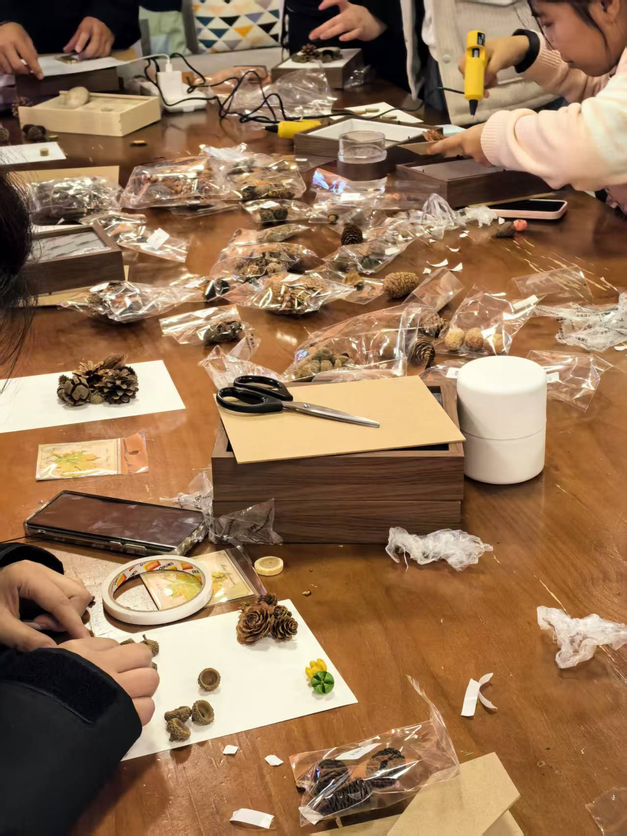 “现在,我们要把刚才的感悟‘装’进相框里!”随着主持人一声号召,最受期待的“手作·相框”环节到来。桌上的原木相框、木片套装、松果套装、植物混合装饰包等材料,成了大家的“文化创作素材”。