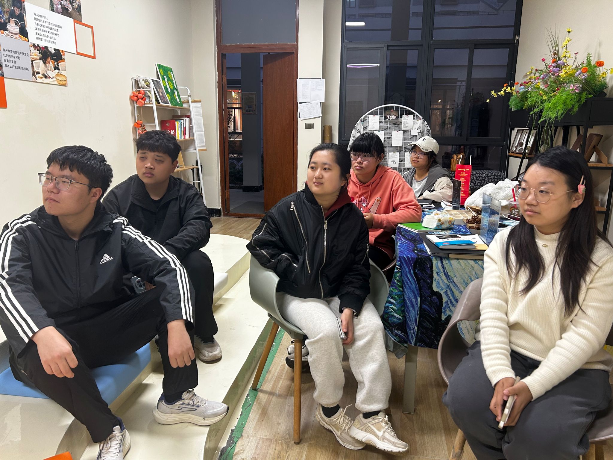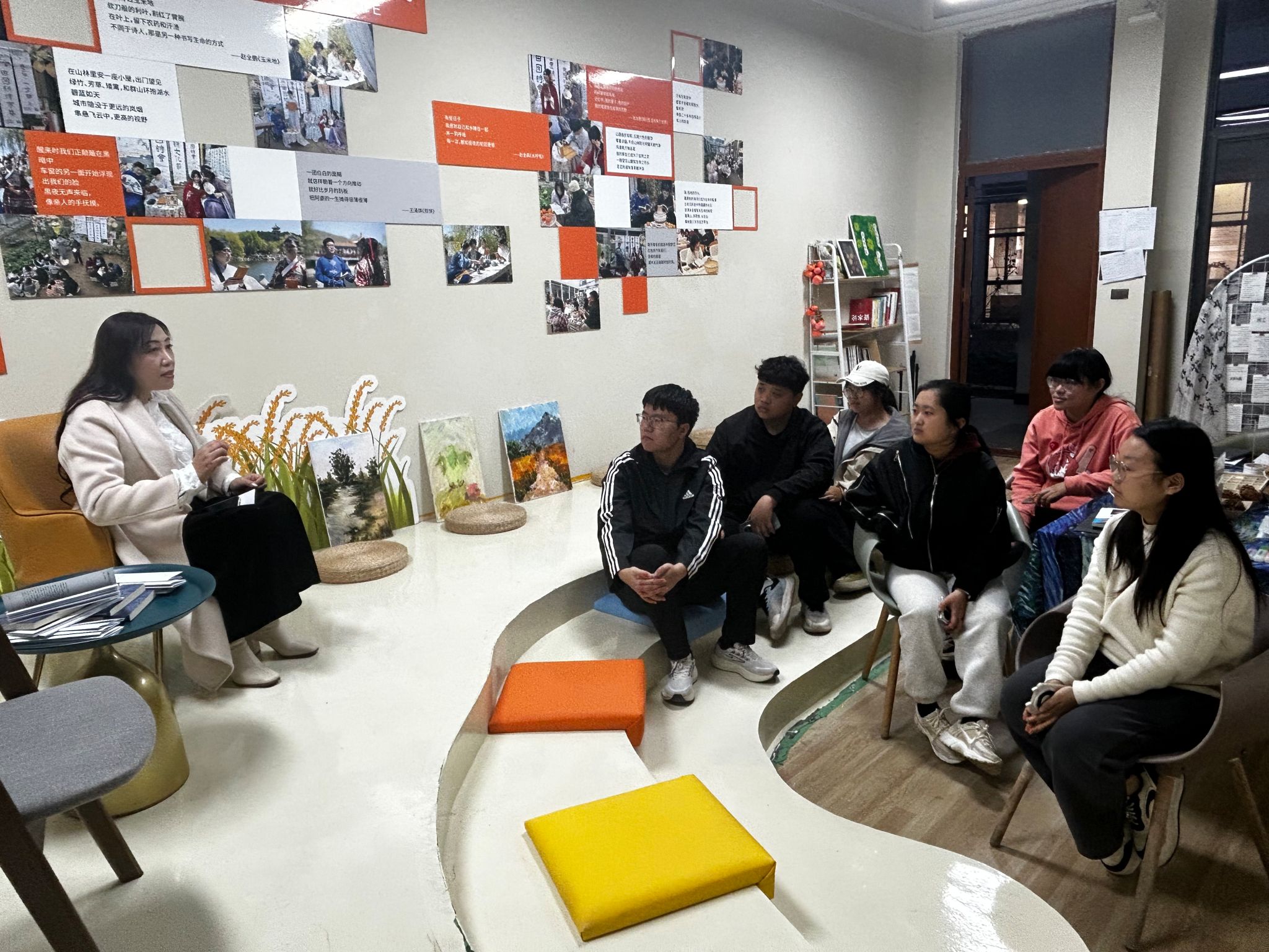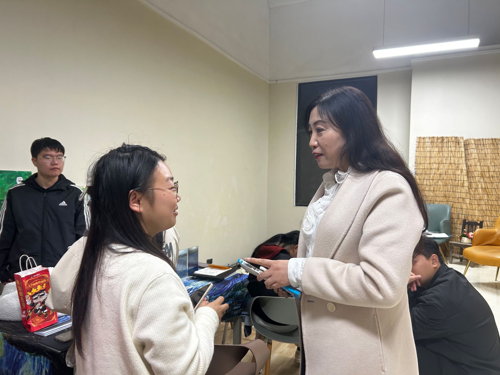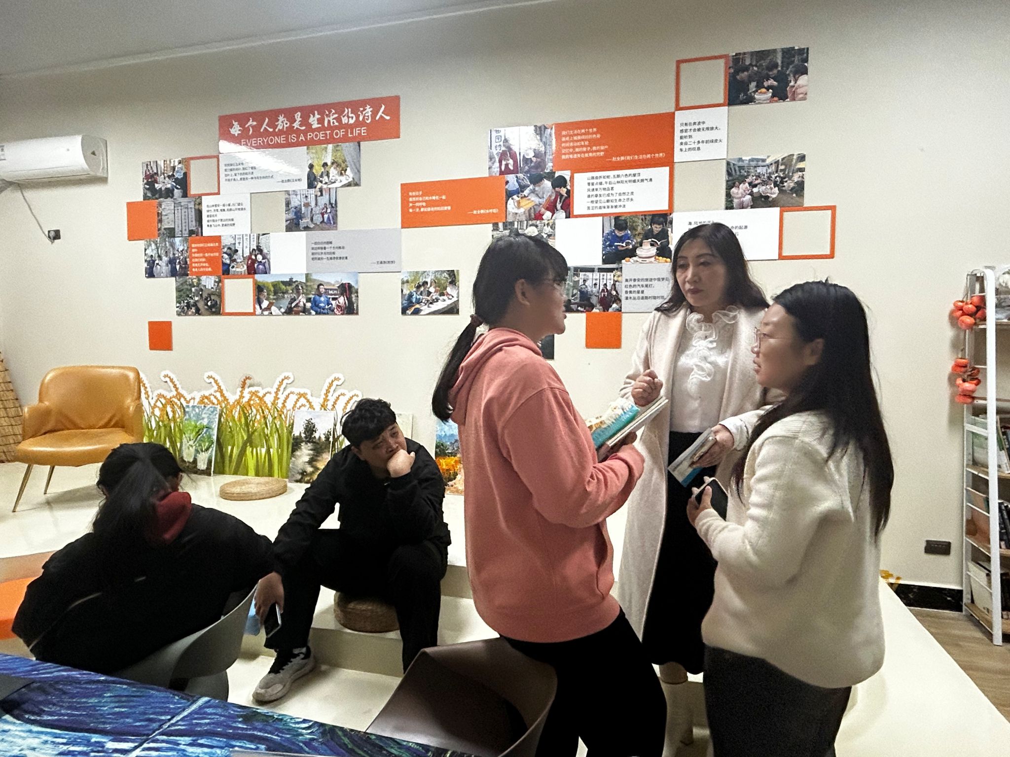 在诗歌工坊指导老师吴永强的介绍下,田暖详细了解了同学们的诗歌创作,并给予指导。她非常喜欢东篱诗舍的文学氛围——“每个人都是生活的诗人。”在东篱诗舍谈诗、写诗,早已常态化,成为校园里的一道风景。