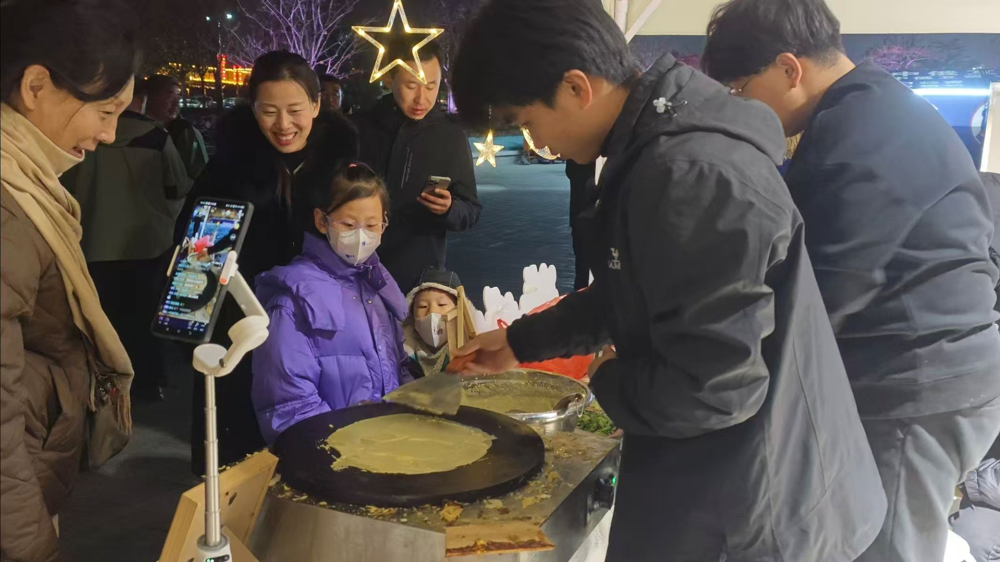每一个摊位都是微缩的创意据点,在“泰科煎个饼饼”工坊项目升腾的气息里,煎饼的“滋滋”声响,只见工坊的主理人与成员们手法娴熟,摊浆、打蛋、撒料、折叠,行云流水。面糊中可以融入新鲜果蔬汁,变幻出青春的缤纷色彩;每一张煎饼的诞生,都是一次传统美食与当代创意的交融。同学们一边热情地介绍着工坊从原料选择到口味研发的“泰科里工坊的”故事,一边与市民游客畅聊。一位品尝煎饼的阿姨笑着说:“吃了这么多年煎饼,今天这个‘大学生版本’,又好看又有新味道,感觉老手艺也跟着变年轻了!”