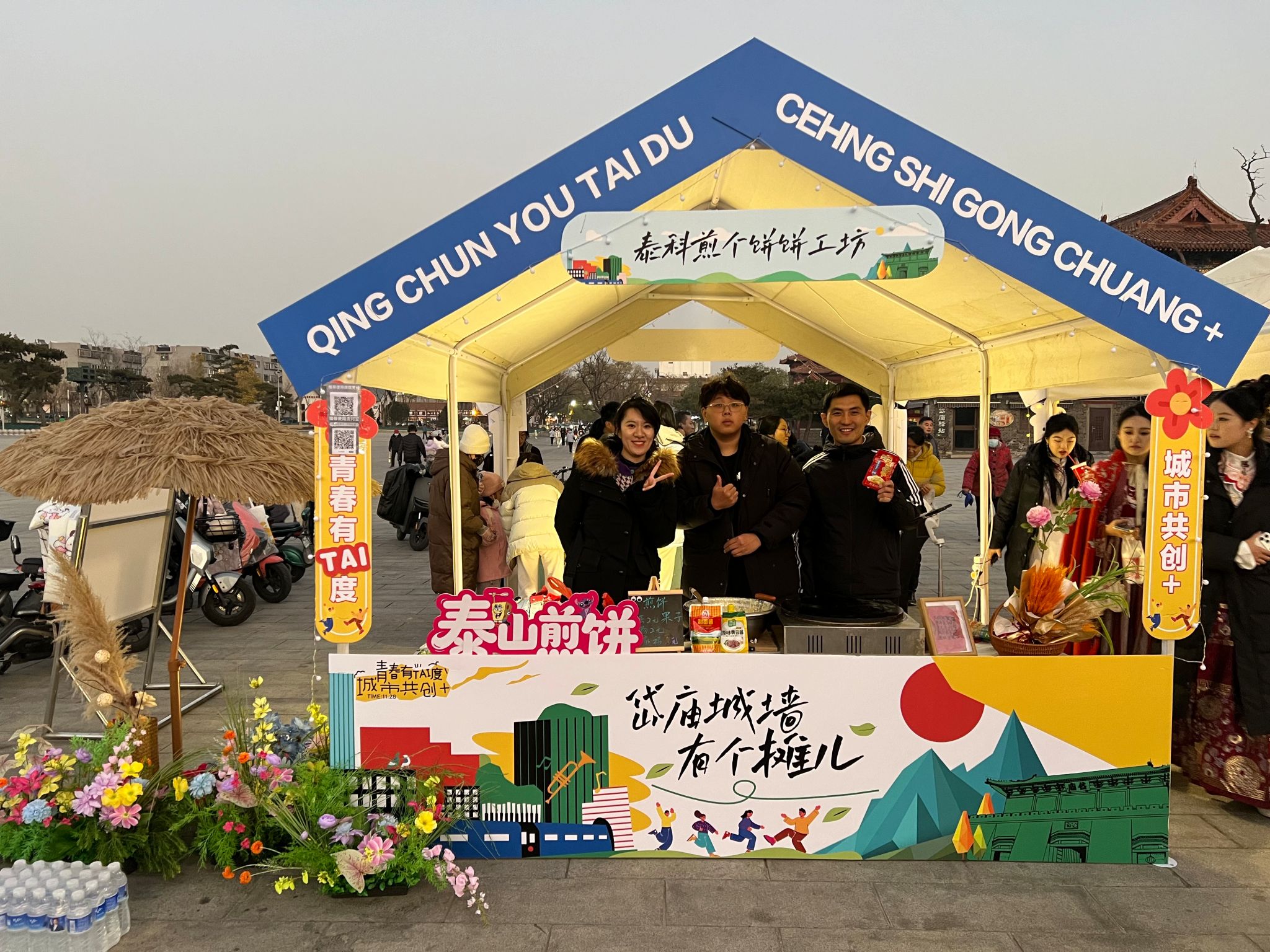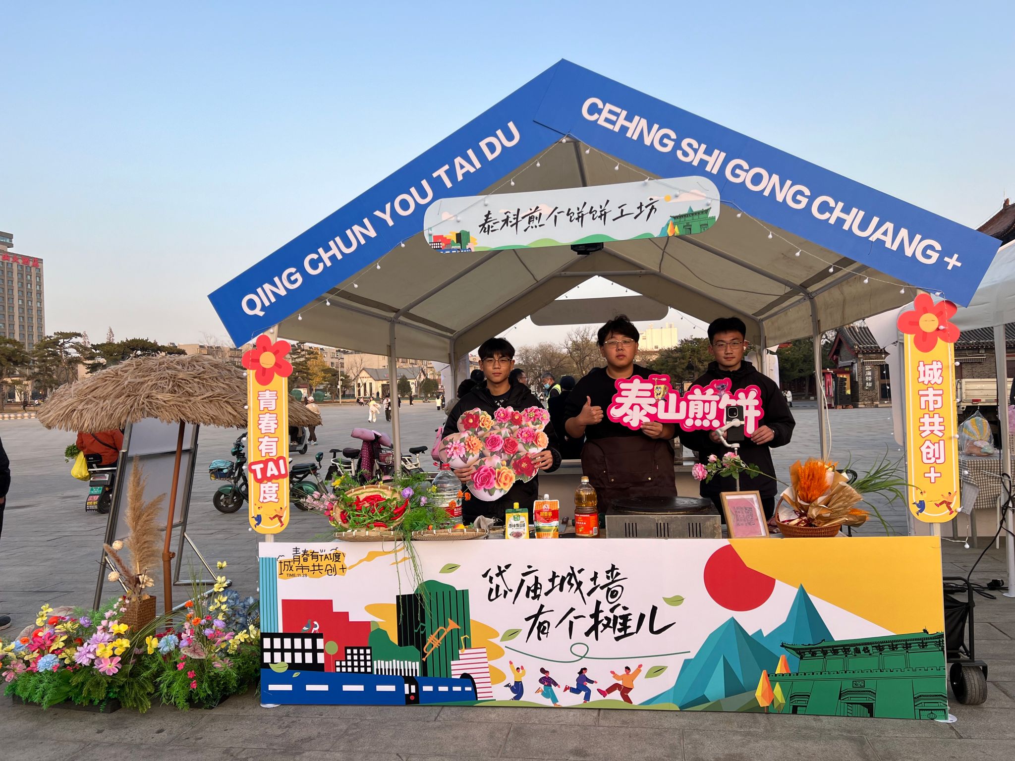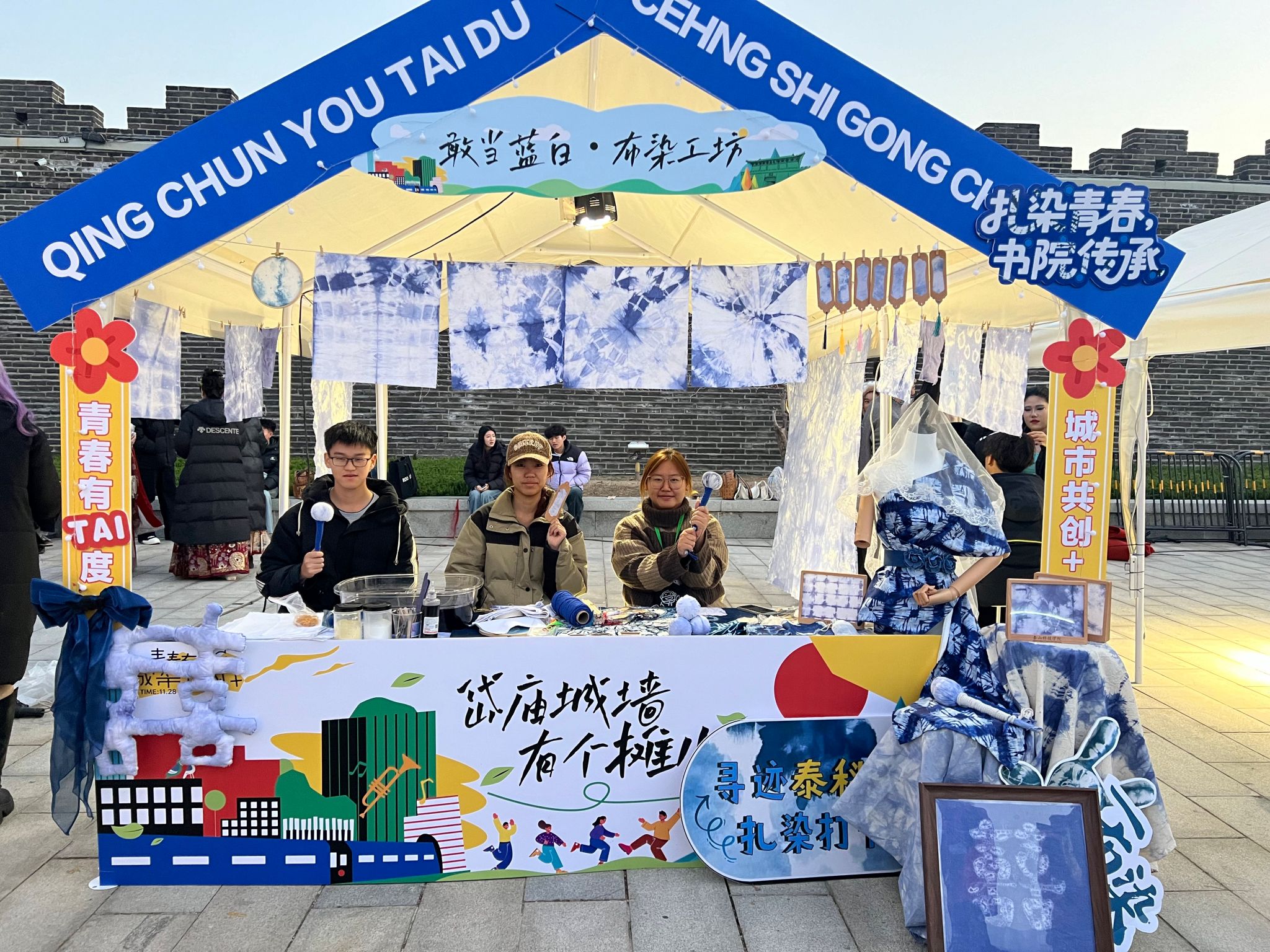 11月28日,岱庙北文化广场千年城墙在光影中绽放魅力,清越歌声、创意摊位、欢声笑语交织成动人交响。由共青团泰安市委举办“青春有TAI度 城市共创+”项目,“岱庙城墙有个摊儿”首场活动在这里启幕,一场青春与城市的双向奔赴正唤醒古城的年轻脉搏。我校东岳书院“泰科煎个饼饼”工坊项目、“东岳印记·熙墨堂篆刻”工坊项目、非物质文化遗产研究中心“面·陶·纸·承雅韵”项目、敢当书院×建筑工程学院“敢当蓝白·布染工坊”,集体亮相活动现场,工坊主理人和成员们以“城市共创者”的身份将青春创意融入泰城冬日的烟火气息中。