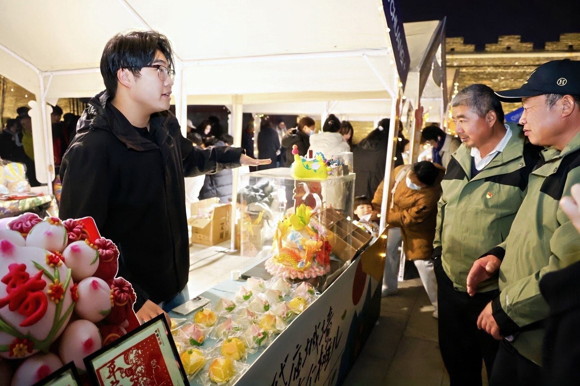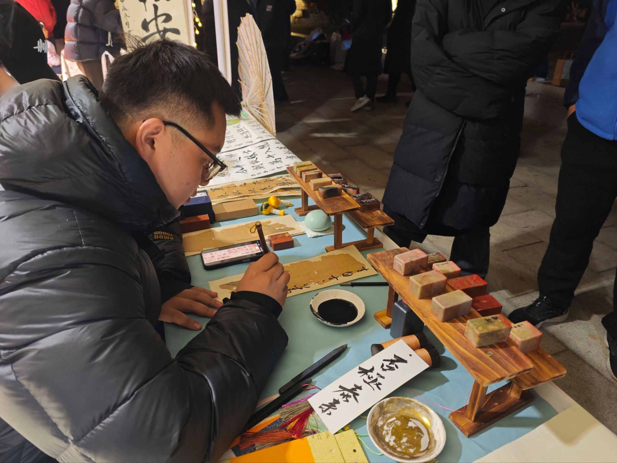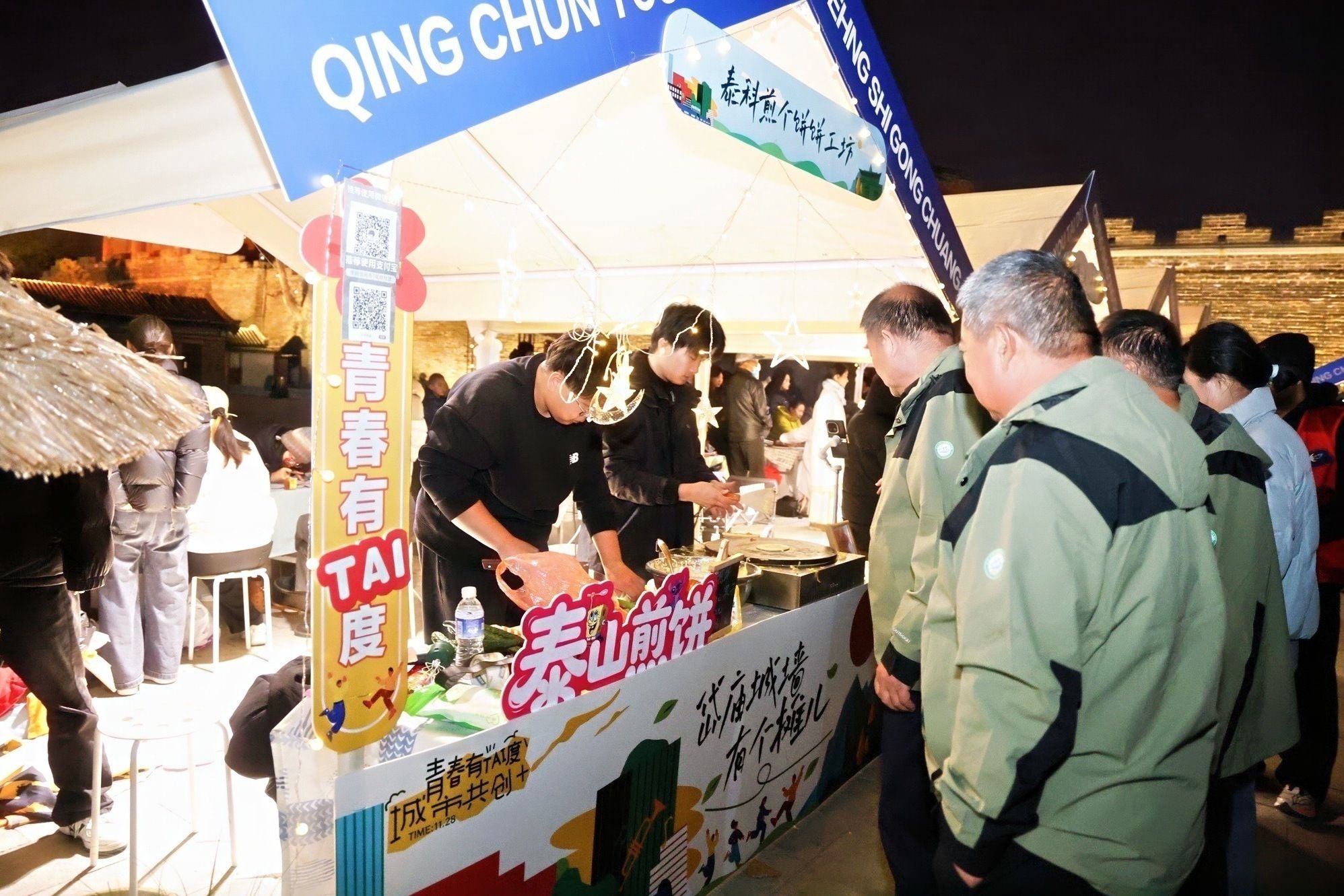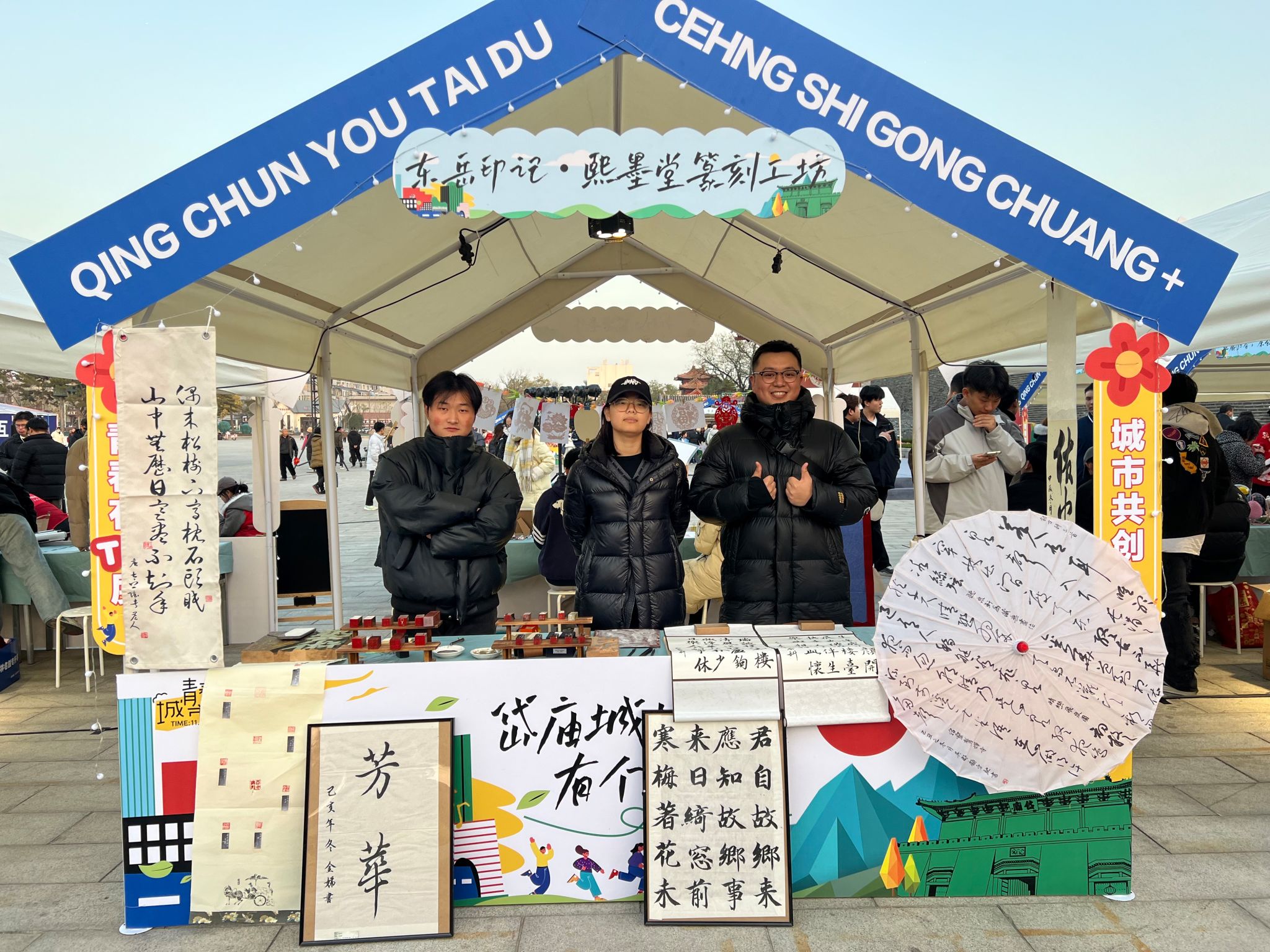 11月28日,岱庙北文化广场千年城墙在光影中绽放魅力,清越歌声、创意摊位、欢声笑语交织成动人交响。由共青团泰安市委举办“青春有TAI度 城市共创+”项目,“岱庙城墙有个摊儿”首场活动在这里启幕,一场青春与城市的双向奔赴正唤醒古城的年轻脉搏。我校东岳书院“泰科煎个饼饼”工坊项目、“东岳印记·熙墨堂篆刻”工坊项目、非物质文化遗产研究中心“面·陶·纸·承雅韵”项目、敢当书院×建筑工程学院“敢当蓝白·布染工坊”,集体亮相活动现场,工坊主理人和成员们以“城市共创者”的身份将青春创意融入泰城冬日的烟火气息中。