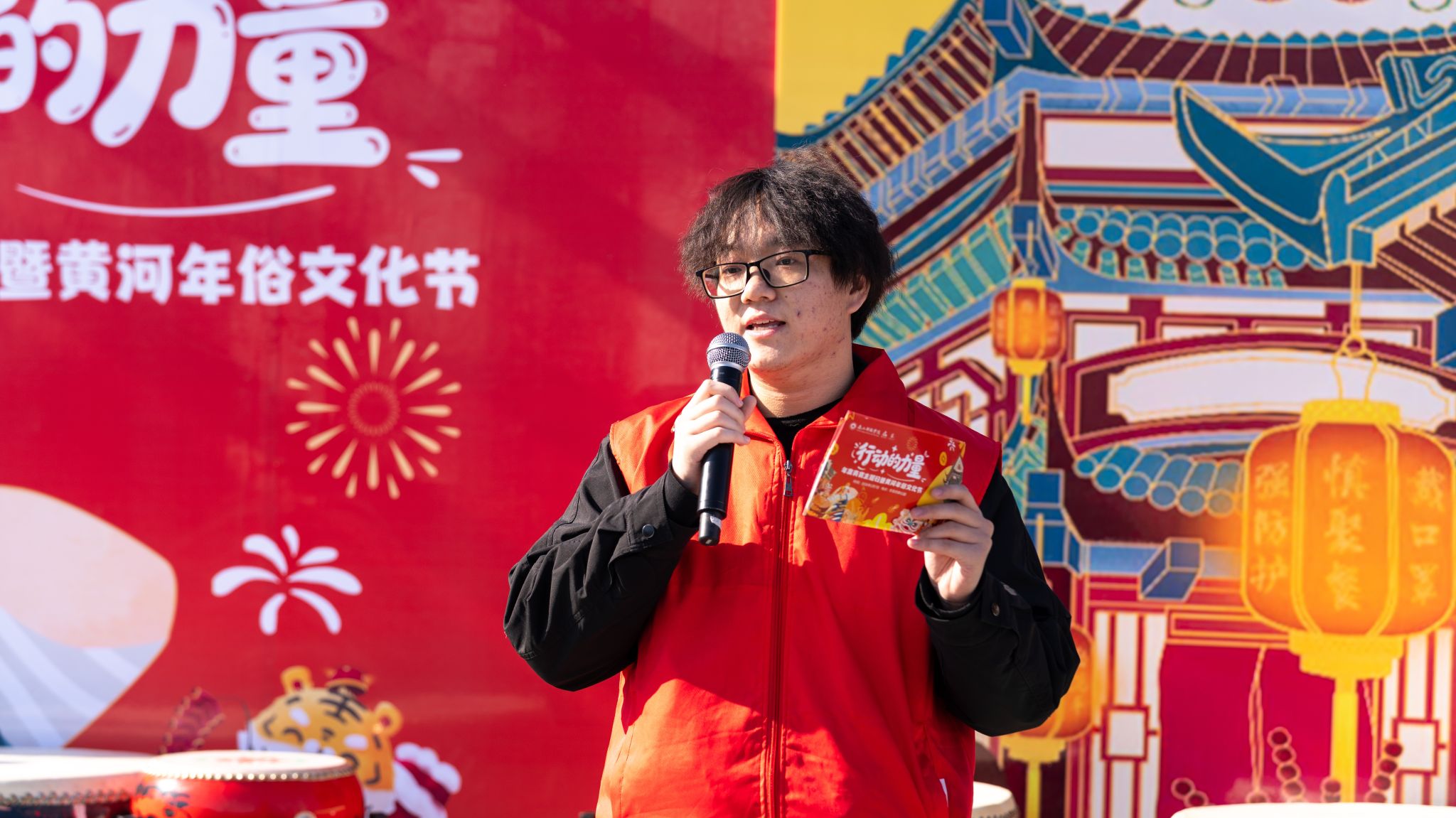 团委志愿服务中心杜昊阳(汶阳书院/智能工程学院)带来分享通过回收各类可回收物,累计兑换1691元公益基金,用于本次“黄河年俗文化节”活动。而这份公益力量也为现场带来重磅惊喜——一头身披大红绸花的年猪被缓缓抬上舞台,瞬间引发全场惊呼热议,空气中满是惊喜与期待。