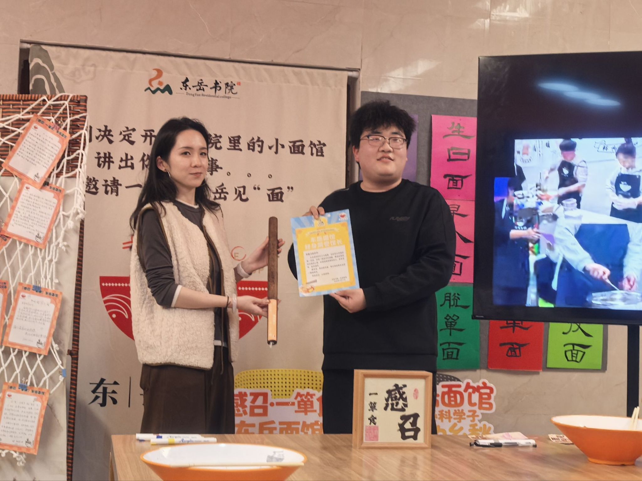 本次特别邀请上一任面馆馆长曹月阳(现育英书院发展导师)上台,回顾了自己在面馆的点点滴滴:“以前自己在面馆是为大家做面的人,今后再来面馆将是吃面的人”。随后与杜晓彤老师相互交换了象征着传承的“擀面杖”和“东岳面馆终身荣誉馆长”荣誉证书,现场掌声不断,温情满满。