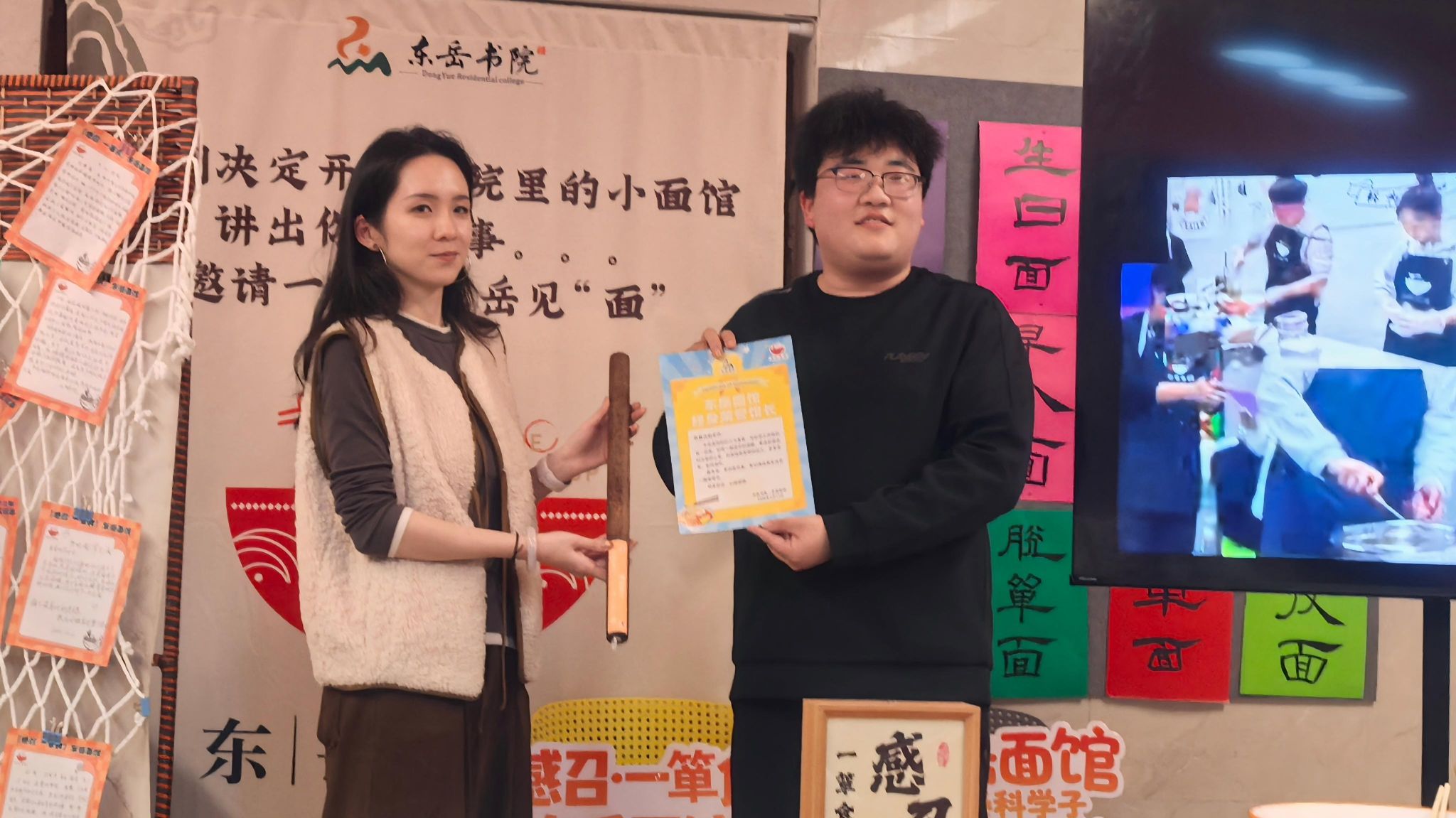 傍晚18:00,东岳面馆里咕嘟声与菜香交织,【感召·一箪食】第42期“启航面”温馨开启。作为新学期首场师生共膳,本次“启航面”以“面对”为意,邀请师生围坐一桌,在烟火气中共话未来。新老馆长交接仪式同步举行,上任馆长曹月阳与新任馆长杜晓彤交换象征传承的“擀面杖”和荣誉证书,这一交一接,是过往时光的传承,更是全新征程的开启。散场时夜色已深,有人抱着刚收的苔菜回宿舍,有人揣着目标兴奋讨论,面馆的灯还亮着,下一碗面正在下锅。