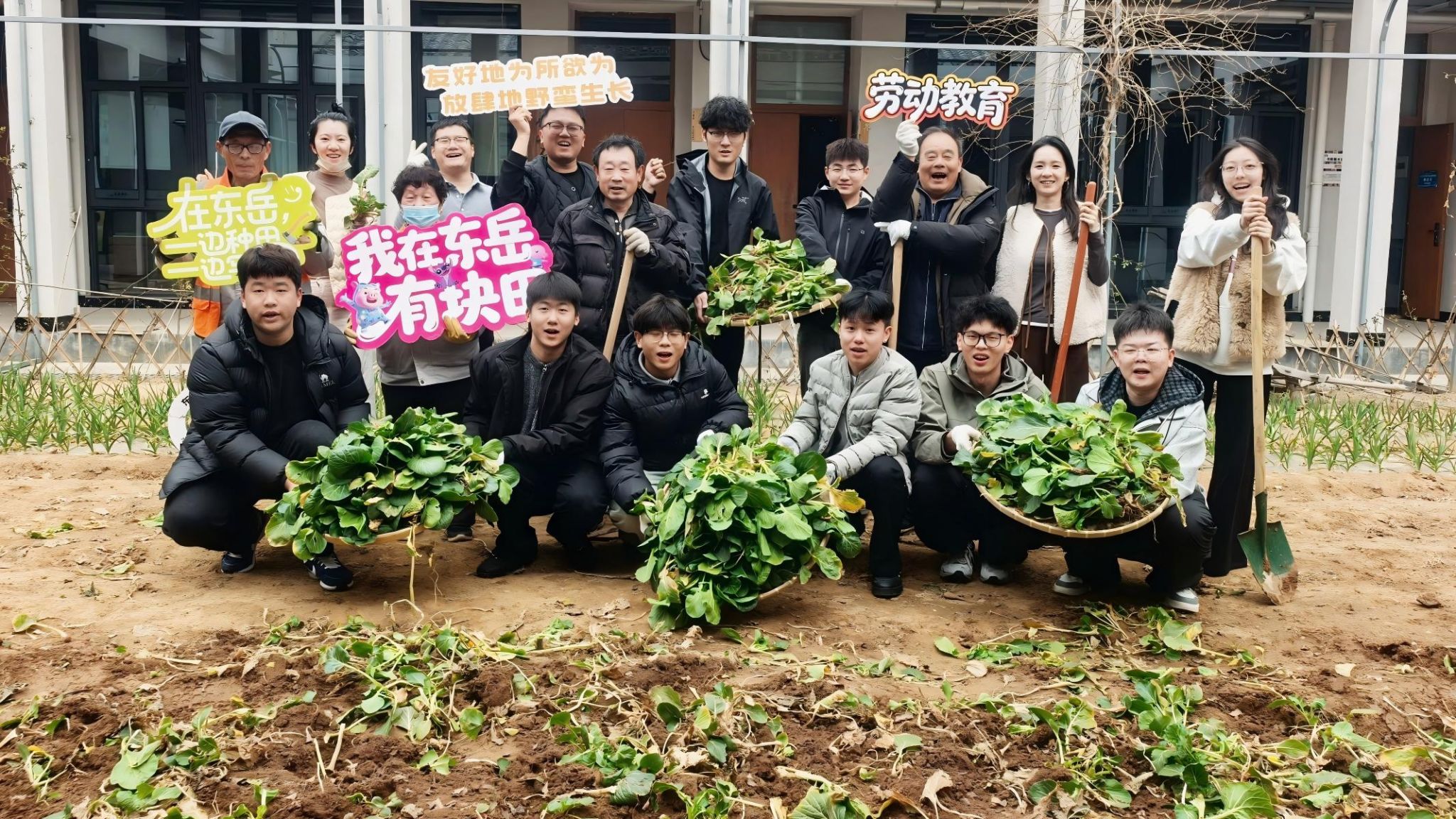 3月11日下午,东岳书院农耕基地里,【感召·一方田】第27期“春收记”如约而至。“东岳禾伙人”再次聚在田间。发展导师路澳征化身“农耕讲师”,以苔菜为引,从营养价值讲到春日养生,再到多样烹饪方式,学生们眼前一亮。随后师生俯身田间,采收、整理、搬运,一派繁忙有序。活动尾声,手捧苔菜的师生们在农耕基地前留下灿烂合影,镜头定格的不仅是丰收瞬间,更是劳动带来的成长与情谊。
