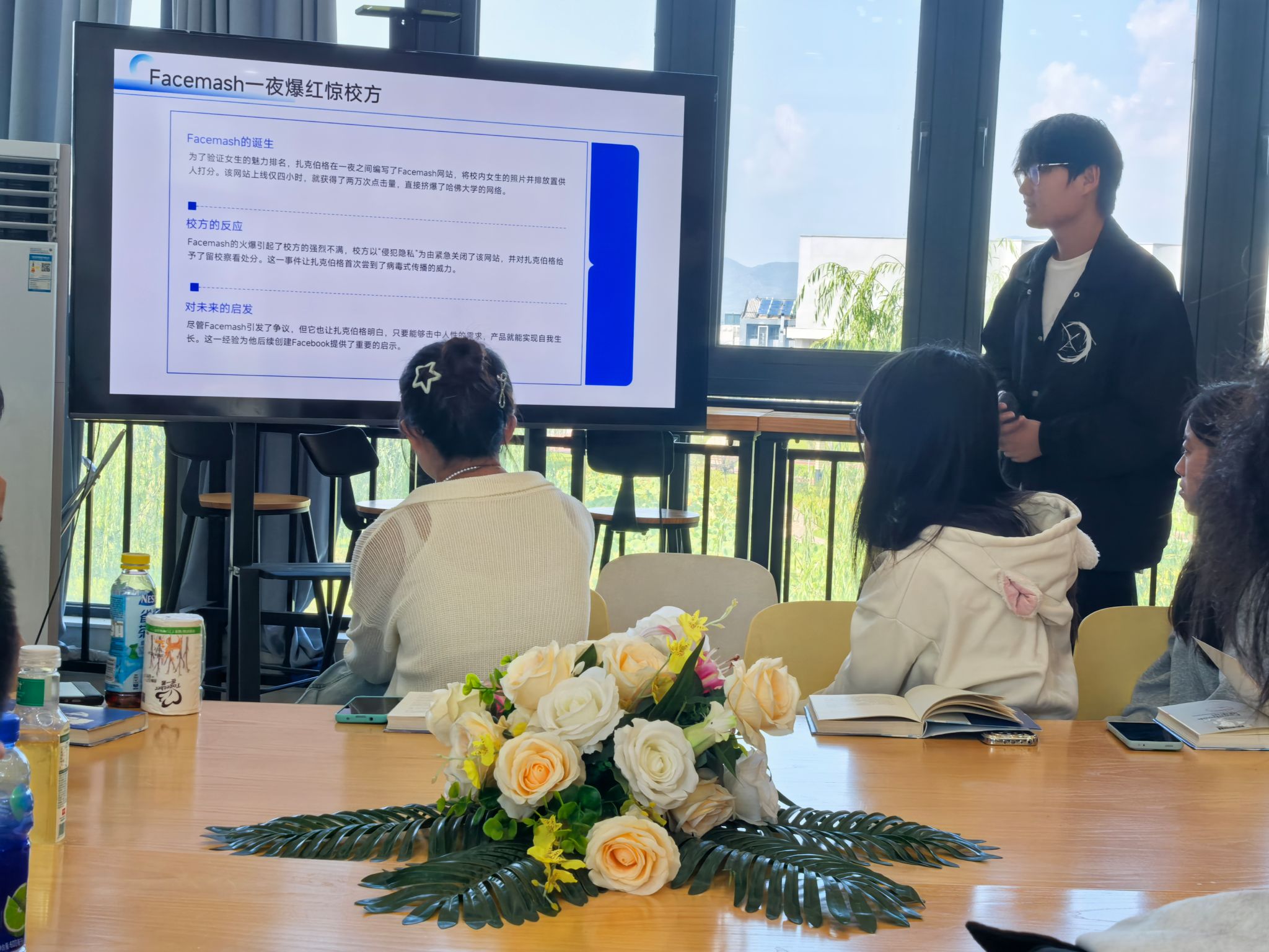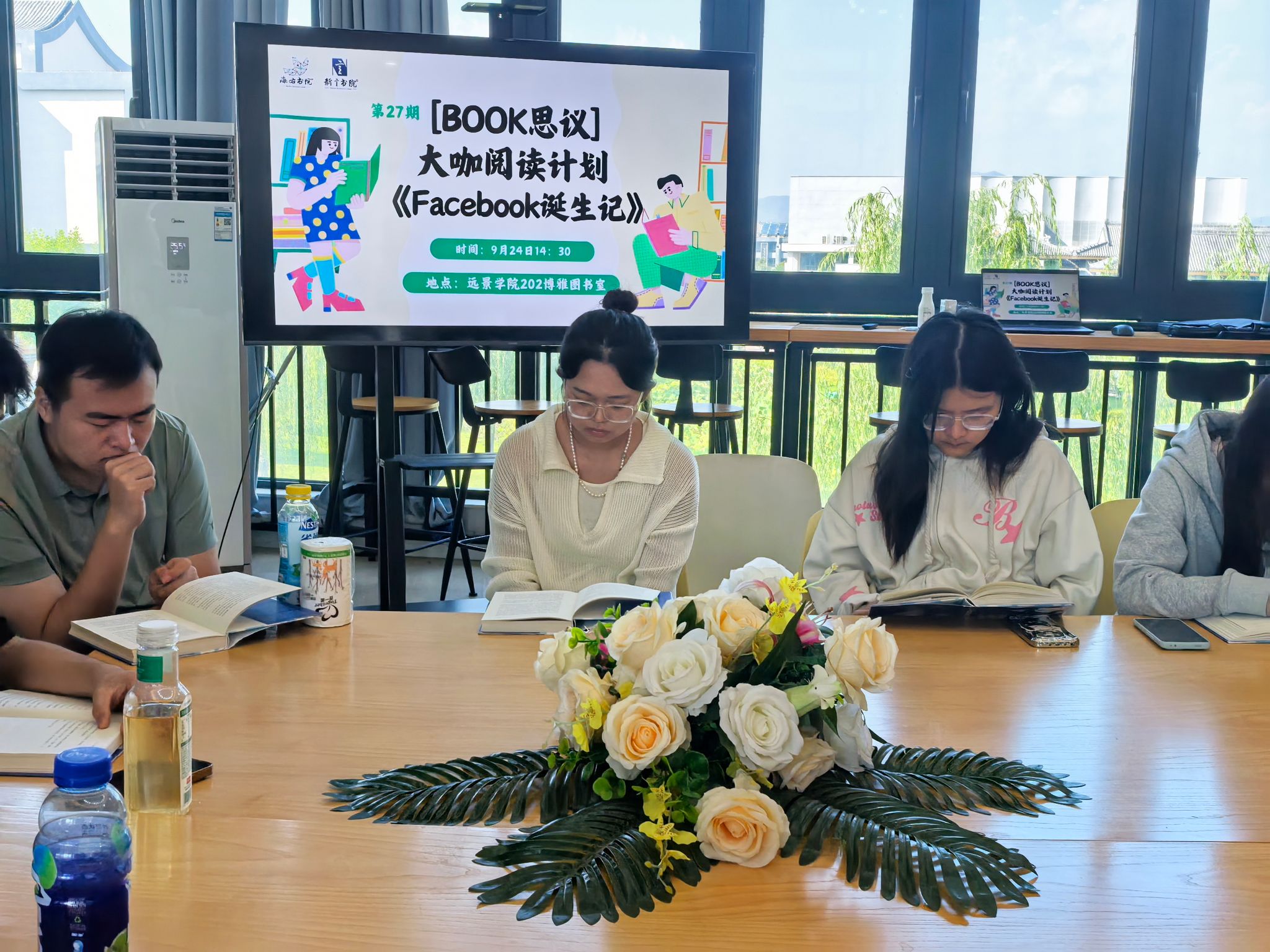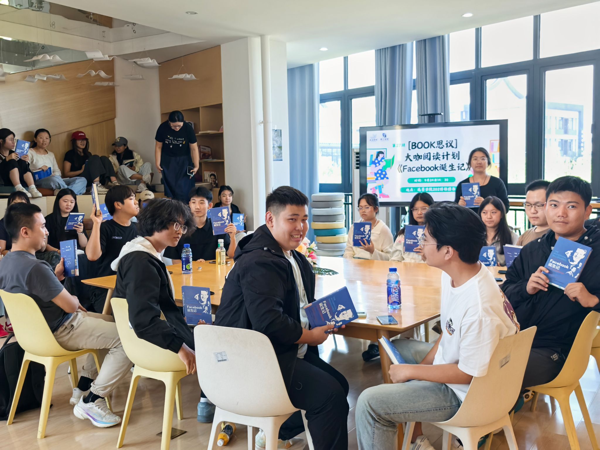 2025年9月24日下午14:30,海右书院联动远景学院,在远景学院202博雅图书室举办“Book思议”大咖阅读第27期活动。本期围绕《Facebook诞生记》,以“创新、协作、成长”为主题,通过师生共读、分享交流、好书推荐等形式,带领同学们走进扎克伯格的创业世界,感受一段从宿舍起步的互联网传奇。