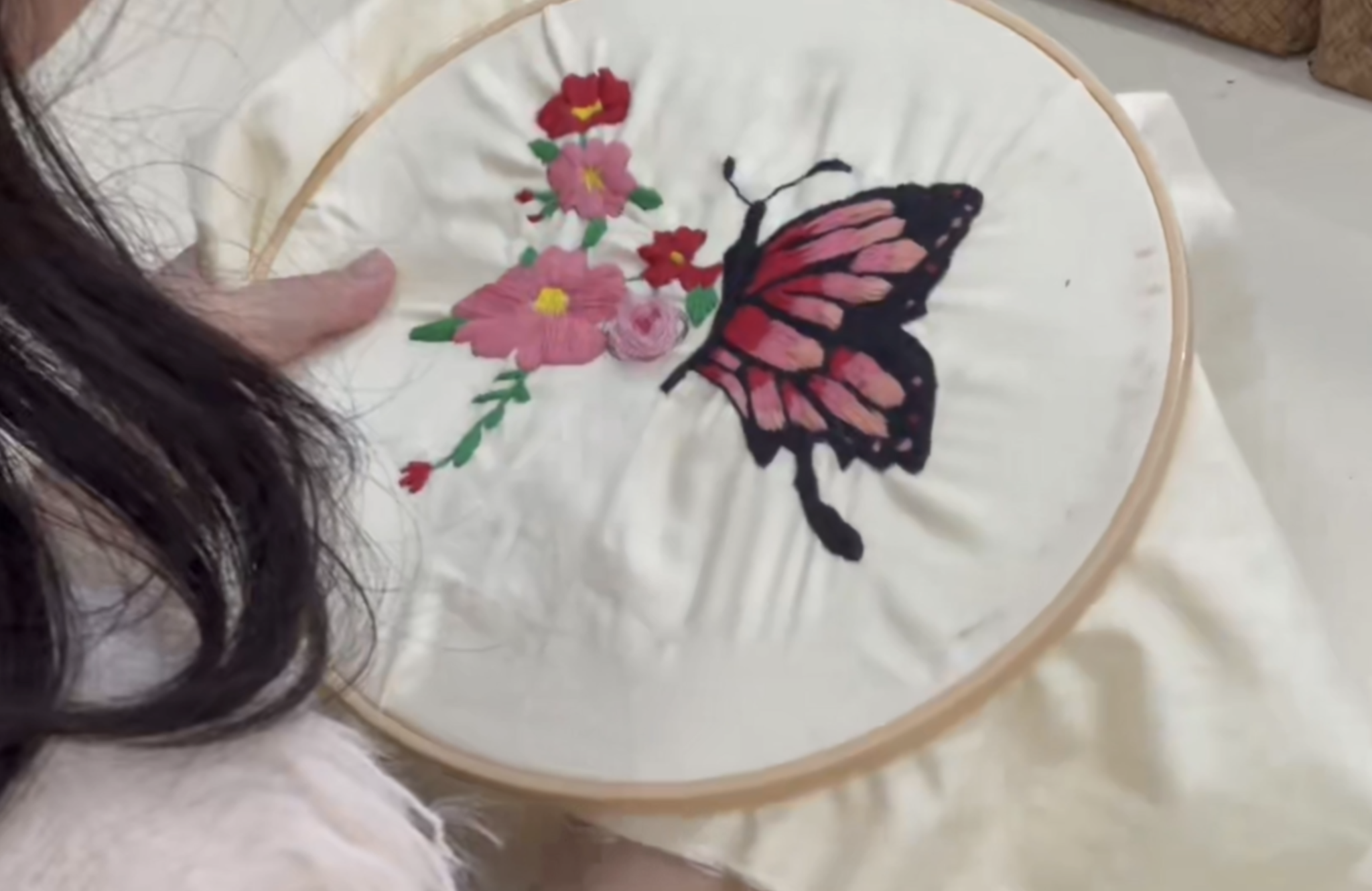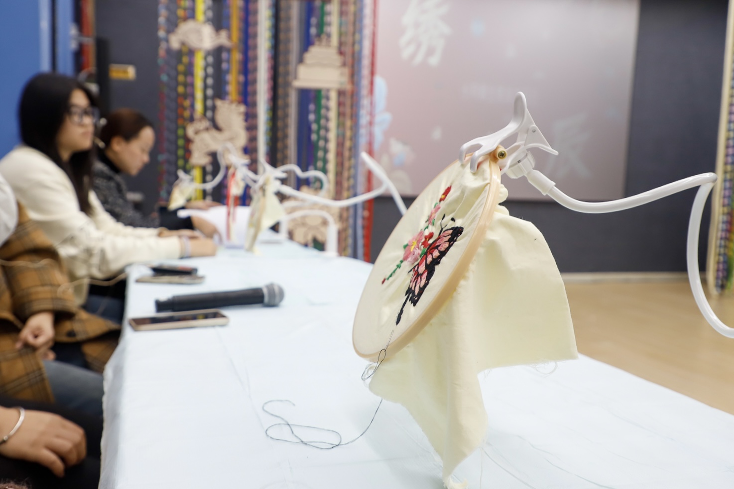 一方素色手帕,半朵牡丹初绽,针脚还带着初学的生涩,却绣进了王晓涵同学(新言书院/大数据学院)整个童年的温度。手帕边缘的丝线意外松脱,在书院的“小泰裁缝铺”里,鲁绣传承基地牛玉叶老师的飞针走线间,残缺处生长出了新的花蔓。王晓涵说:“原来每一处断线,都可以成为新故事的起点。”这份源于修补的感悟,触发了“绣辰”十月师生集体生日会的灵感——在书院这个温暖的“裁缝铺”里,每个年轻人生命中的“脱线”时刻,都将被时光的针脚温柔绣进成长的图谱。