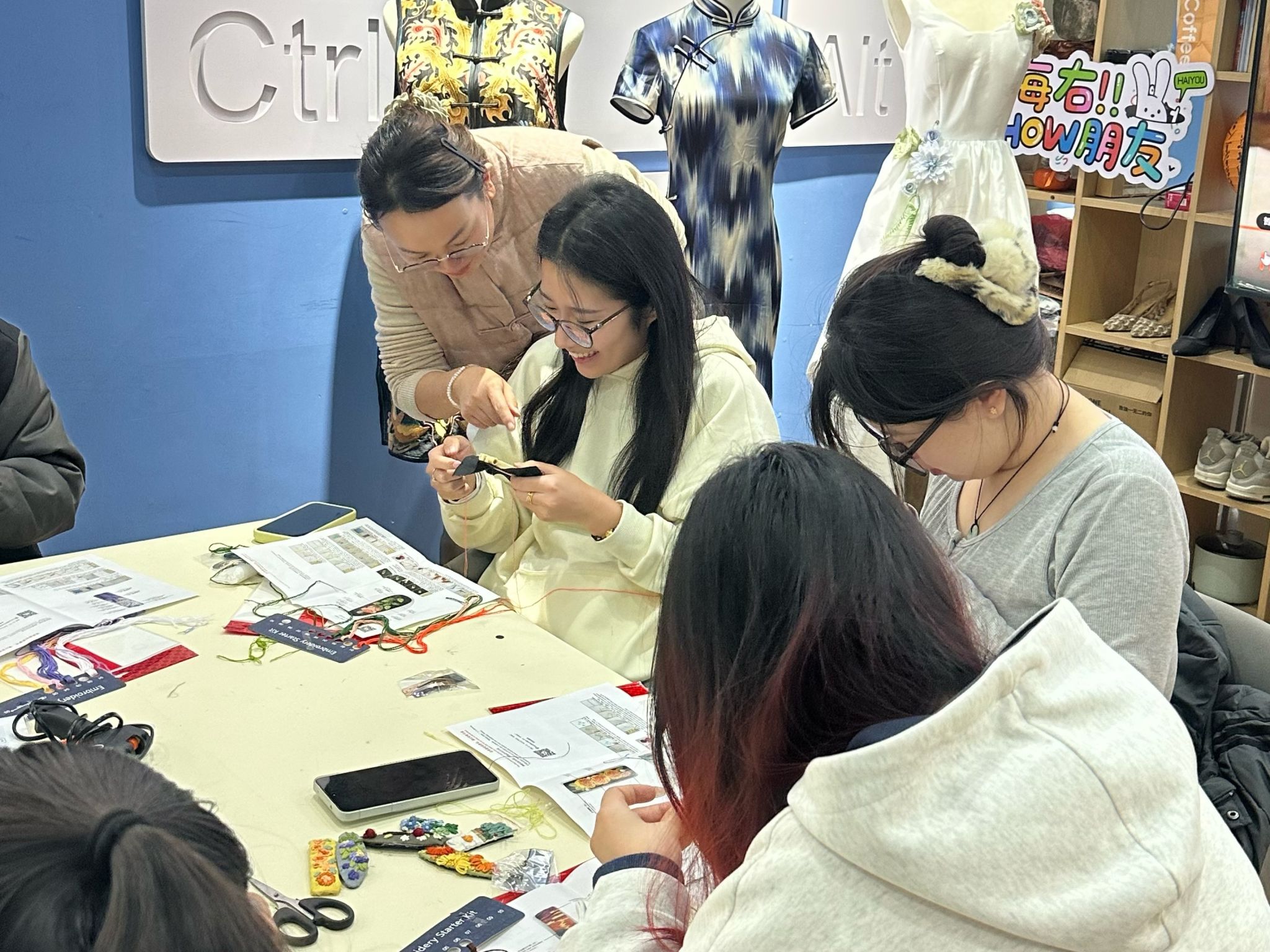 活动中,工坊指导老师王静媛也来到现场,为同学们带来专业细致的指导。她仔细观察大家的操作,针对常见问题如针脚疏密、轮廓清晰度等,亲自示范讲解,并鼓励大家发挥创意,大胆配色。老师的点拨让不少同学豁然开朗,手中的作品也愈发精致动人。