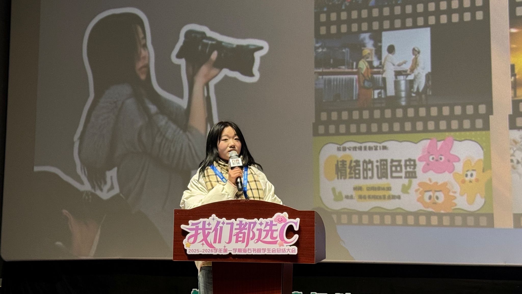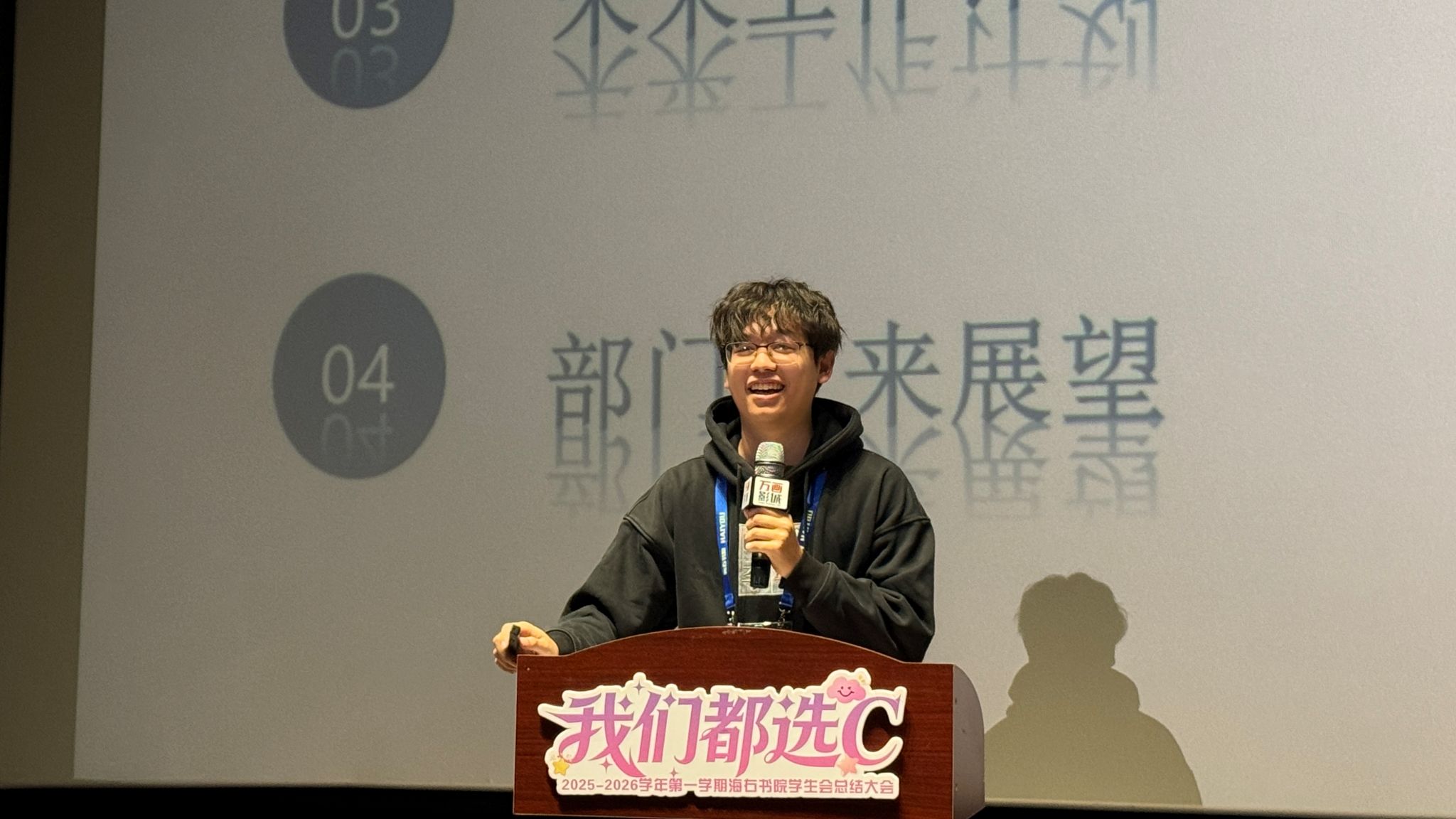 周文燕同学回顾了视觉传达部“用专业视觉语言讲好海右故事”的学期轨迹。从海报设计到视频剪辑,从支持配合到内部提升,她客观总结了在质量把控与团队协作上的进步,也直面了前期沟通不足带来的问题。她的发言指向一个更专业、更高效、沟通更充分的未来,体现了将热爱转化为能够(Can) 的专业追求。
