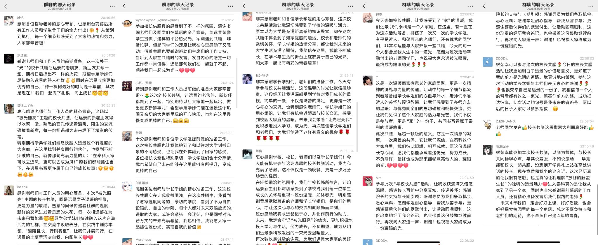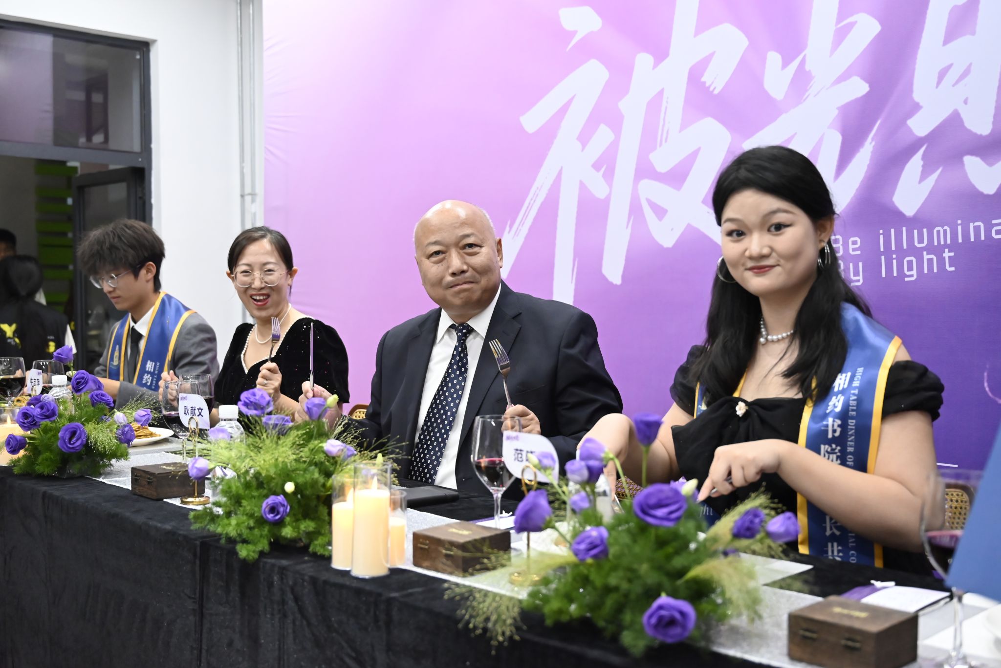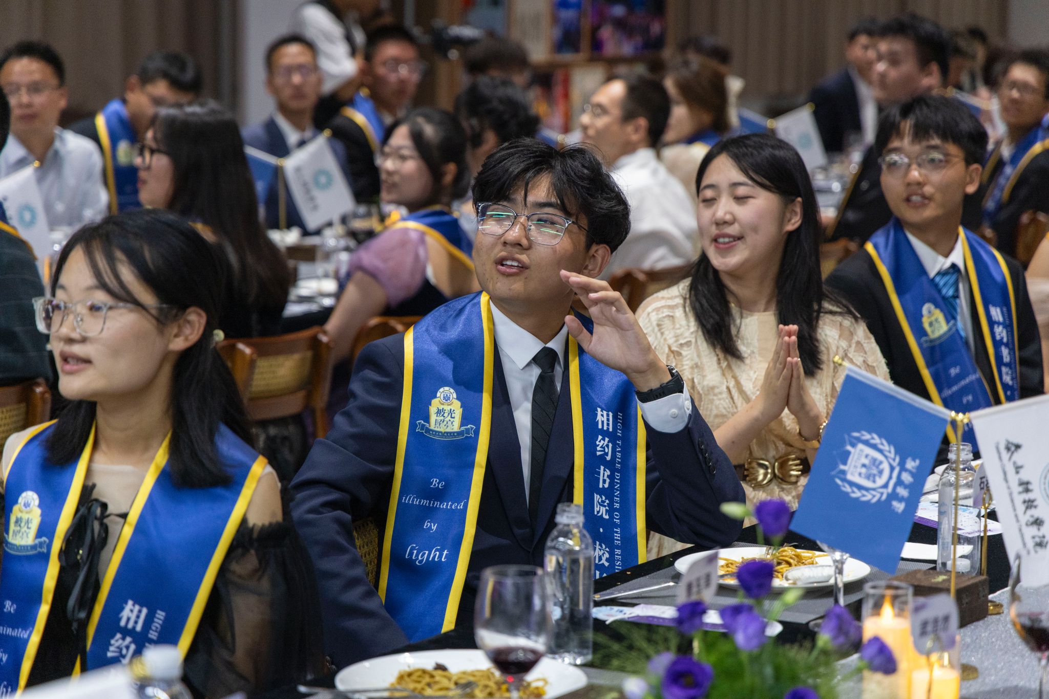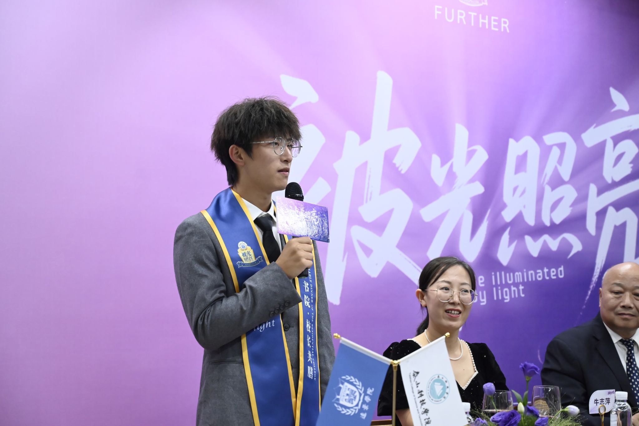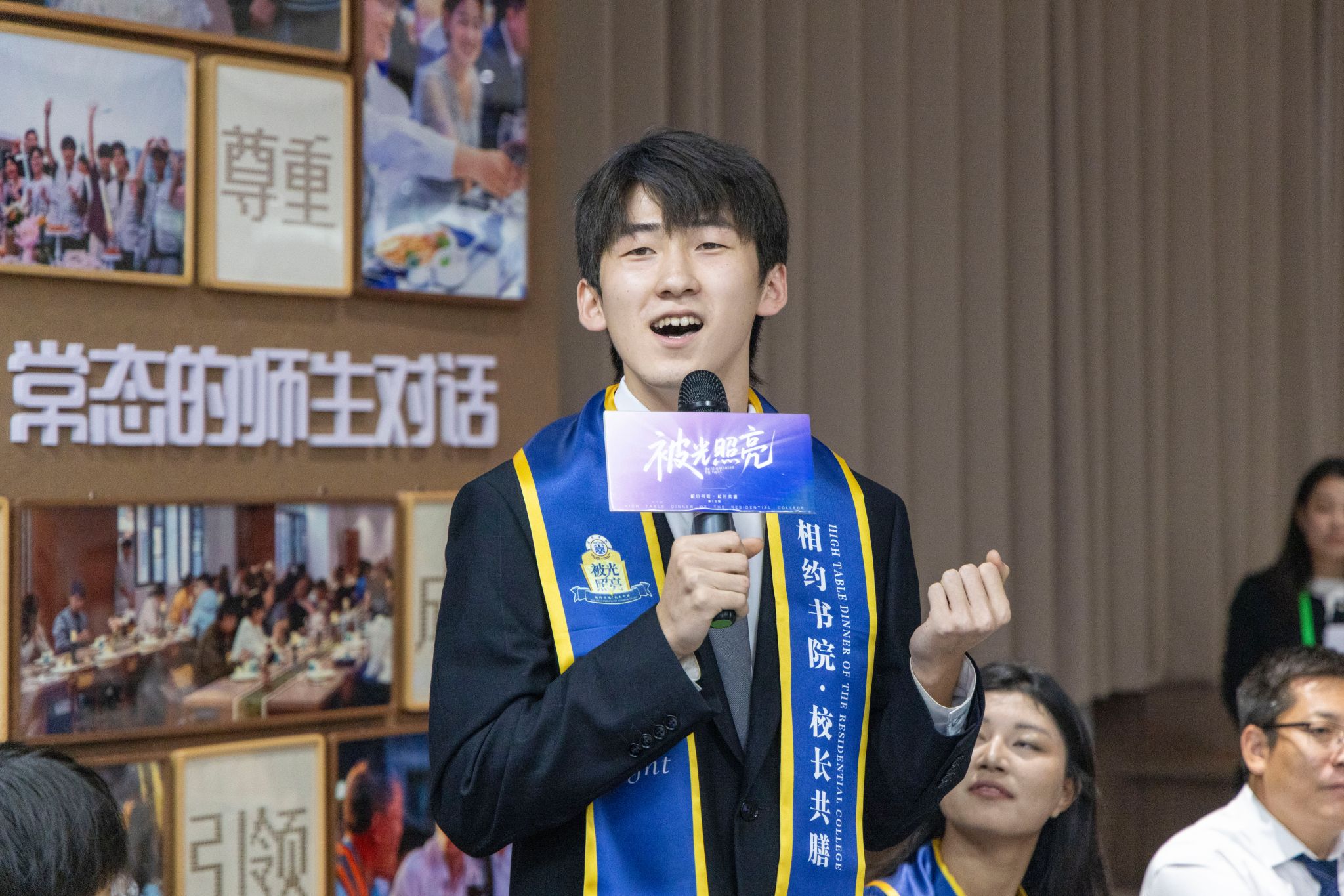 刚才校长亲自给我戴上绶带的时候,很激动,我也拥有和校长的合影了。和老师们一起吃饭聊天,听他们讲自己的故事,也听同学们分享,感觉特别亲切,一点距离都没有。最让我感动的是大家一起朗诵苏轼的《水调歌头》,还有牛院长对我们说“你本身就是光”的那一刻,我突然懂了,这束光不是什么大道理,就是这份实实在在的尊重和信任。