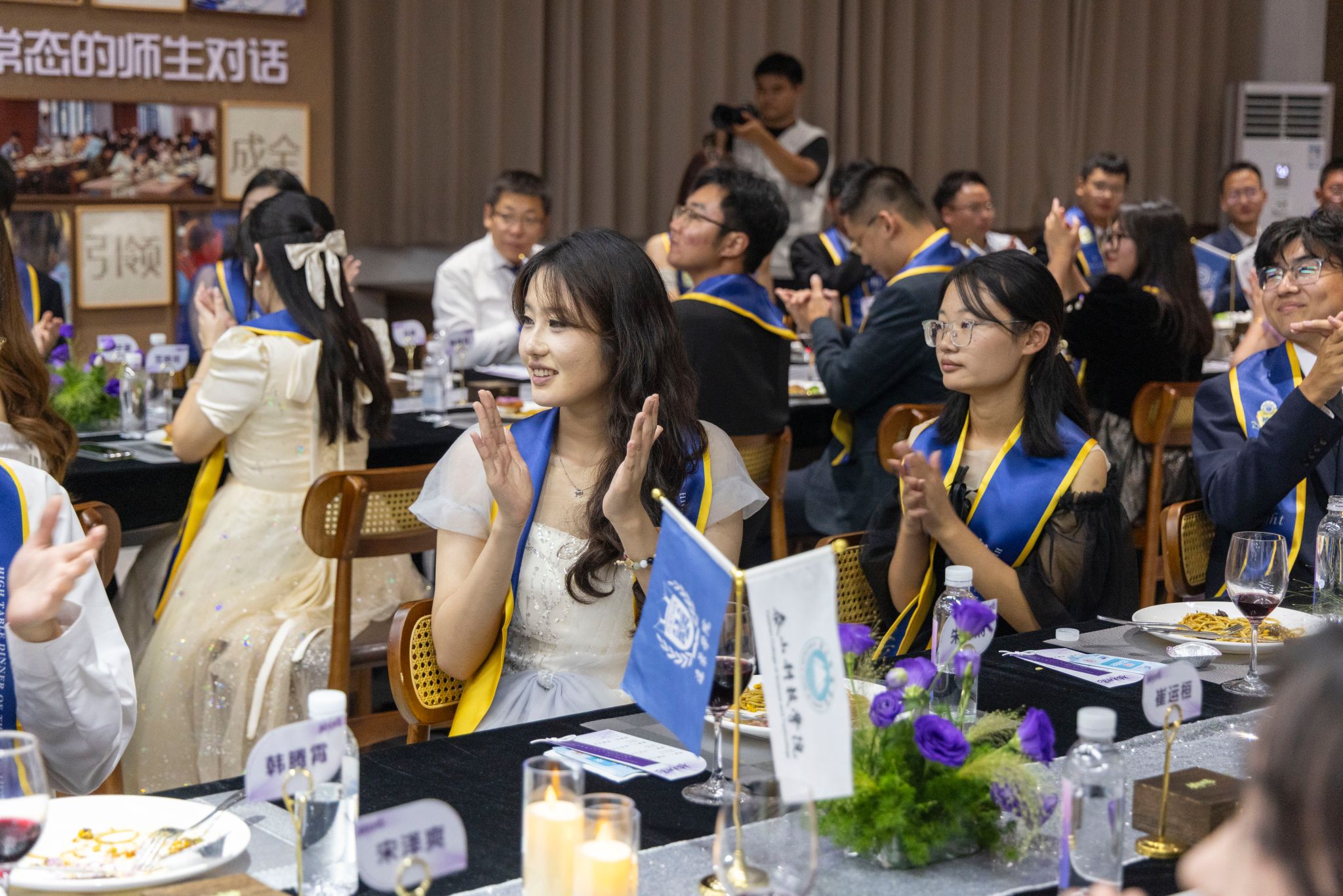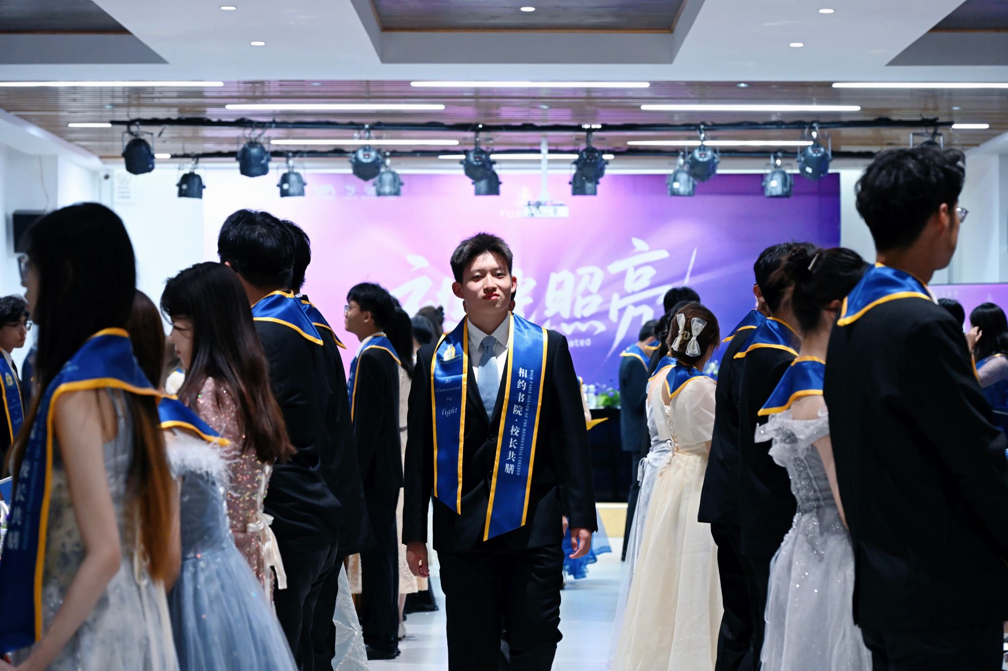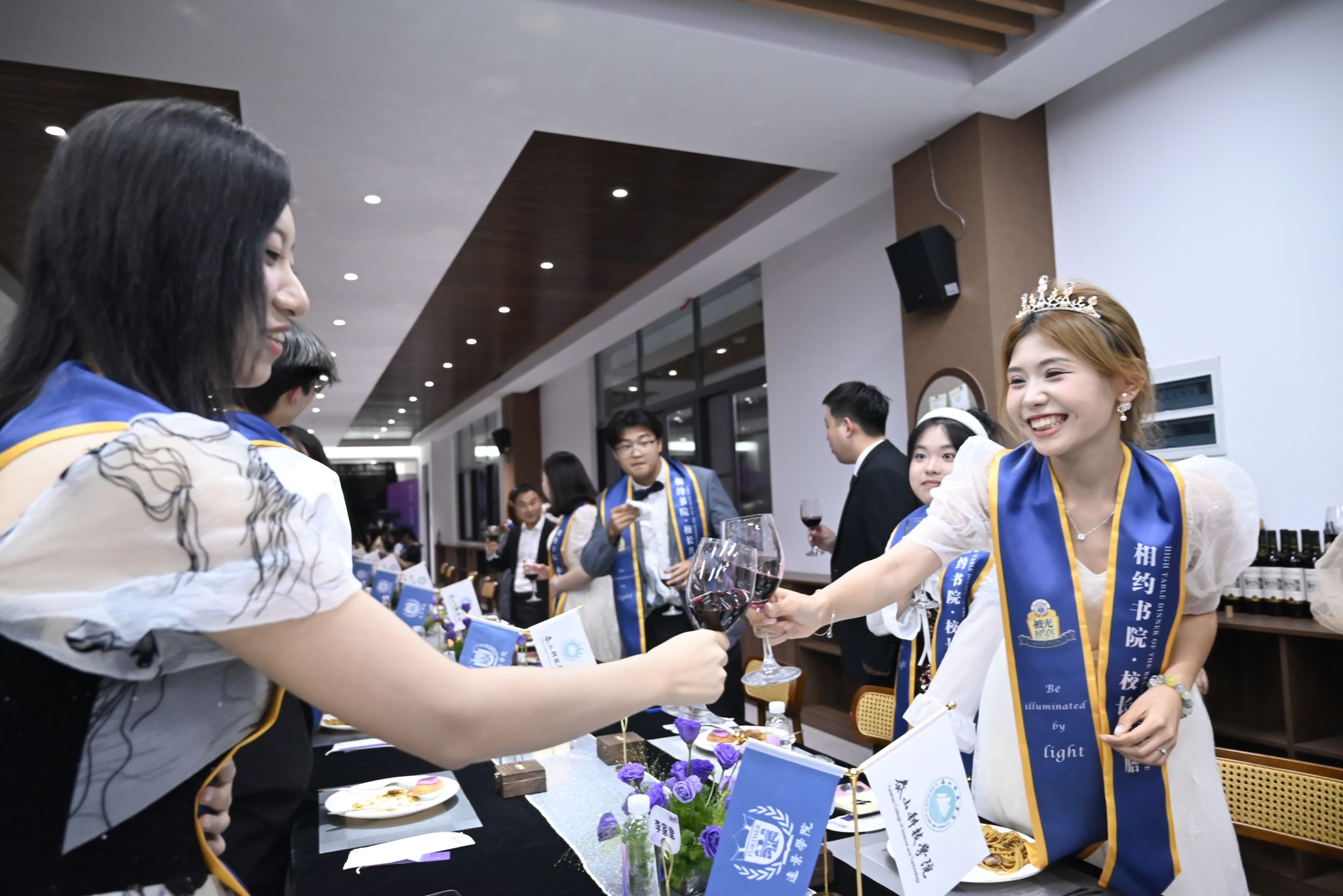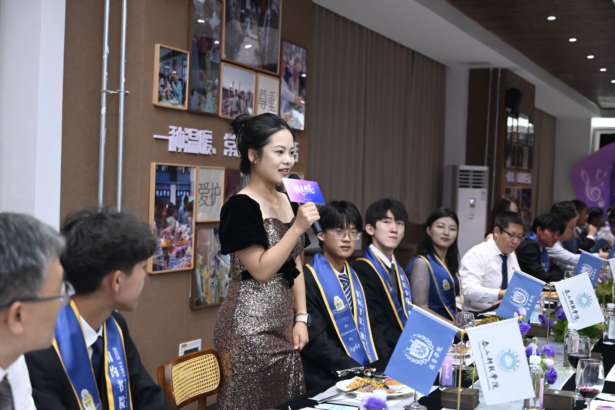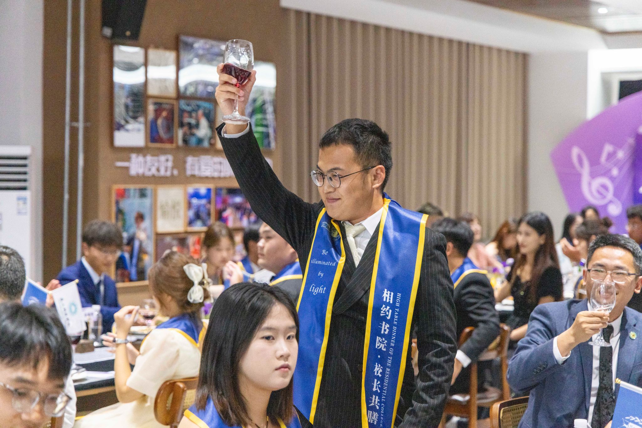 刚才校长亲自给我戴上绶带的时候,很激动,我也拥有和校长的合影了。和老师们一起吃饭聊天,听他们讲自己的故事,也听同学们分享,感觉特别亲切,一点距离都没有。最让我感动的是大家一起朗诵苏轼的《水调歌头》,还有牛院长对我们说“你本身就是光”的那一刻,我突然懂了,这束光不是什么大道理,就是这份实实在在的尊重和信任。