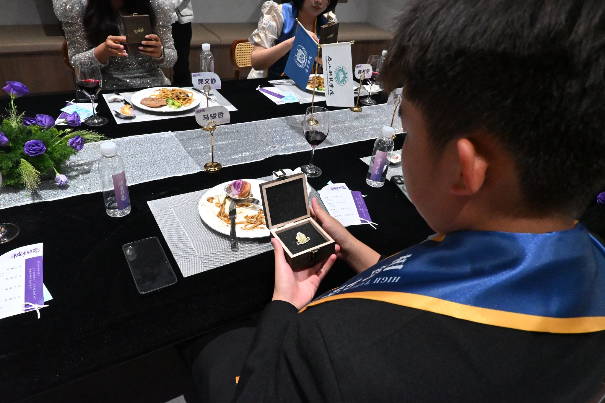 在主持人的引导下,师生共同开启面前的荣誉盒,随着倒数声落,本次校长共膳纪念标识静静呈现,象征着荣耀与归属在此刻定格。这一刻,光不再只是主题,而是信念;不再只是被赠予的明亮,而是从心底生发的力量。光芒绽放,只因你本就是光。