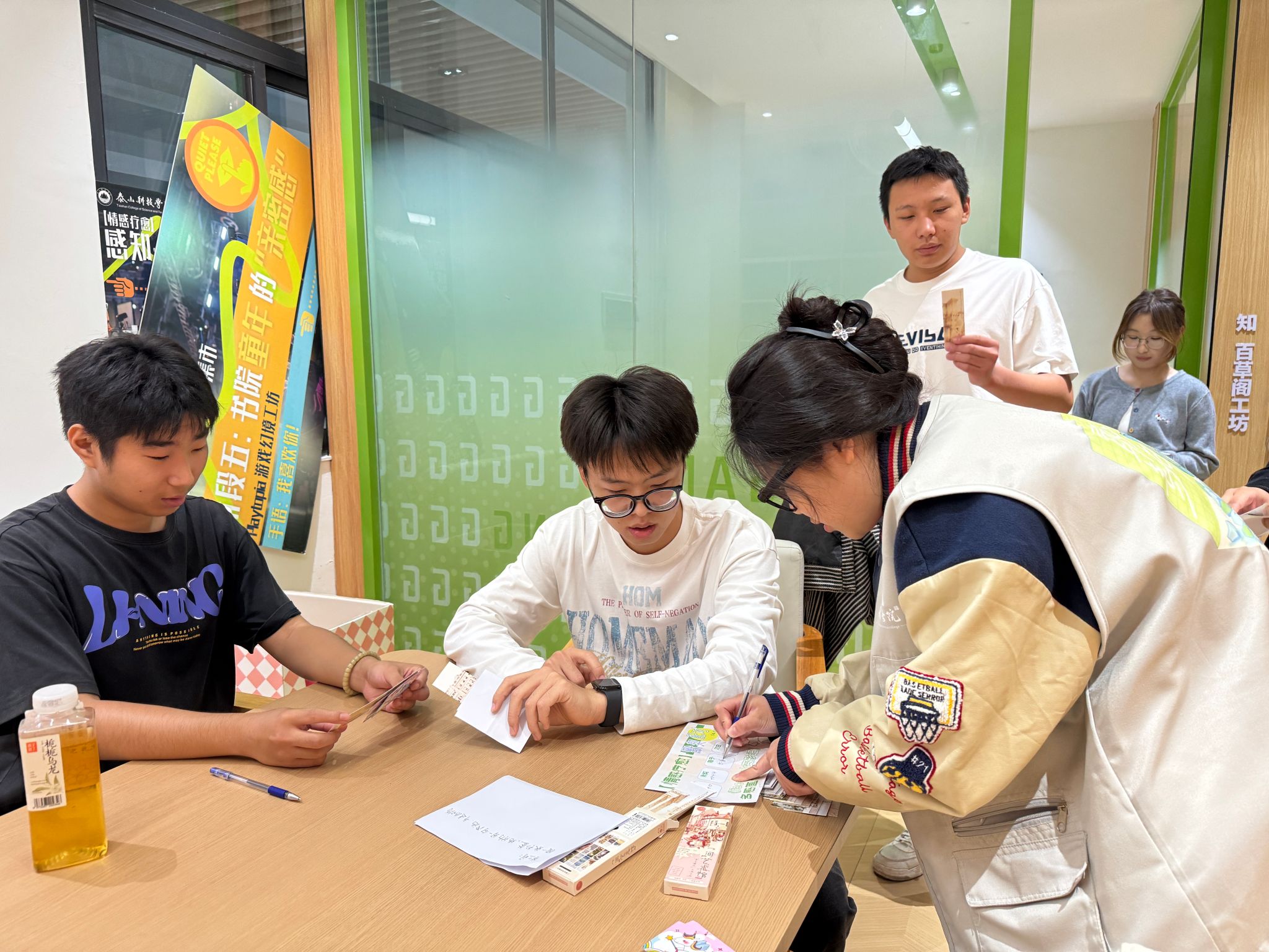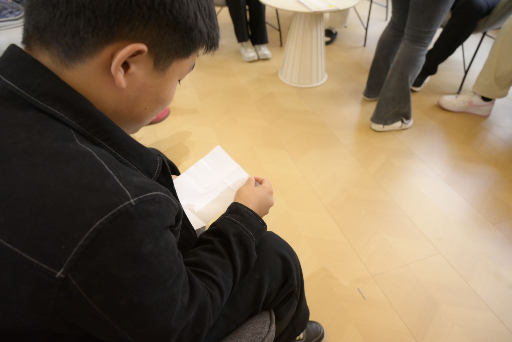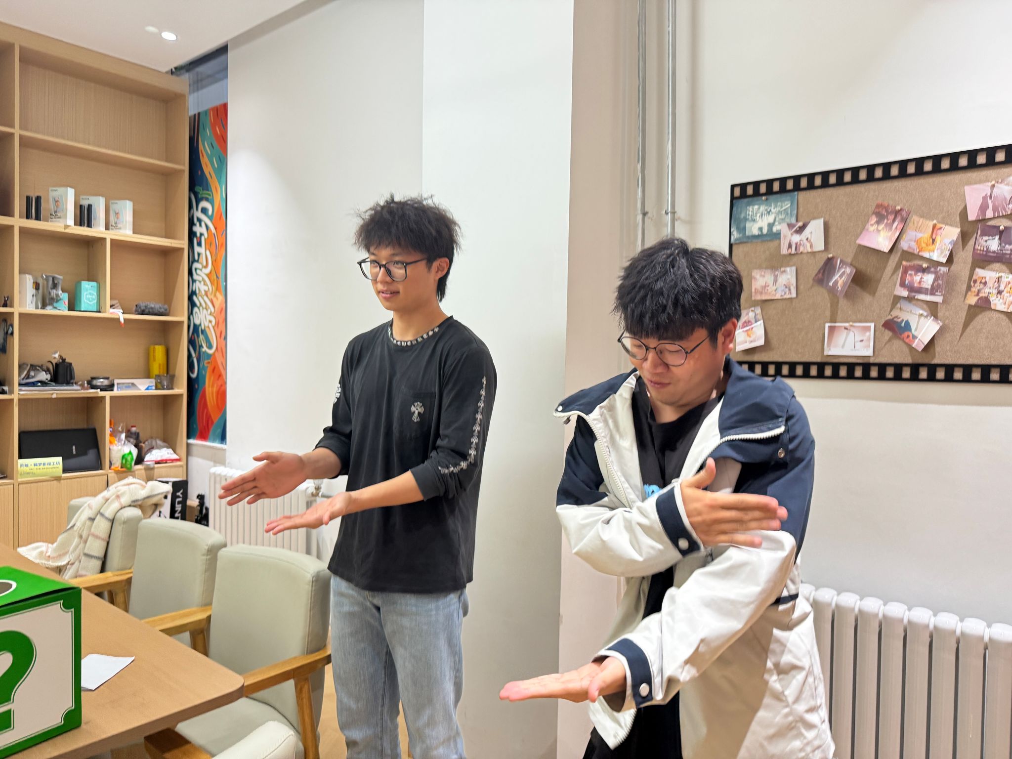 成员们分批进入房间,在工作人员的引导下学习“谢谢”“很高兴认识你”等基础手语,以及《Facebook:关于性、金钱、天才和背叛》等经典书籍书名的手语表达。建筑工程学院/育英书院的李鸿超作为工坊主理人,对这一环节格外关注:“手语的动作很有画面感,比如‘Facebook 诞生记’的手语姿势,让我瞬间记住了这个表达,也让我开始思考,无声世界的人们是如何用这样的‘动作语言’传递信息的。”