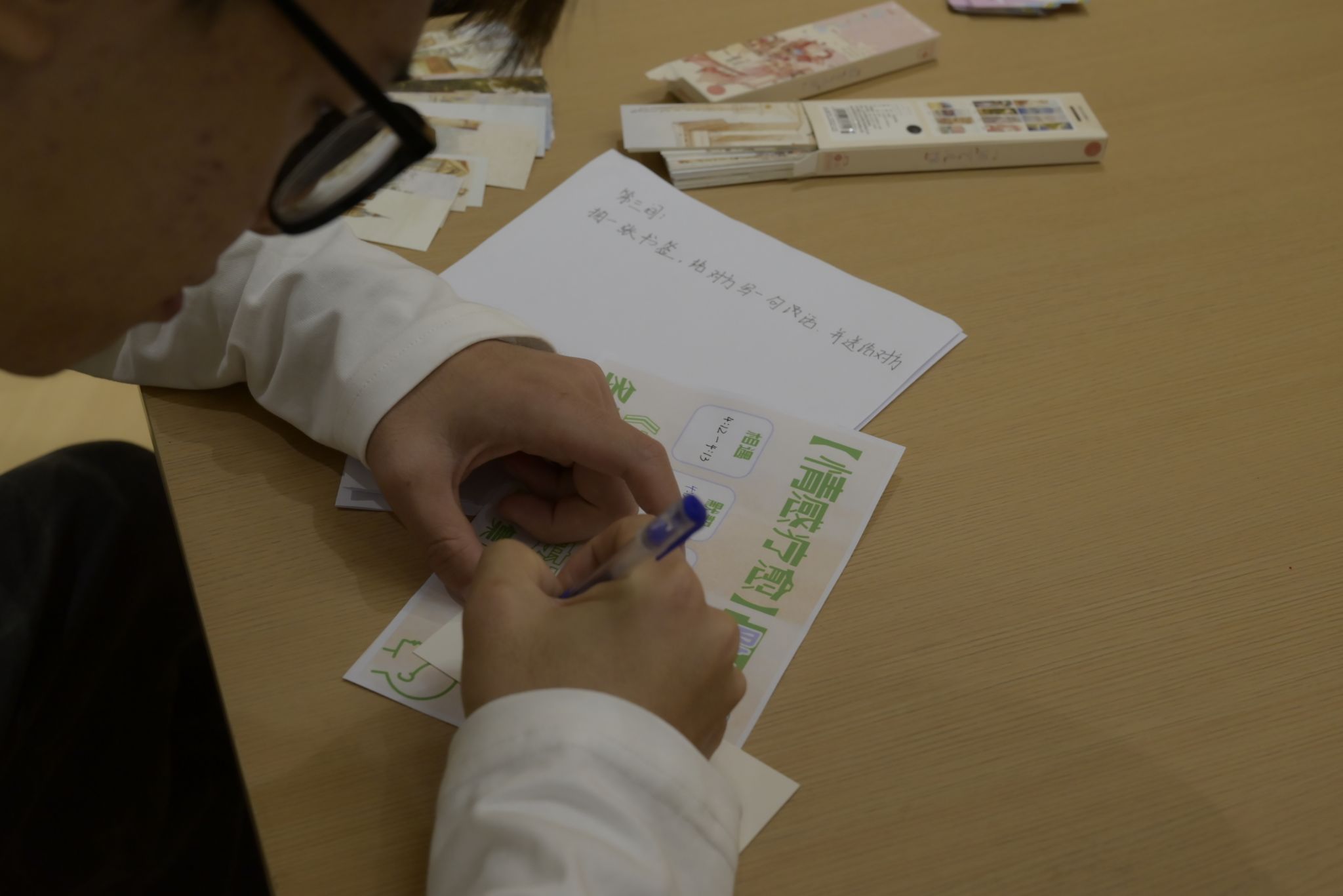 搭档们从众多书签中抽取一枚送给对方,并在书签上写下一句想对彼此说的话。建筑工程学院/育英书院的许浩哲收到搭档的书签时,看到上面写着“你认真的样子很有力量,就像扎克伯格在车库里坚持创业的模样”,瞬间被这份无声的认可打动:“原来不用说话,也能让对方感受到温暖,还能结合书中的故事传递鼓励,太有创意了。”