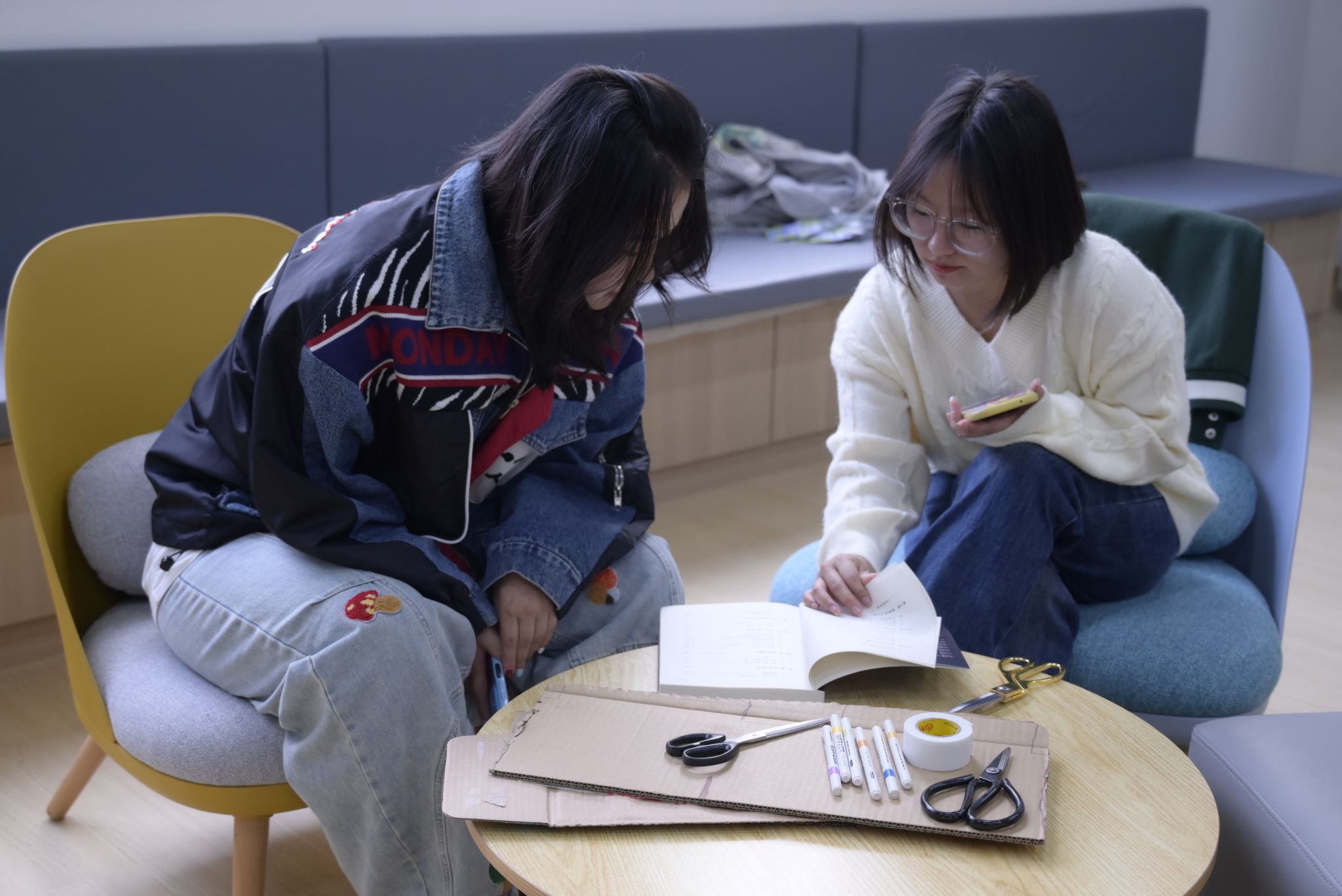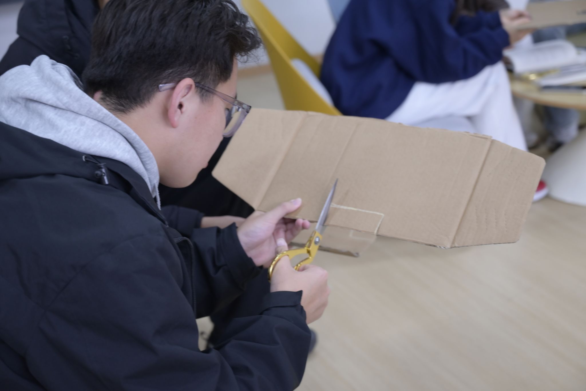 分享环节结束后,环保DIY环节正式拉开序幕。大家纷纷拿出提前准备好的硬纸盒、剪刀、彩笔等材料,脑洞大开各显身手。只见大家或凝神构思,或巧手翻飞,平日里被随手丢弃的快递纸盒,在同学们的奇思妙想与精心改造下,被赋予了全新的生命。“平时拆完快递,硬纸盒大多直接扔掉,没想到还能这样‘变废为宝’。”敢当书院/大数据学院的李奕婷说道。她表示,这个过程不仅锻炼了动手能力,更让她深刻体会到资源循环利用的价值与乐趣。