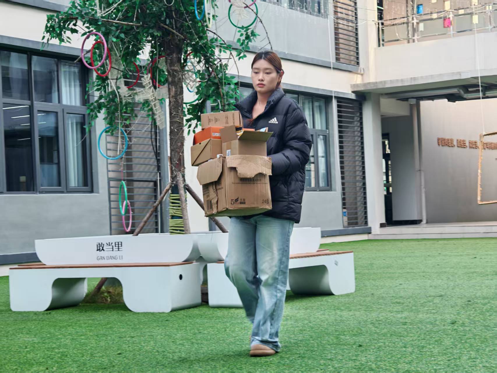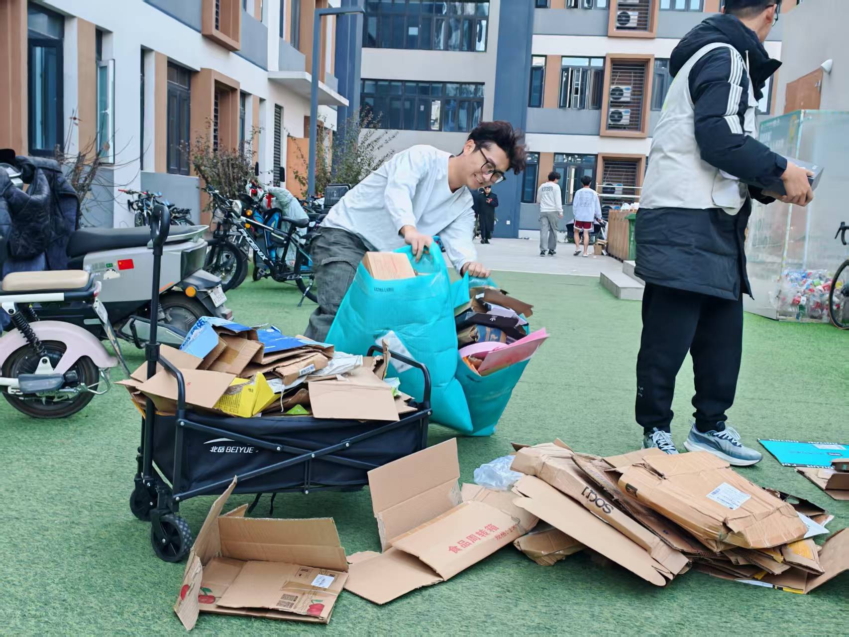 活动当天,工作人员早早布置好回收点位,清晰的分类区域让每件旧物都能“对号入座”。秋意微凉,现场却暖意流动。同学们三两结伴,陆续而来——手捧悉心叠好的旧衣,怀抱码放齐整的纸箱,拎着收集已久的瓶瓶罐罐。他们一步步走向回收点,步履所及,仿佛也正走向一个更绿意盎然的明天。工作人员默契配合,细心分拣、整理、打包,还不忘在同学搬运大件物品时快步上前搭把手。这一递一接之间,流淌的是理解,也是共同为环保出力的温暖。敢当书院/大数据学院的赵凤钏分享道:“知道这些旧物会变成生日会的装饰,感觉特别有意义!既解决了储物难题,又为一场温暖的聚会贡献了力量。”