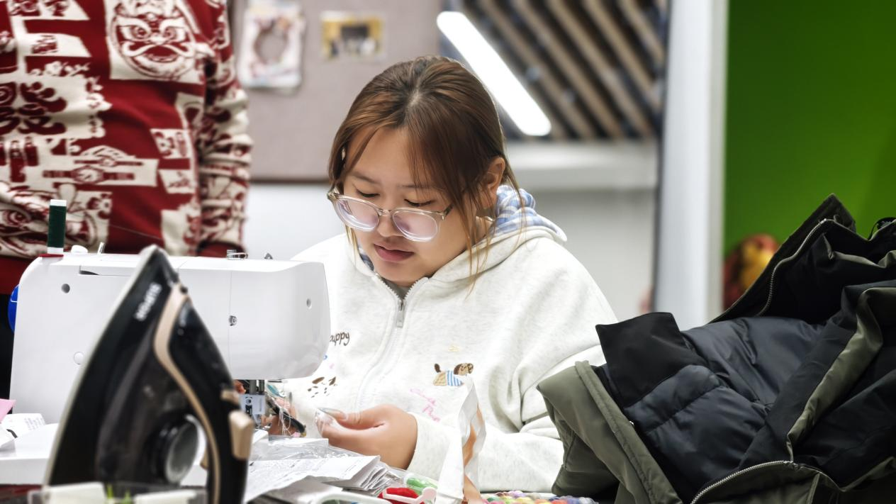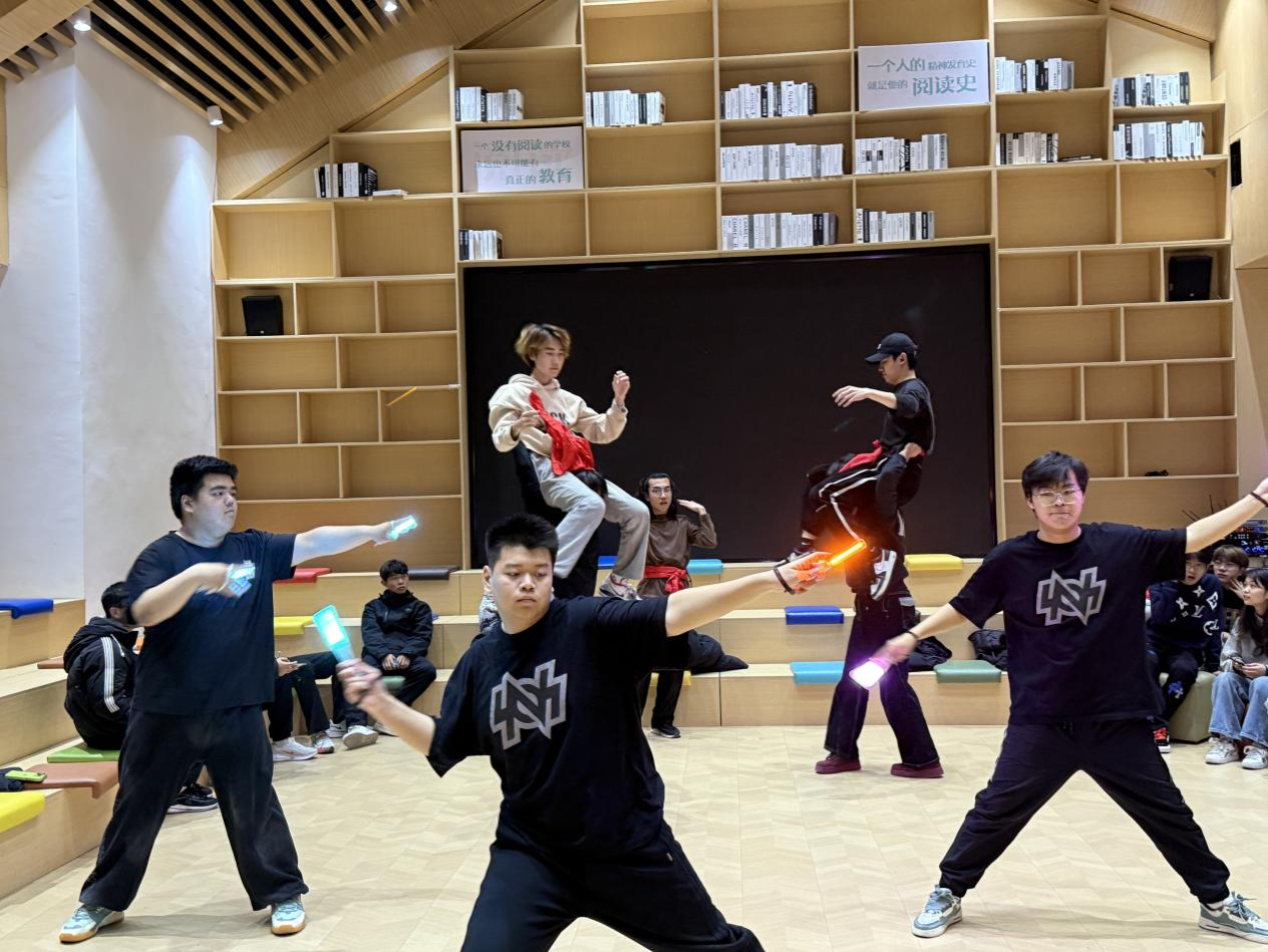 无数个夜晚,书院办公室的灯温柔地亮着。那里没有喧嚣,只有剪刀轻吻纸页的窸窣,胶水缓缓舒展的黏连,彩笔划过表面的低语。重复,却专注得仿佛在触摸时光本身。走秀的背景墙,由十二条旧牛仔裤耐心拼成,每一针都牵着往日生活的记忆与温度;那顶闪烁星光的帽子,缀着几十枚瓶盖,每一枚都曾被谁握在手中,如今在此重逢;而那件线条利落的“西装”,更是经历了数次沉默的拆解与重塑,固执地问:“美,能否从破碎中重生?”