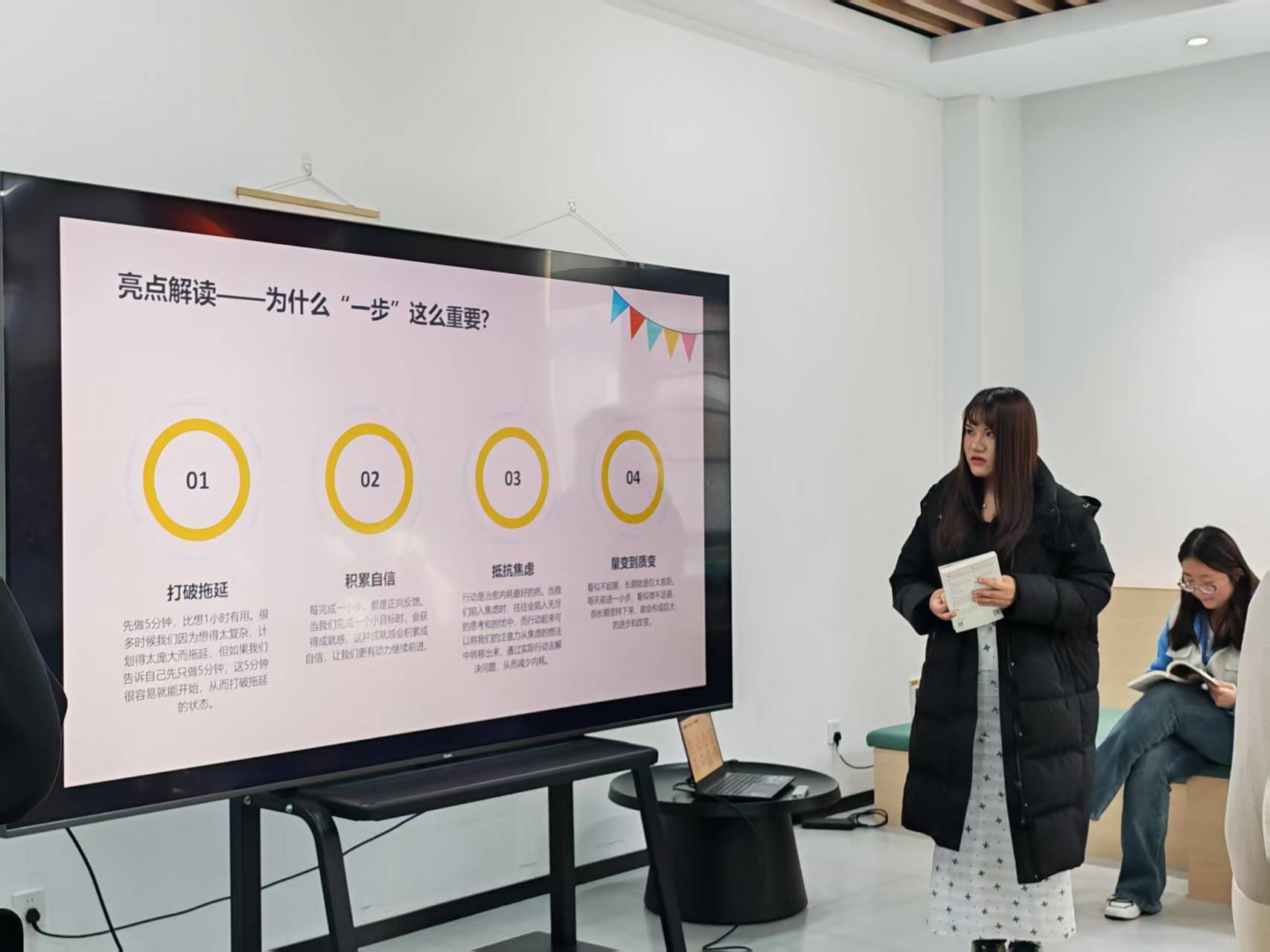 书中“坐上桌子”这一概念让她重新思考自己的角色。她开始主动表达观点、承担组织工作。本学期,她第一次主动申请担任课题组长。