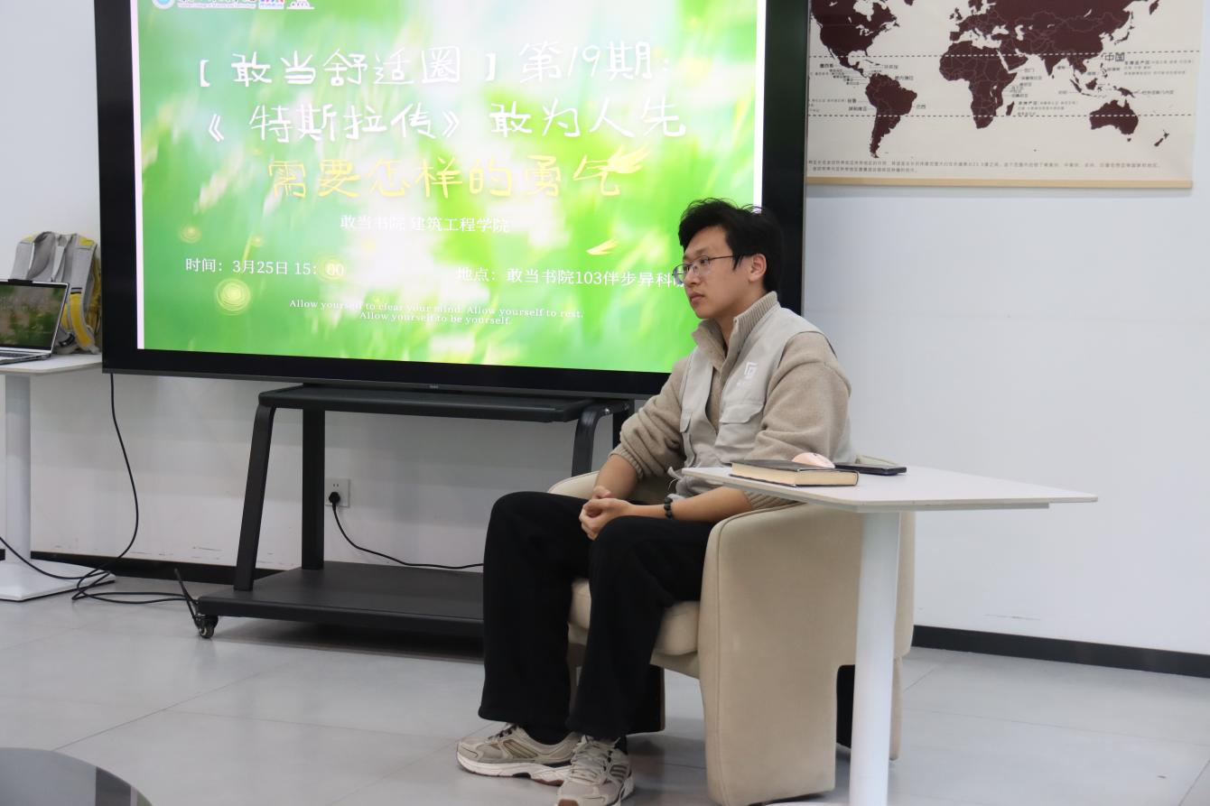 来自敢当书院/建筑工程学院的周瑞雪同学说道:“特斯拉一生几经波折——资金中断、项目搁置、误解与诋毁接踵而至,但他从未停下脚步。上学期我做项目时也卡了很久,同学都劝我换个方向,那段日子确实难熬。但回过头看,那些阻力并没有打倒我,反而让我明白:勇气是面对困难,你依然坚定地选择往前走。能扛住现实的压力,依然坚持自己选择的方向,才是最难得的。”